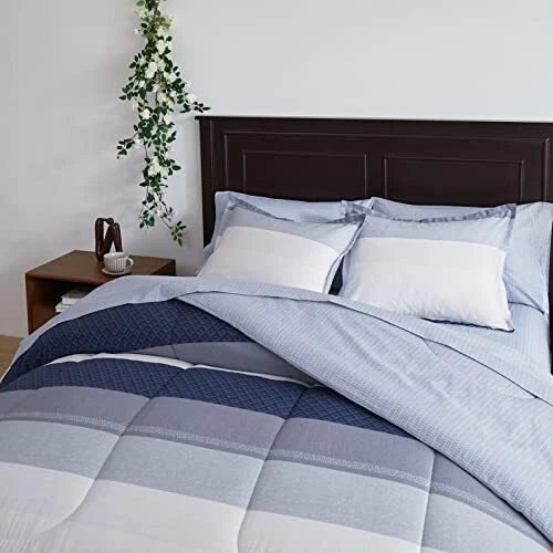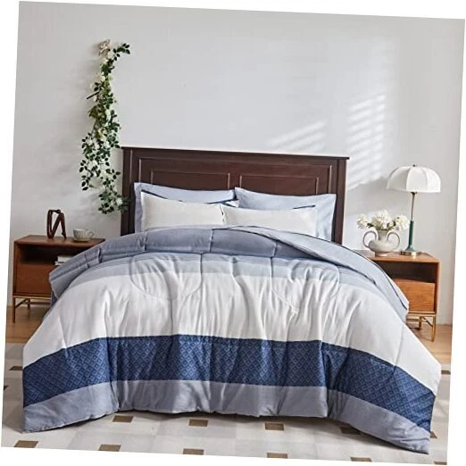 Return Policy Fast Delivery Trusted seller Cotton Striped Comforter Sheet Set Queen Size 7 Pieces Bed in a Bag with Navy White Blue-Gray Stripes Soft Bed Set (1 Comforter 2 Pillow Shams 1 Flat Sheet 1 Fitted Sheet 2 Pillowcases) Product Description Better Cotton Better Sleep: This comforter sheet set is made with 100% Cotton outer fabric. Super soft bed bedding set. Pure Cotton offers the warmth, comfortable breathability and cozy. This kind of fabric is very comfortable and Friendly for most sensitive skin, and can greatly improve your sleeping experience. Nice gift choice for the coming Thanks Giving Day and Christmas WHAT IN THE PACKAGE:7 Pieces Queen Size Bed in a bag including 1 comforter 88”x88”, 2 pillow shams 20”x26”, 1 Queen Fitted Sheet 60" W x 80" L + 12", 1 Queen Flat Sheet 90" W x 102" L, 2 Standard Pillowcases 20" W x 30", The fitted sheet is 12 inch Pocket. Fits mattresses up to 12". Simple Classic Stripes Style: The main color of the comforter is Navy, gray, white, blue stripes with some cube plaid pattern. Great for man women boys teen bedroom. PS: the pillow case was cut randomly, you may get a navy white stripes one or a gray white stripes one. The flat sheet and fitted sheet is light blue design.Very bright for the winter. CUSTOMER SERVICE INCLUDED -- If you have any question about our product, please feel free to contact us on . Uozzi Home will help you in 24h :) Easy Care: Machine washable.No fade, No stain and shrink Dries quick on tumble dry low. Shipping Returns Payment Shipping Shipping is FREE to all addresses other than APO/PO boxes in the lower 48 states. All our stock ships from US-based warehouses. Shipped via USPS or UPS (depending on location and package weight) Unless stated otherwise, all orders will ship within 24-72 hours of your payment being processed. Check our feedback to see the great reviews of FAST shipping we offer. Returns Seller does not accept returns Payment We currently accept payment via eBay managed payments only. Once payment is cleared, we will dispatch your shipment within 1-3 business days. Please refer to the "Shipping" tab for more information regarding shipping speed to your destination.
