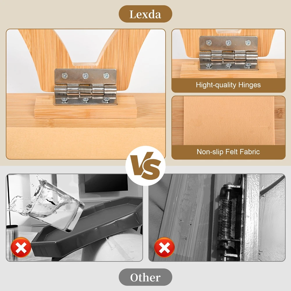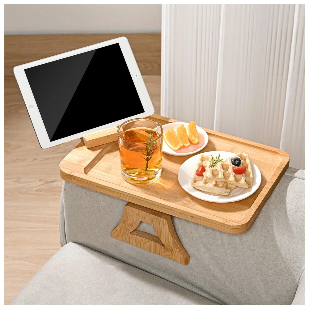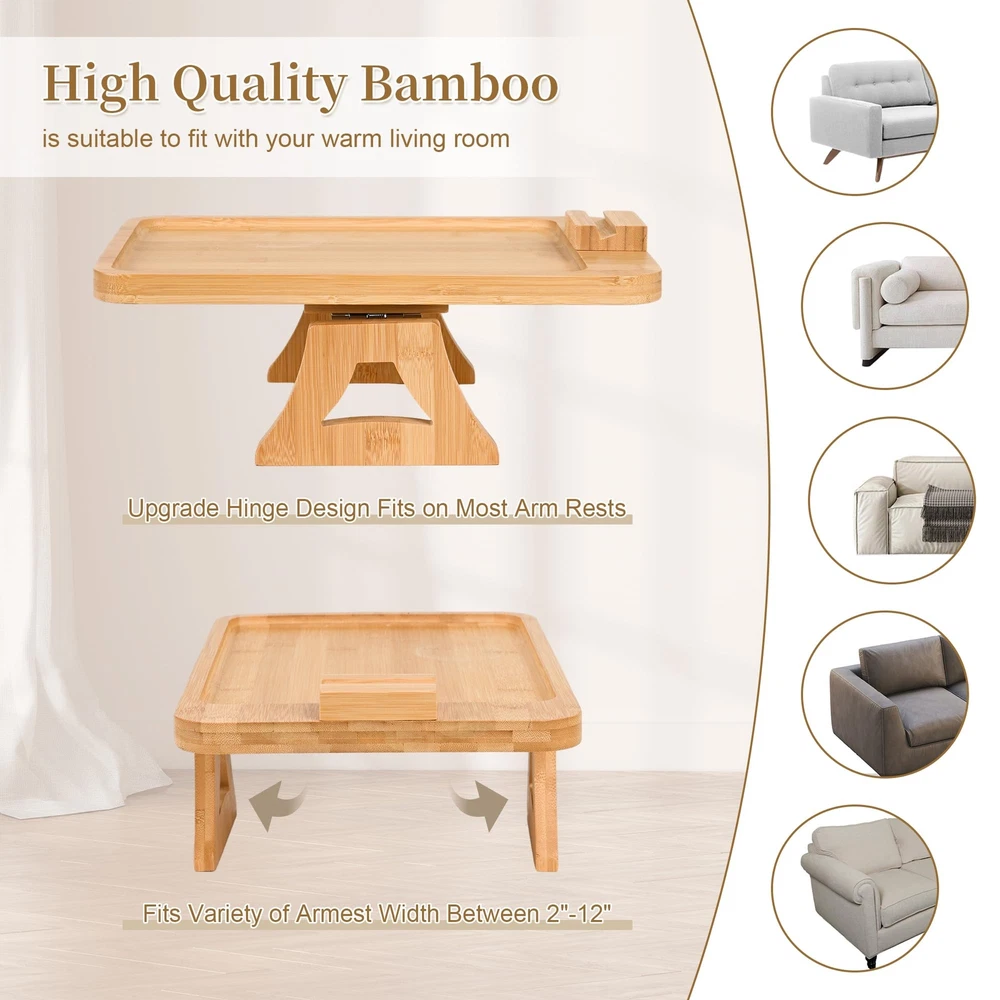 【Multi-functional Couch Arm Table】The couch arm tray is convenient for remote control, drinks, snacks, phones, etc, which is very suitable for people who do not want to move around. 【Natural Bamboo sofa Table】Made from 100% natural bamboo and wood, stylish and visually appealing bamboo panels complement almost any interior decoration. Coupled with a protective coating, it is waterproof and easy to clean. 【Super stable】This sofa table has two armrests at the bottom composed of high quality hinges and non-slip silicone at the bottom, ensuring stability during use and not easy to shake. Double protection ensures that drinks can be safely placed on the sofa table. 【360° Rotating Stand】This sofa armrest tray with features 360° rotating stand that allows you to watch videos from all angles on your phone and tablet, enhancing the usefulness of this sofa table tray. 【Item Dimensions】14.96(L)x 9.84(W)x 2.5 folded /5.3 unfolded (H) inches, suitable for sofa armrest widths between 2-12 inches. When not in use, it can be stored under the sofa or in a 2.5-inch drawer