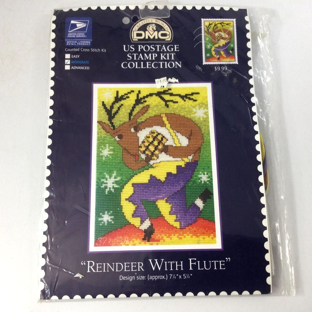 Counted Cross Stitch US Postage Stamp Kit Collection Reindeer with Flute 7 x 5