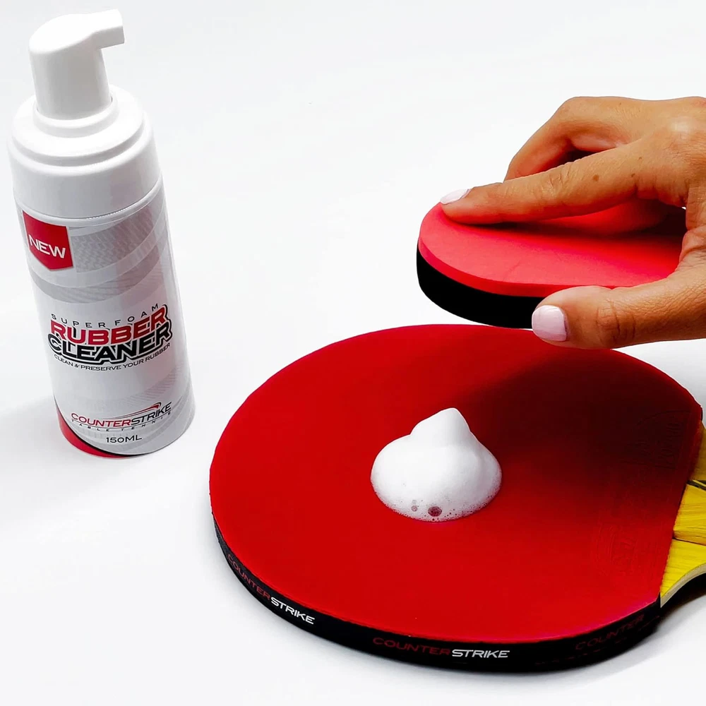 CLEAN AND PRESERVE YOUR TABLE TENNIS PADDLE - Includes: Foam Rubber Cleaner, Cleaning Sponge, & Carrying Bag! TABLE TENNIS PADDLE CLEANER - CounterStrike Super Foam Rubber Cleaner uses a Proprietary Formula that Cleans, Preserves, and Rejuvenates Table Tennis Rubbers. PING PONG PADDLE FOAM CLEANER SPONGE - The two sided cleaning sponge removes dirt and dust with one side and wipes the excess cleaner away with the other. INCLUDES CARRYING BAG - Our ping pong paddle cleaner also includes a carrying bag so that you can neatly pack your cleaning kit away. EASY TO USE - Based on how dirty your paddle is, use half-to-one pump of cleaning foam per rubber sheet before and after you play a match. CounterStrike Super Foam Rubber Cleaner uses a Proprietary Formula that Cleans, Preserves, and Rejuvenates Table Tennis Rubbers. You purchased the perfect rubber to fit your game, why not make it last as long as possible by using one of the best rubber cleaners in the industry!? CounterStrike Super Foam Rubber Cleaner will rejuvenate the rubber to its natural tacky state by removing oil and dirt from the rubber surface by using before and after every match. Our two sided cleaning sponge comes with one side that is soft and absorbent to clean your rubber while the other side of the sponge is very dense and acts as a squeegee to remove the spent foam when you have completed cleaning. Depending on how dirty your rubber is, use between half a pump to one pump of foam per sheet. In doing so you will be able to greatly increase the longevity of your rubber, making it a perfect addition to your table tennis gear! Here at CounterStrike Table Tennis, we take our testing process extremely seriously. Each product is reviewed by our testing team for a minimum of 10 weeks. They are studied in both game-like scenarios as well as relentlessly tested with a table tennis robot in order to ensure consistent results. Whether you call the sport Table Tennis or Ping Pong, CounterStrike does not believe in gimmicks or fake technology. Like our customers, we understand that no product can do it all. We take pride in breaking down every aspect you want to know about each of our products. We will tell you where our products are most proficient as well as what our products are not made for. We give you as much information as possible so that you can make the most informed decision possible. We definitely don???t want to ship you something that wouldn???t fit your game or play style. At CounterStrike we pride ourselves in product design and our in-depth testing process.