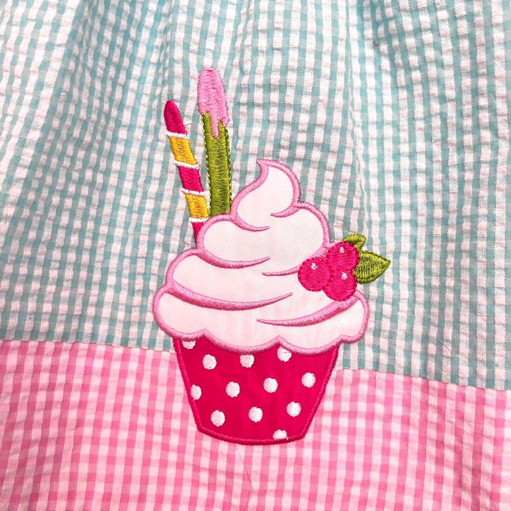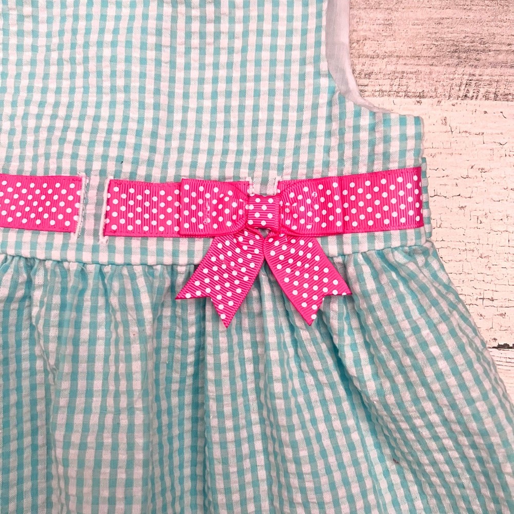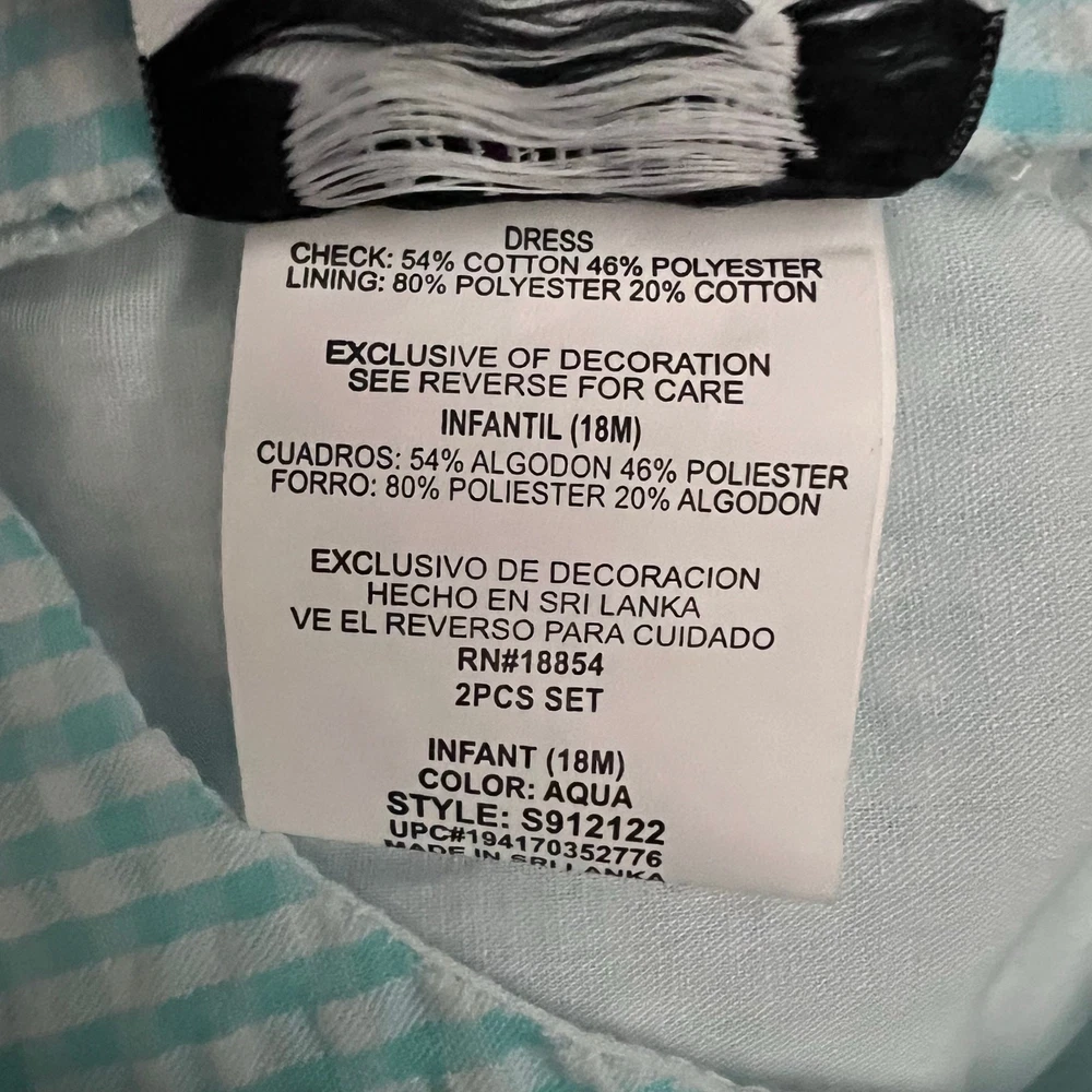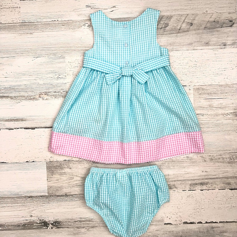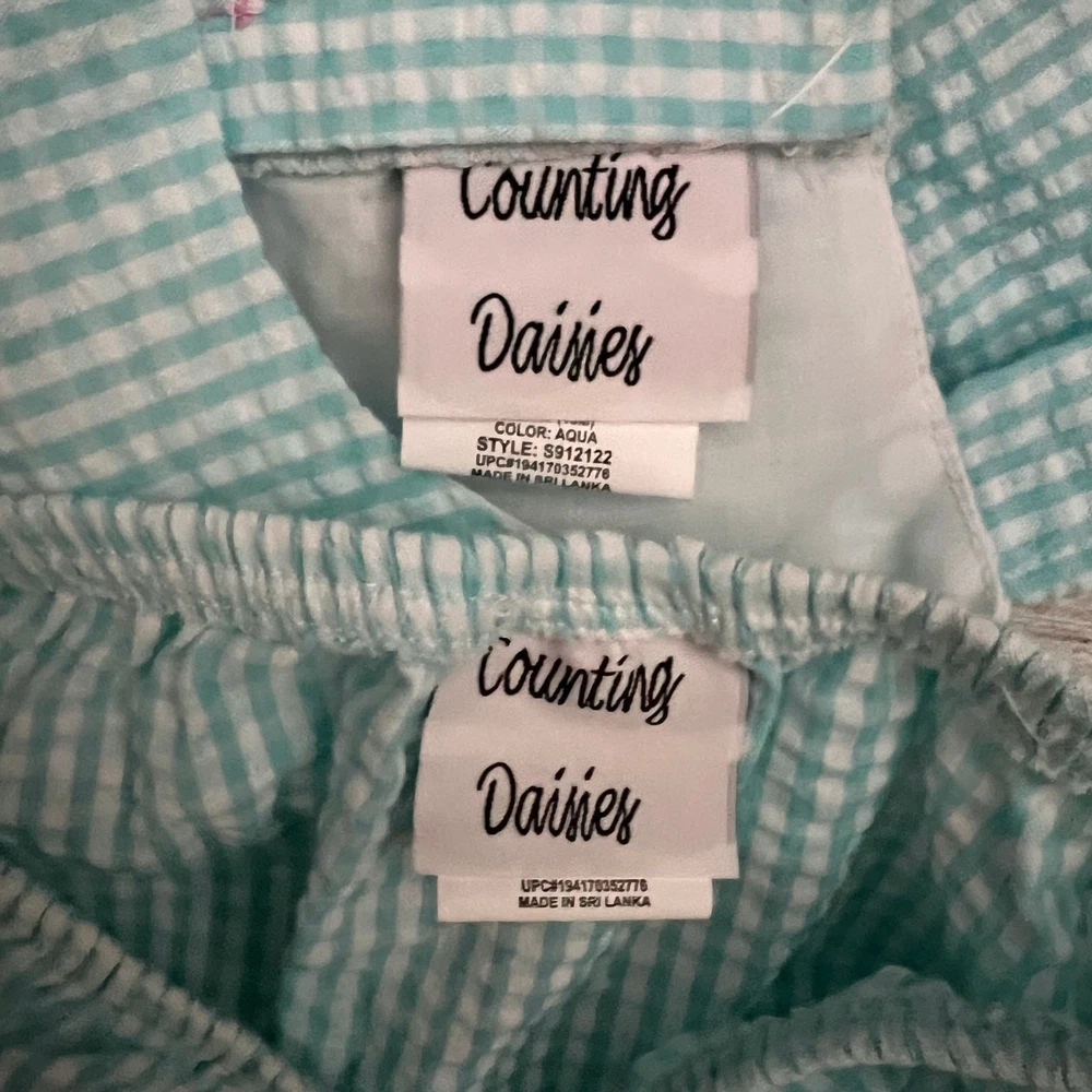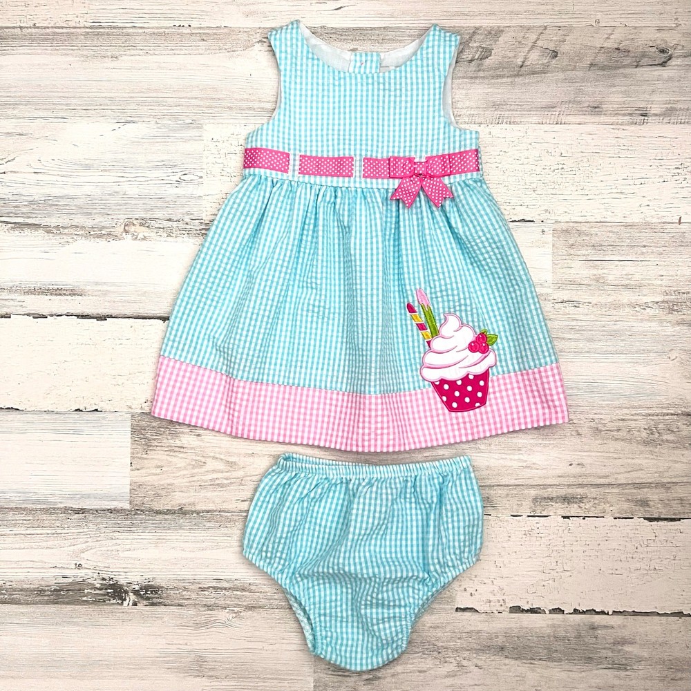 Sweet and playful Counting Daisies baby girl dress set made from lightweight gingham seersucker fabric. Features a cupcake appliqué, pink ribbon waist bow, and matching bloomers for a complete warm-weather outfit. Styling suggestion: Pair with white sandals and a sunhat for birthdays, parties, or sunny day outings. Details: • Brand: Counting Daisies • Size: 18 Months • Color: Aqua, white, pink • Material: 54% Cotton, 46% Polyester • Style: Dress and bloomers set • Features: Cupcake appliqué, gingham seersucker, pink ribbon bow, bloomers included • Neckline: Round • Sleeve: Sleeveless • Closure: Button back with tie • Dress length: Above knee • Fit: Regular • Pattern: Gingham • Occasion: Birthday, party, everyday • Season: Spring, Summer • Condition: Excellent like new condition. No flaws. Keywords: cupcake, gingham, seersucker, birthday, party, summer, bow, outfit, bloomers Ships fast from a U.S. seller. Clean, smoke-free, pet-friendly home. Bundle to save!
