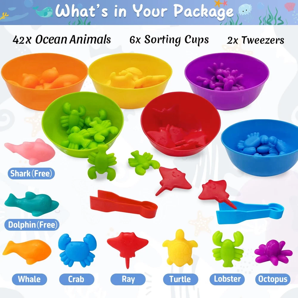 Counting Ocean Animals Matching Game Color Sorting Toys with Sorting Bowls Montessori STEM Color Classification Sensory Training Early Educational Preschool Learning Toy Gift for Toddlers Kids 3 4 5 Early Educational Math Toys for Girls & Boys 3 Years+ ● The Counting Toys are learning tools that can bring fun to children, allowing children to master the skills of counting, color sorting, storage and hand-eye coordination. ● The Counting Toys are games that require concentration and thinking skills that encourage kids to use their brains, build their confidence and enhance sensory ability and creativity. ● Suitable for toddlers from 3 to 6 years old, this toy is a great educational tool for home study and kindergarten. Product Details: Non-toxic tasteless material Pick up easily develop fine motor skills Strong, sturdy and washable Bright color Specifications: Brand: 100% Brand New Type: Counting Toys Product Category: Ocean Animals Color Sorting Bucket Size: 6.3*3.74 inch Bowl Size: 3.22*1.57 inch Tweezers Size: 3.74*0.9 inch Suitable Age: 3 Years+ We have these valued decorations in this package: 56* Ocean Animal Counter Toys (7 Crab, 7 Lobster, 7 Turtle, 7 Ray, 7 Octopus, 7 Dolphin, 7 Shark, 7 Whale) 6* Sorting Bowls 2* Tweezers Customer Service: If there is any problem of our product, you can click “seller contact” button in your Amazon account to email us. We provide perfect customer service, you can buy with confidence. 🦀 [Counting Ocean Animal Toys For Kids]: The Color Sorting Toys includes 42pcs Ocean Animal Counters-7 Crab, 7 Lobster, 7 Turtle, 7 Ray, 7 Octopus, 7 Whale,(We offer an additional 7 dolphin and 7 shark for free), 6pcs Sorting Bowls and 2pcs Tweezers. 🐋 [Great Montessori Educational Math Toys]: This is a great STEM preschooler math educational toys. The Montessori math games can help children master early math skill such as counting, sorting, patterning, grouping, comparing, addition and subtraction. Through hands-on learning with this set of counting toys, early math knowledge is introduced, interest in math is cultivated, and children's minds are inspired and stimulated. 🐙 [Help To Improve Fine Motor Skills]: The educational possibilities are endless with the counting toys. Children can not only sort different color toys into the corresponding colors bowls by using tweezers or hands or they can stack bowls in different shapes. These counting toys stimulate children's sense of challenge and develop their hands-on skills, promote toughness and perseverance, and enhance fine motor skills, color perception, and classification capabilities. 🐢 [High Quality & Safety]: The sensory counting toys are made of high-quality rubber material, non-toxic, sturdy and washable. Colors are vibrant and easy to identify. Each counting toys is of moderate size, perfect for toddlers to grasp. And the children's toy has been tested by an independent third-party laboratory and is harmless to humans. The storage bucket provided make the count learning toys are easy to collect store and carry after playing. 🦞 [Perfect Gift For Boys & Girls]: Lovely counting toys perfect for boys and girls aged 3 4 5 6 years old. Best Christmas Gift, Christmas Stocking Stuffers, Birthday Gift, New Year Gifts, Halloween Gifts, Easter Basket Gifts, Children's Day Gifts and any other holiday gift for children. This is a great Montessori toy for both homeschooling and preschool classroom learning games to help kids learn and play in a fun and engaging way. Shipping from the USA All of our products are shipped from the USA, ensuring quick delivery to your destination. Payment We offer the following payment methods: PayPal, credit card, bank transfer, and eBay's secure payment system. Free Shipping & Free Returns Shipping within the USA is FREE. Additionally, any return is absolutely free for you. Risk-Free Purchase You have the option to return an item within 30 days without any justification. We cover the return shipping costs! Fast Shipping We ship immediately upon receipt of payment. Generally, the package is delivered within 2-3 days in the USA. If it takes longer, we will contact you. Quality and Costs Made in Europe, USA, China No customs fees or additional charges Total satisfaction guarantee Invoice with declared VAT available upon request in .pdf format Feedback Your feedback is very important to us. After you pay for your purchase, you will automatically receive positive feedback from us.