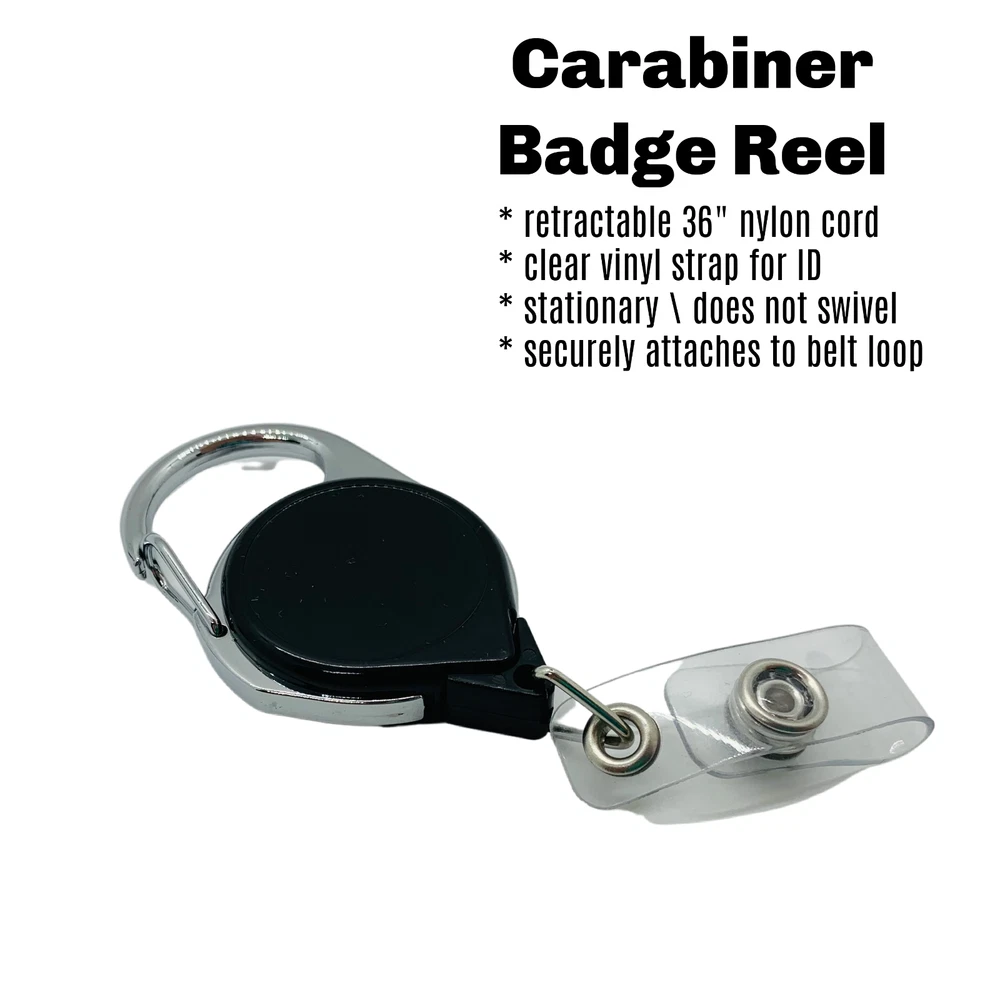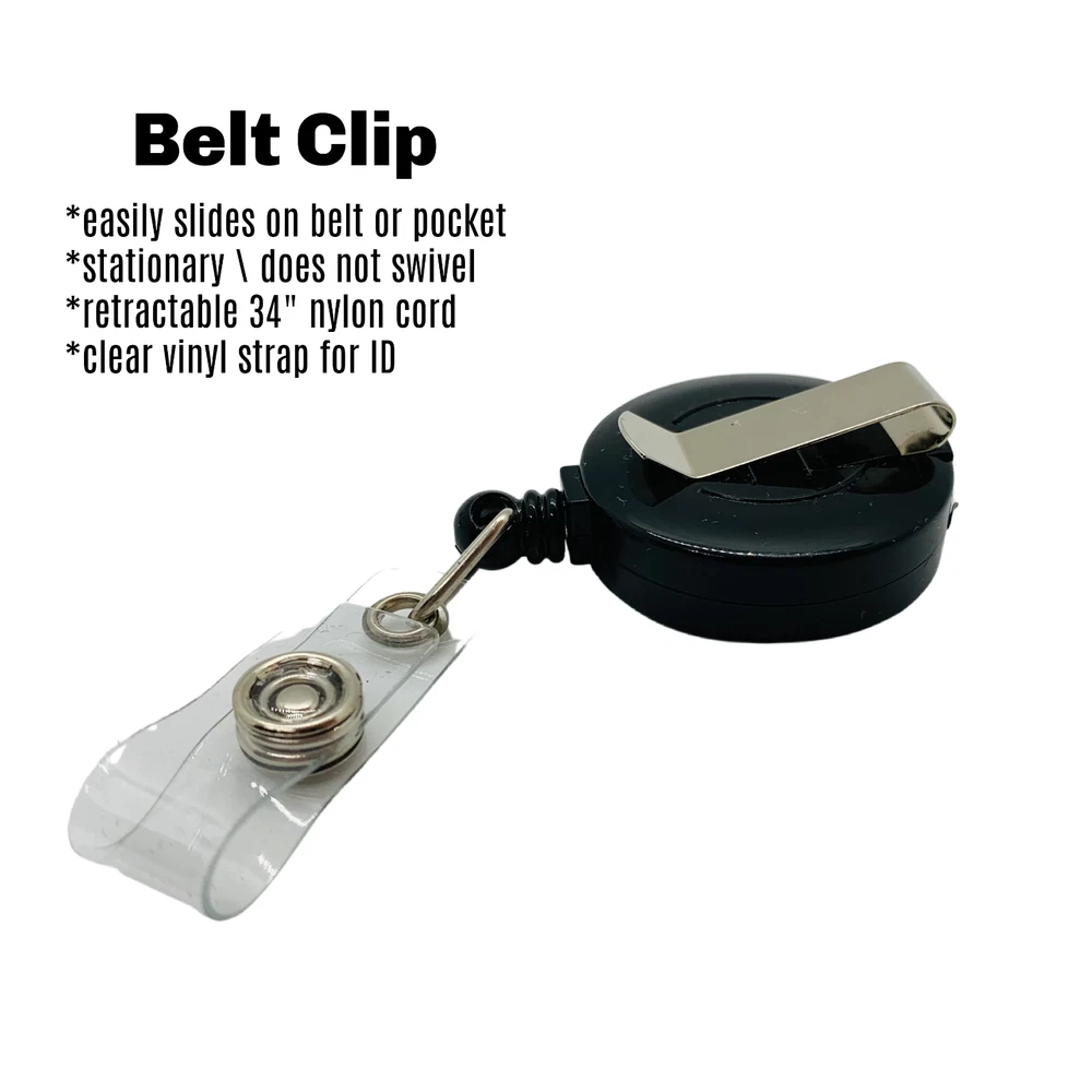 This cute badge reel is the perfect accessory for you work ID. The 2" x 1.5" design is embroidered on high quality sparkle vinyl and permanently attached to a retractable badge reel. You choose the clip style that works perfectly for you. Alligator Swivel Clip- Features a rotating spring clip that allows for smooth pulling in any direction. Full 360 degree rotation. Retractable 34" nylon cord. Clear strap for your ID. Belt Clip- Easily slides onto your belt or pocket for quick and convenient access to your badges at any time. Retractable 34" nylon cord. Clear strap for your ID. Stationary clip that does not rotate. Lanyard with Badge Reel- The convenience of a retractable badge reel with the functionality of a lanyard, all in one. The lanyard is comfortable to wear and has a soft spongy feel. 36" total circumference, hangs center chest. Retractable 34" nylon cord. Clear strap for your ID. Carabiner- Securely latches to belt loop. 36" retractable nylon cord. No twist design keeps your badge facing forward at all times. Clear strap for your ID. No matter which option you choose, you can't go wrong with these stylish badge reels. Decorated badge reels are a fun way to brighten your work day! Each badge reel is made to order with great attention to detail.