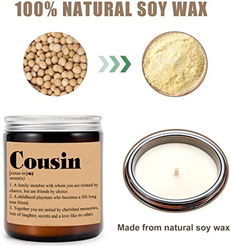 Return Policy Fast Delivery Trusted seller Cousin Definition Candle - Gift for Cousin - Gift Ideas for Cousin - Cousin Present - Galentines - Galentines Day - Valentines Gift Product Description 50 hours burning time; Poured in a reusable glass jar, 8oz cotton wick scented candle will burn for approximately 50 hours in typical conditions. 100% natural soy wax; Scented soy candle is made from natural soy wax; Soy wax provides a slower and cleaner burn than paraffin, which is better for environment, burns more sufficiently and longer. This candle is great for sleep-promoting and relief from anxiety, depression, and stress; A perfect addition to bathroom, bedroom, kitchen, living room, office etc... Anyone Or For Yourself! Great for any occasion - wonderful gifts for friends, family and Coworkers! A perfect addition for any home. Put it in your bathroom, bedroom, kitchen, living room office or foyer. Shipping Returns Payment Shipping Shipping is FREE to all addresses other than APO/PO boxes in the lower 48 states. All our stock ships from US-based warehouses. Shipped via USPS or UPS (depending on location and package weight) Unless stated otherwise, all orders will ship within 24-72 hours of your payment being processed. Check our feedback to see the great reviews of FAST shipping we offer. Returns Seller does not accept returns Payment We currently accept payment via eBay managed payments only. Once payment is cleared, we will dispatch your shipment within 1-3 business days. Please refer to the "Shipping" tab for more information regarding shipping speed to your destination.