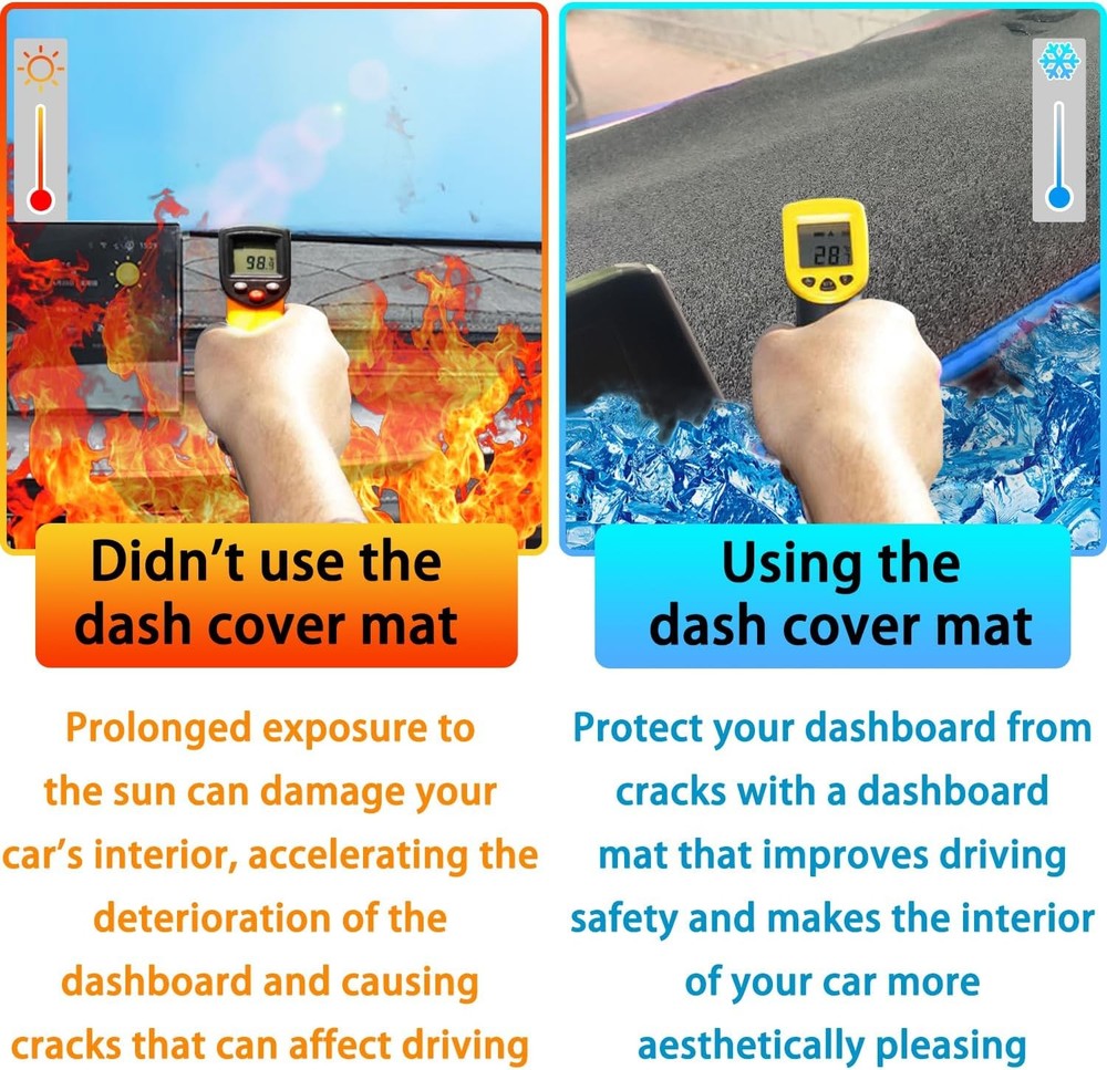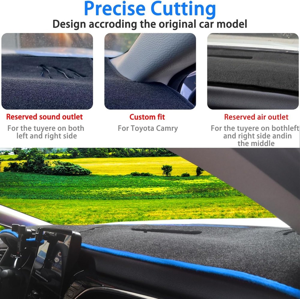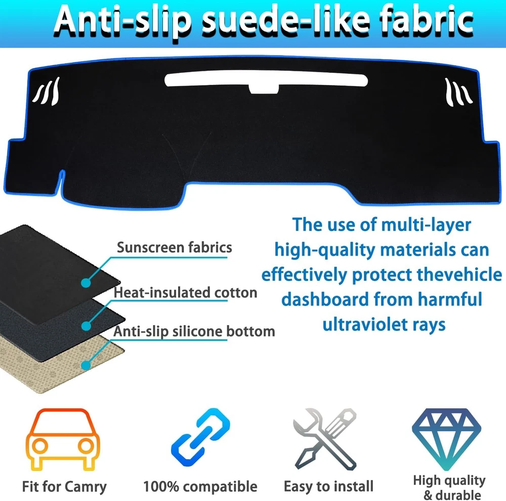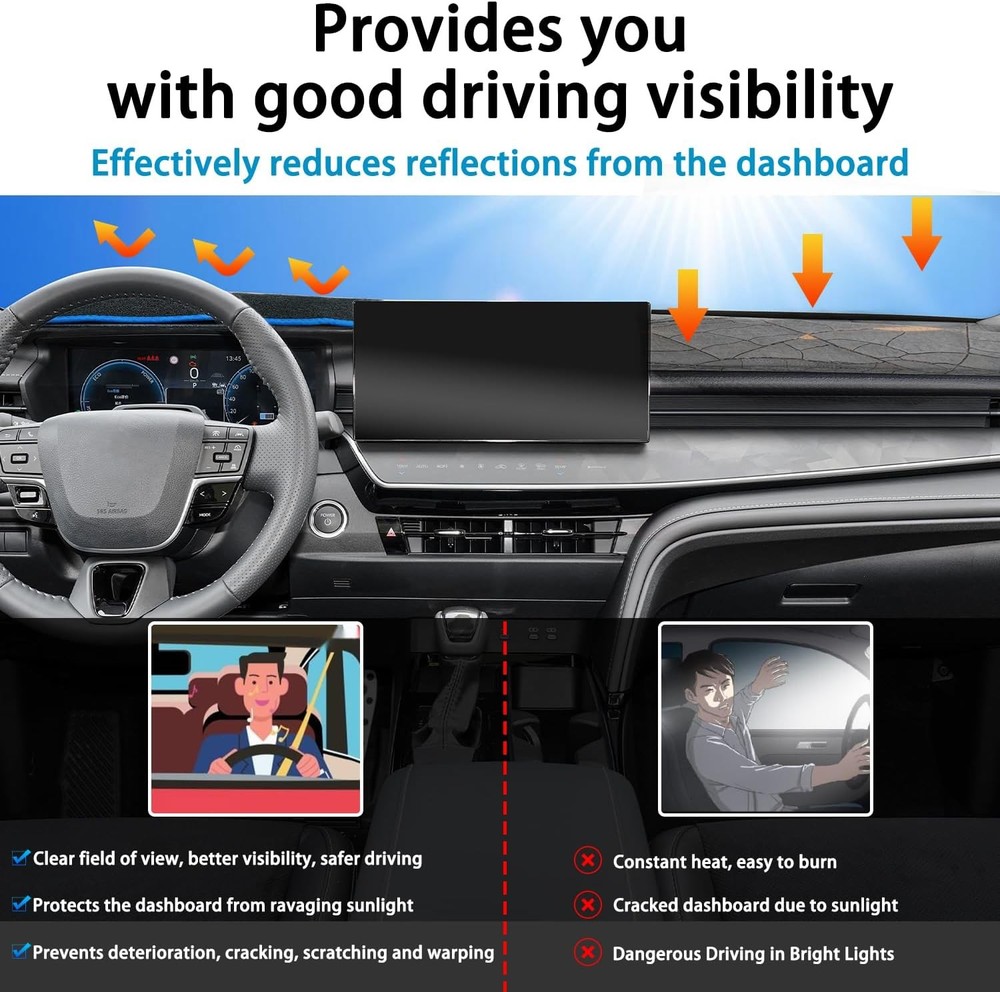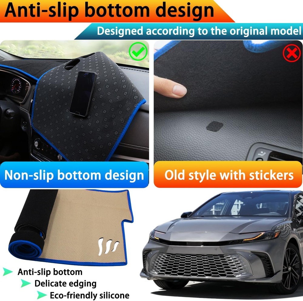 About this item Compatibility: The dash cover mat for Toyota Camry 2025 2026 (Without HUD). Please check the product pictures in the listing before purchasing to make sure the product fits your vehicle. (The product may have wrinkles, which will recover by themselves after a period of installation) Easy Installation: Our dashboard mat is custom made for the Camry and is perfectly Package Dimensionsd to fit. No tools required, just put the dash cover directly over the dash in the appropriate spot and it will not move. No adhesive is required. Material: The back of this center console cover sun protection mat is made of silicone particles to increase friction and effectively prevent slipping, durable, without peculiar smell, soft, scratch-resistant, waterproof, wear-resistant, breathable, easy to clean and disassemble. Function: The dashboard decorative interior prevents the dashboard from prolonged exposure to sunlight and UV rays, which can lead to cracking and warping of the dashboard. Dash cover mat helps reduce windshield glare, giving you a better view and safer driving. Package Dimensions: 13 x 1.47 x 3 inches.