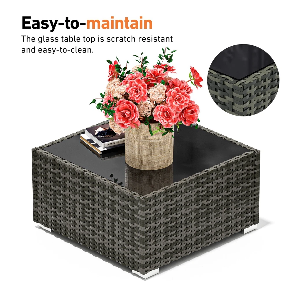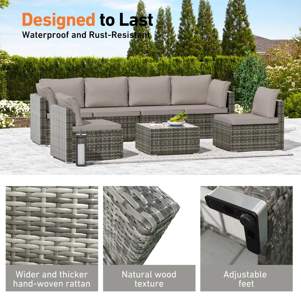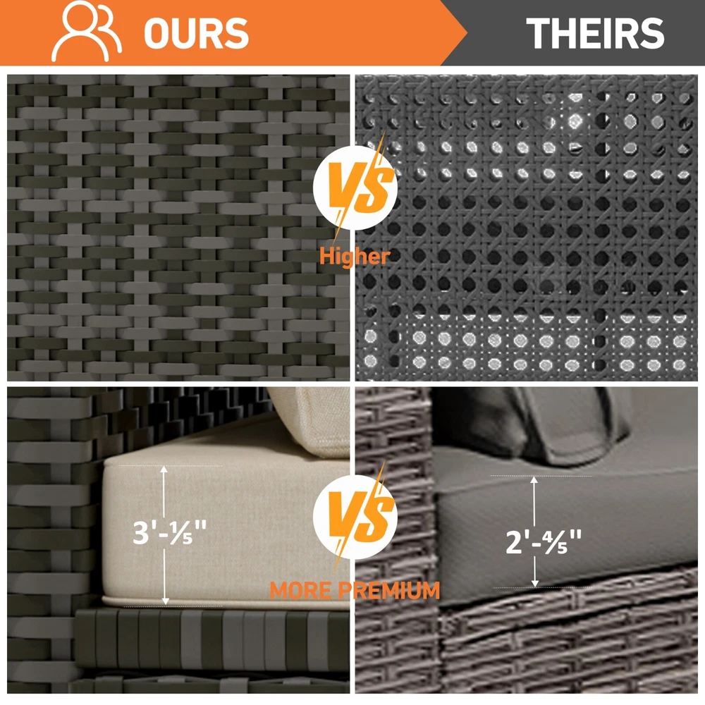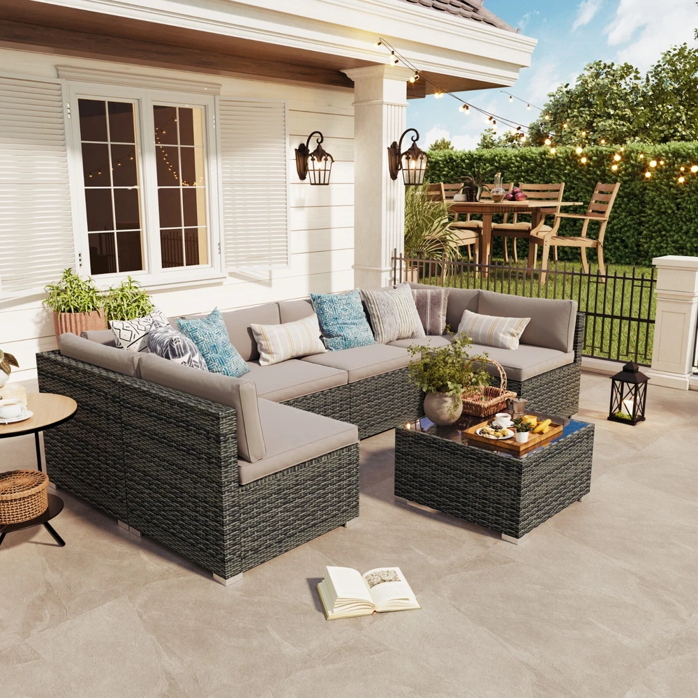[Sturdy and Enduring Outdoor Patio Furniture] Experience the durability and reliability of this 7-piece patio furniture set. Made with premium PE rattan and a robust powder-coated steel frame, this 7-piece patio furniture set is designed to endure all weather conditions, guaranteeing years of outdoor pleasure. Whether your outdoor space is a balcony, lawn, garden, or poolside, this set is ideal for all settings. [Comfortable Seating with Contemporary Style] Experience ultimate comfort with 3.9 inch thick seat cushions and an ergonomic backrest in this patio conversation set. Designed to provide optimal support, the durable and weather-resistant cushions ensures you and your family can relax outdoors for extended periods. [Easy to Maintain] Maintaining this patio furniture set is effortless. The cushion covers feature a zipper design for easy removal and cleaning. The splash-proof material ensures simple upkeep, and the tempered glass top of the coffee table can be cleaned with a damp towel easily. [Flexible Sectional Conversation Set] This 7-piece sectional set offers flexible configuration options, allowing you to arrange the sofas to fit your space requirements. Perfect for both small and large areas, this set adapts to different room sizes, giving you the freedom to create your ideal outdoor seating arrangement. [Full Set for Optimal Outdoor Living] This outdoor furniture set includes four single-seat(26" x 28.5" x 26.4"), two armchairs (28.5" x 28.5" x 26.4"), and a coffee table (25.6" x 25.6" x 14.6"). With this comprehensive set, you can make the most of the warm weather and fully enjoy outdoor living. [Simple Assembly] We've included all the essential hardware and tools for assembling the patio sofa set. An adult can effortlessly put together each sofa in just 15 minutes. Modern Shade provides free replacement for any defective, damaged, or missing parts. If you have any questions about our product, please reach out to us.