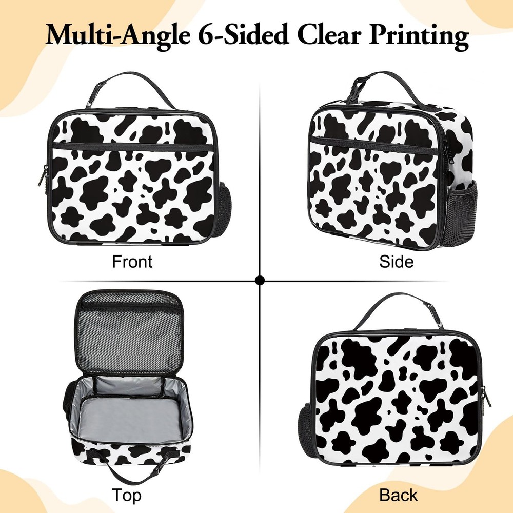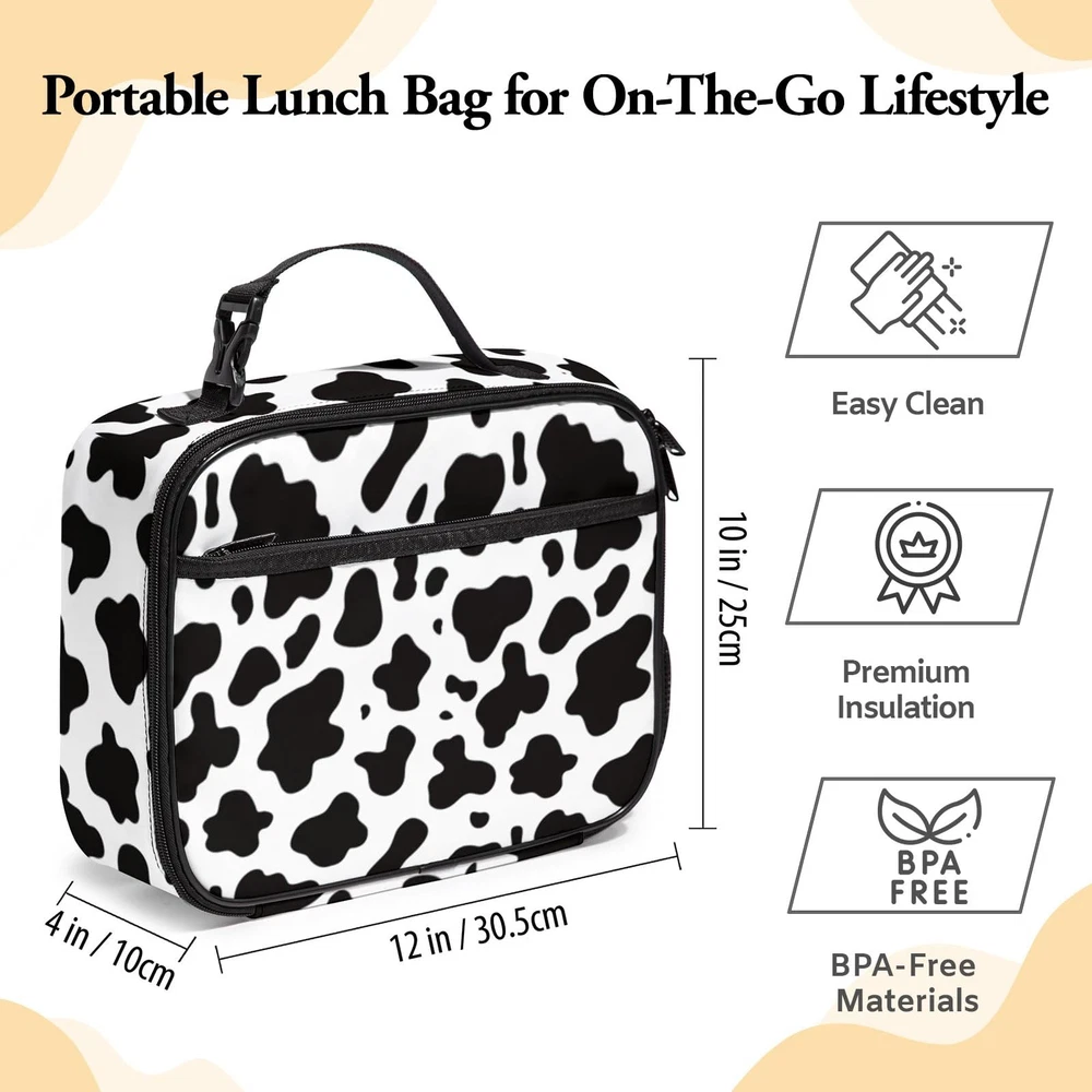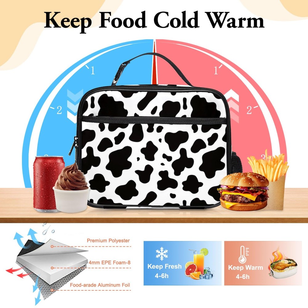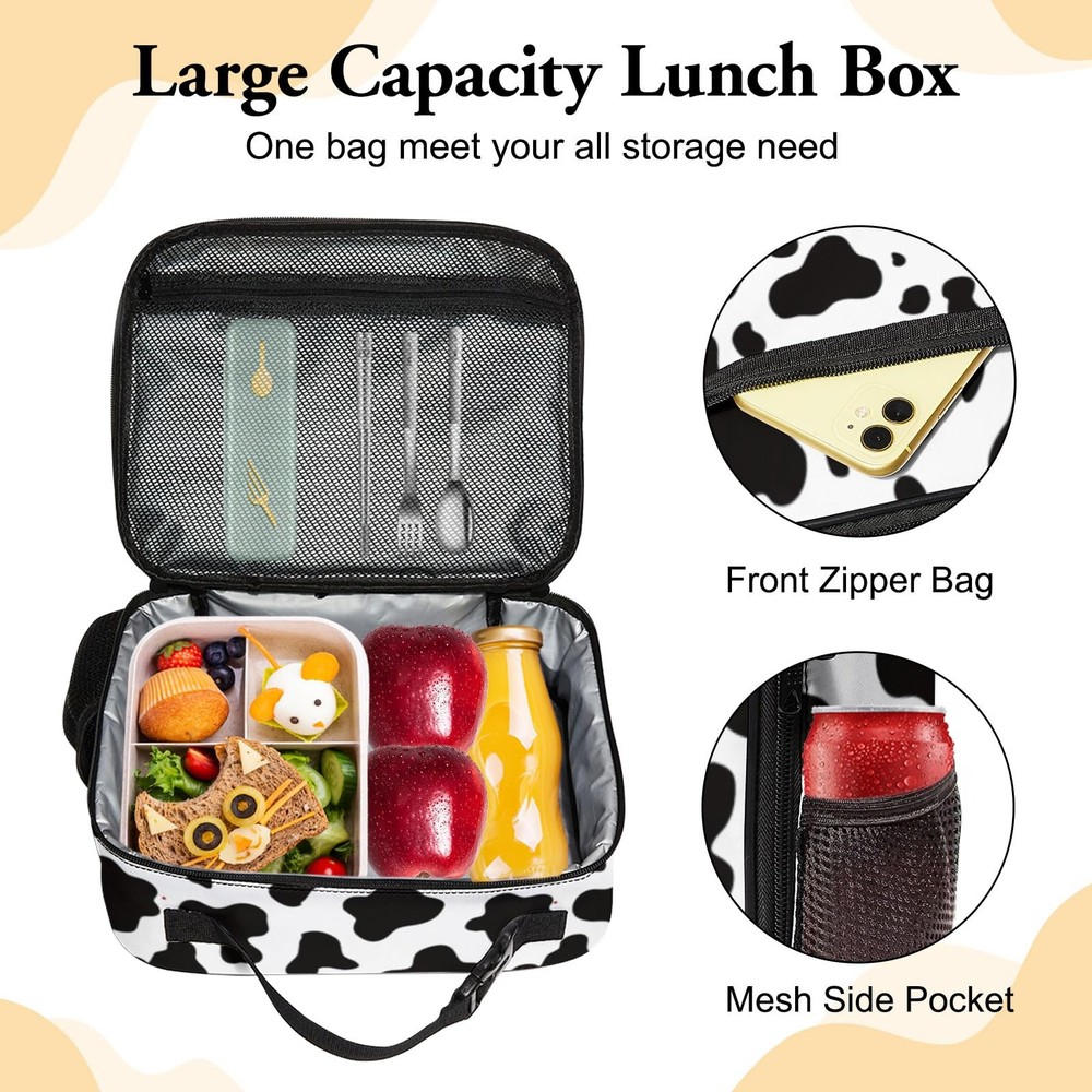 Large Lunch Box, Insulated Reusable Lunch Bag with Water Bottle Holder Portable Waterproof Leakproof Lunch Tote Bag Cute Lunch Box for School Picnic Travel Back to School Gifts Cow Print Lunch Box: stylish and eco-friendly 300D polyester lunch box is the perfect accessory for your daily lunch routine. With its eye-catching and playful cow print, this lunch box is perfect for both kids and adults. Large Capacity Lunch Bag: With its large capacity lunch bag, bring all your favorite food and snacks wherever you go. The front zipper bag, side pocket and inside mesh pocket provides plenty of storage space for utensils and more. Insulated Lunch Tote Bag: Insulated thick aluminum foil lining keeps food fresh warm cold for 4-8 hours and helps regulate temperature. Also durable and easy to clean, with a sturdy removable handle for easy carrying. Portable Lunch Box: Take this portable lunch bag wherever you like, as it is not only convenient but also leakproof. Perfect for school or outdoor activities like sports, camping, and hiking. Ideal Gifts: The cute print lunch box is a perfect gift for anyone on your list, whether it's for back to school, birthdays, or anniversaries, etc. Available in a variety of colors and designs, our lunch box is not only functional but also a stylish addition to your daily routine.