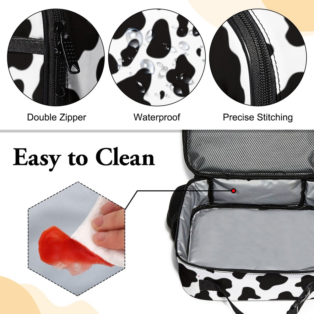 This cow-print lunch box is such a fun and practical choice! The insulation keeps food fresh, and the large size fits everything I need. Love the built-in water bottle holder—super convenient for school or work. The waterproof material is a lifesaver, and the cute design always gets compliments. Perfect gift for anyone who loves style and functionality!