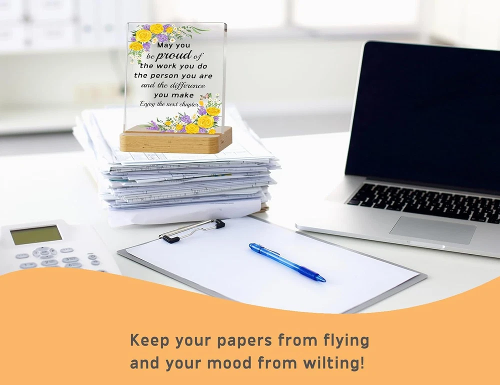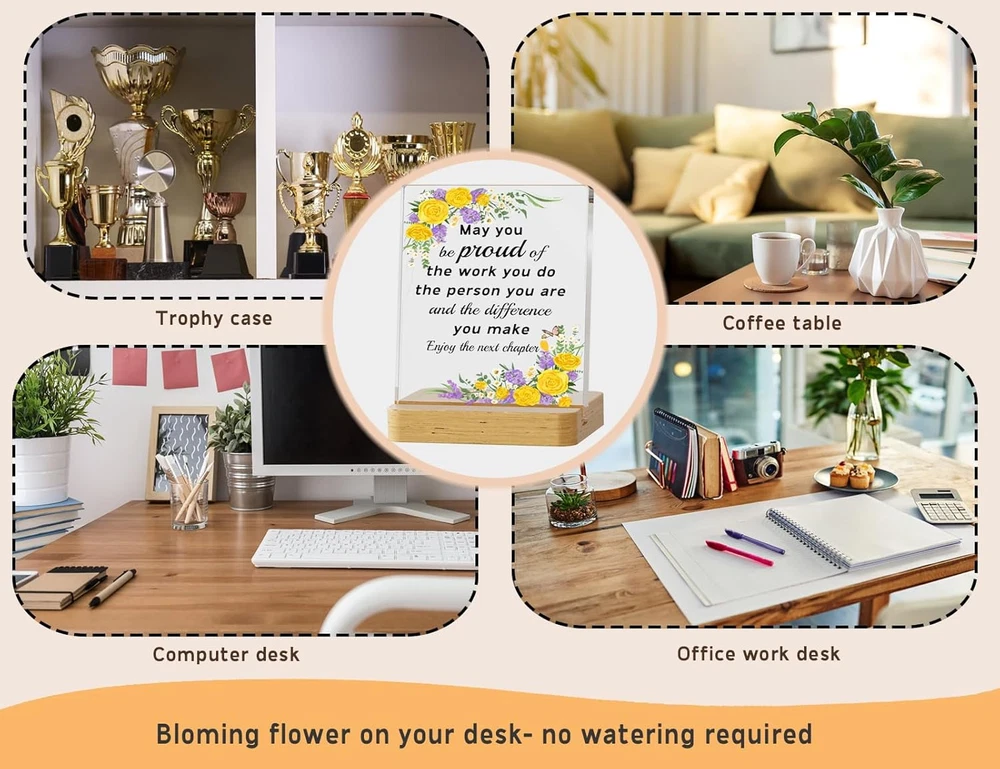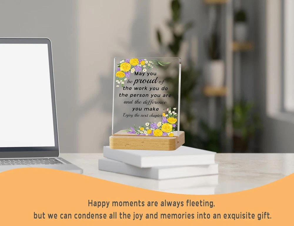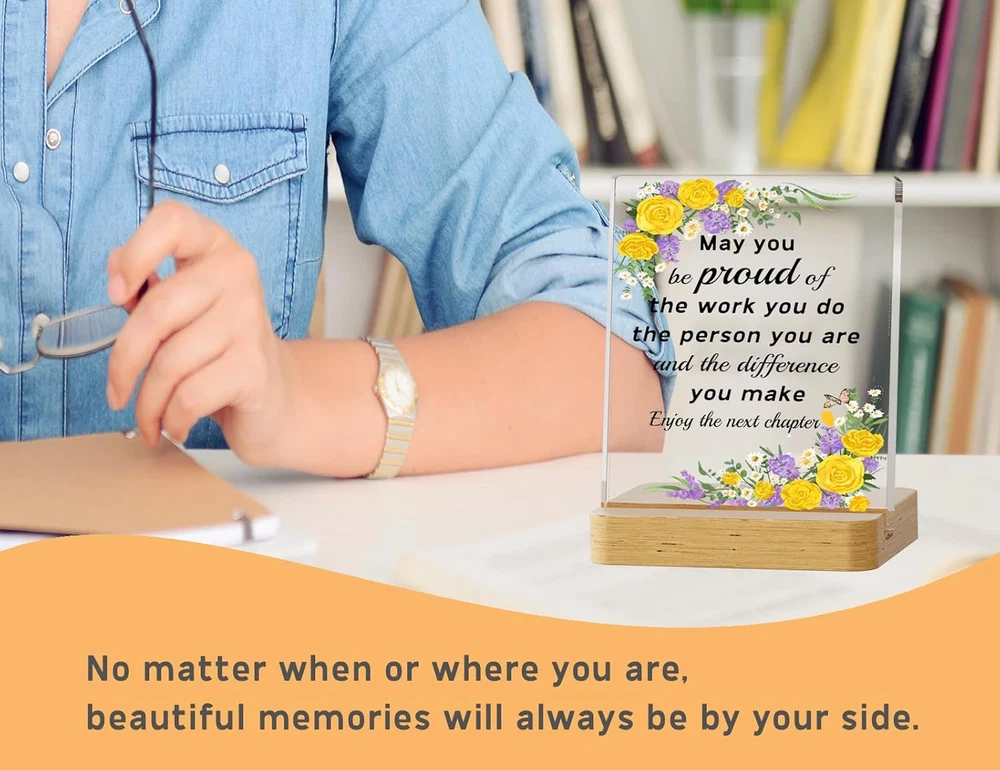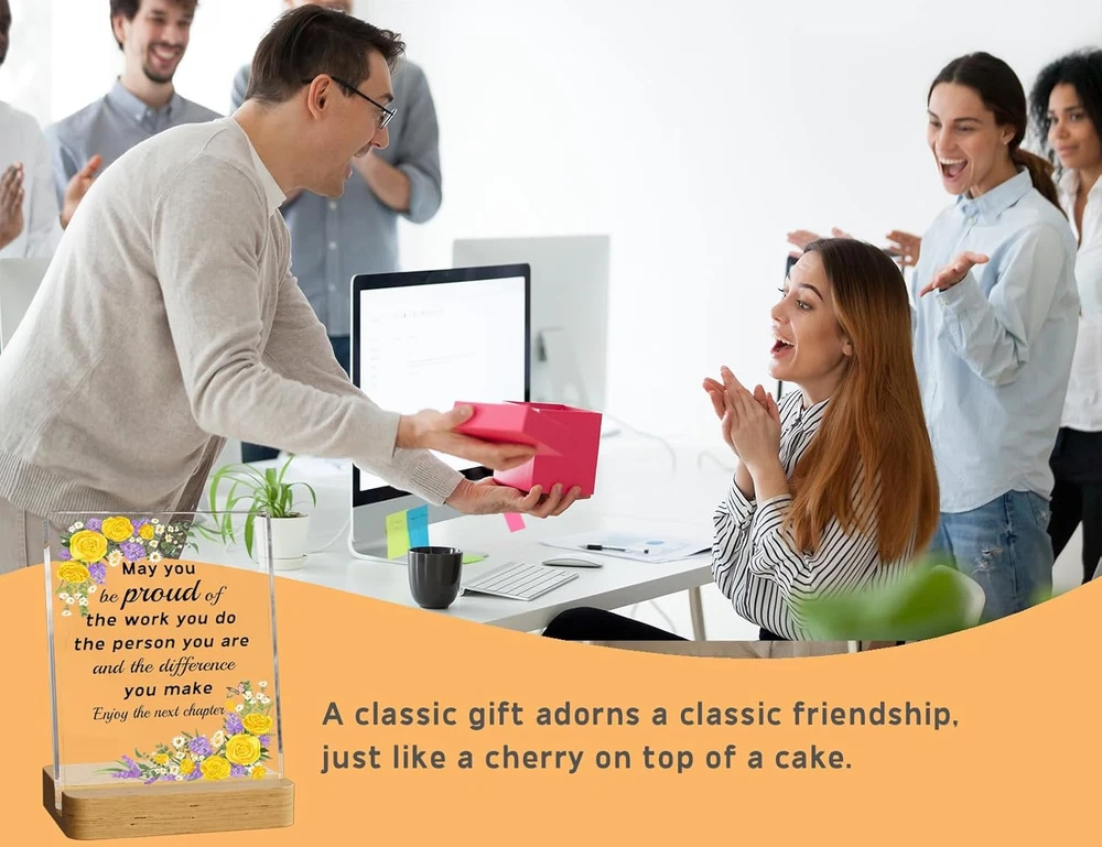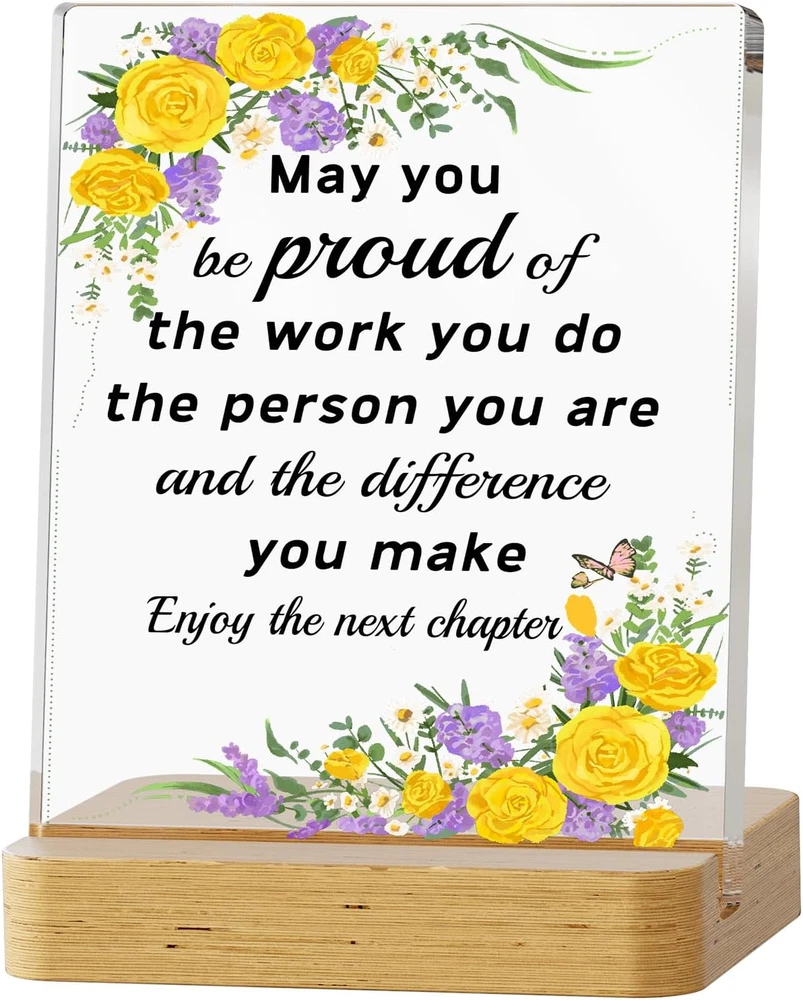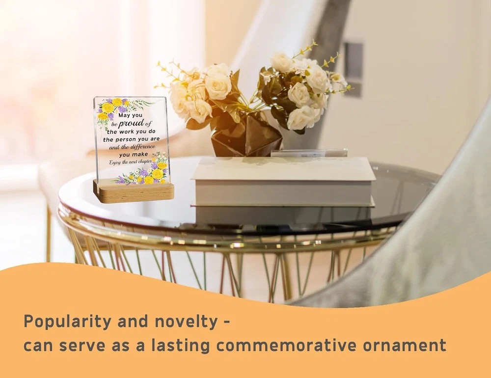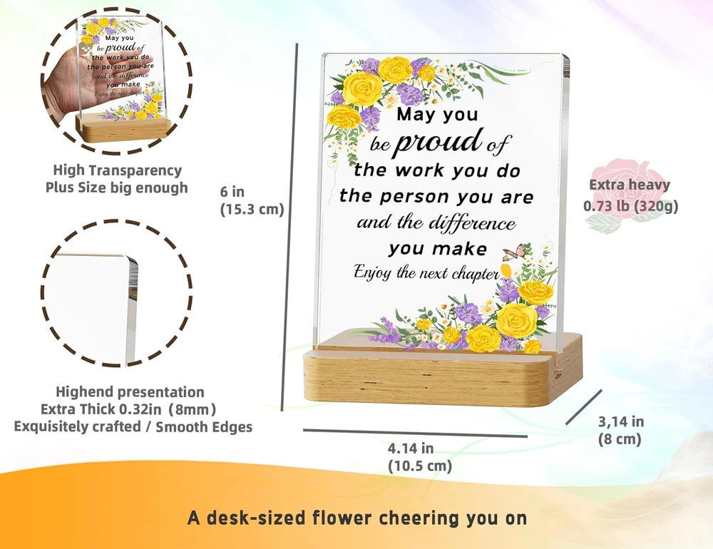 【Celebrate a New Chapter in Life】 Yellow roses symbolize gratitude and friendship.Violets symbolize respect and well wishes. It conveys feelings of gratitude, friendship, respect, and well wishes towards the retiree, quiter,making the gift more meaningful and heartwarming. 【Size and design, equally excellent】 This gift is larger than the standard size, with excellent attention to detail. This shows that you put careful thought into selecting a meaningful gift. It celebrates career achievements with a thoughtful message and symbol of happiness and positivity. It is sure to evoke appreciation and positivity in the receiver, reminding them of their impact on life. Make it even more impressive. Make your gift even more impressive. 【Multi-functional】It's rare to find an item for happy retirement gifts or new job gifts for women office that is both decorative and practical, but this desktop decoration achieves just that. With its delicate design, it brings warmth and positive to any workspace, while also can keep documents organized with weighing in at 10.6 ounces. 【Suitable for various occasions:】This is a reliable gift option to celebrate retirements, work anniversary gifts, graduations, coworker leaving, promotion gifts for men women, moving away or simply to show appreciation. It's suitable for gifting to bosses, coworkers, friends, family, or anyone in need of a little positivity to embrace new opportunities and accomplishments. 【Highly transparent & stable placement】This acrylic plaque is truly one-of-a-kind, with its highly transparent and durable material that comes paired with a wooden base for added stability. It's the perfect gift for bosses, coworkers, and friends. 【Plus size】 You can be confident that the size is big enough with measuring 6x 4.14 x 3.14 inches (15.3x 10.5 x 8 cm) and 0.32 inches (8mm) thick. It's the perfect size for tea tables, countertops, and dressers, and is sure to catch people's attention. Product Description Keepsake gift series for retirement, leaving, new job, promotion Add to Cart Add to Cart Add to Cart Add to Cart Add to Cart Add to Cart Add to Cart Customer Reviews 4.4 out of 5 stars 3 4.8 out of 5 stars 86 — 5.0 out of 5 stars 6 5.0 out of 5 stars 4 — 5.0 out of 5 stars 1 Price $13.99 $ 13 . 99 $14.99 $ 14 . 99 $14.99 $ 14 . 99 $14.99 $ 14 . 99 $13.99 $ 13 . 99 $14.99 $ 14 . 99 $14.99 $ 14 . 99 Flower language Nobility Autonomy Friend Joy New start, positive outlook Good luck and hope Good luck and hope Nobility Autonomy Friend Joy U are the irreplaceable piece U are the irreplaceable piece Pattern Illustration Purple Violet and Yellow Rose Sunflower Lucky Four-Leaf Clover Lucky Four-Leaf Clover Purple Violet and Yellow Rose gear gear Gift Theme Leaving, retirement, new job Leaving, retirement, new job Leaving, retirement, new job Leaving, retirement, new job Leaving, retirement, new job Leaving, retirement, new job Leaving, retirement, new job Gift Theme Resignation, promotion Resignation, promotion Resignation, promotion Resignation, promotion Resignation, promotion Resignation, promotion Resignation, promotion Gift Purpose Keepsake, desk decor, plaque Keepsake, desk decor, plaque Keepsake, desk decor, plaque Keepsake, desk decor, plaque Keepsake, desk decor, plaque Keepsake, desk decor, plaque Keepsake, desk decor, plaque Size 6x 4.14 x 3.14 inches 6x 4.14 x 3.14 inches 6x 4.14 x 3.14 inches 6x 4.14 x 3.14 inches 6x 4.14 x 3.14 inches 6x 4.14 x 3.14 inches 6x 4.14 x 3.14 inches Gift box ✔ ✔ ✔ ✔ ✔ ✔ ✔ Keepsake gift series for retirement, leaving, new job, promotion Add to Cart Add to Cart Add to Cart Add to Cart Add to Cart Customer Reviews 3.4 out of 5 stars 2 5.0 out of 5 stars 1 — 5.0 out of 5 stars 2 — — Price — $14.99 $ 14 . 99 $14.99 $ 14 . 99 $14.99 $ 14 . 99 $14.99 $ 14 . 99 $14.99 $ 14 . 99 Flower language Passion Good luck and hope Good luck and hope Nobility Autonomy Friend Joy U are the irreplaceable piece U are the irreplaceable piece Pattern Illustration Red flower Lucky Four-Leaf Clover Lucky Four-Leaf Clover Purple Violet and Yellow Rose gear gear Gift Theme Leaving, retirement, new job Leaving, retirement, new job Leaving, retirement, new job Leaving, retirement, new job Leaving, retirement, new job Leaving, retirement, new job Gift Theme Resignation, promotion Resignation, promotion Resignation, promotion Resignation, promotion Resignation, promotion Resignation, promotion Gift Purpose Keepsake, desk decor, plaque Keepsake, desk decor, plaque Keepsake, desk decor, plaque Keepsake, desk decor, plaque Keepsake, desk decor, plaque Keepsake, desk decor, plaque Size 6x 4.14 x 3.14 inches 6x 4.14 x 3.14 inches 6x 4.14 x 3.14 inches 6x 4.14 x 3.14 inches 6x 4.14 x 3.14 inches 6x 4.14 x 3.14 inches Gift box ✔ ✔ ✔ ✔ ✔ ✔ Gift series for retirement, leaving, new job, promotion Add to Cart Add to Cart Add to Cart Customer Reviews 5.0 out of 5 stars 1 — — 5.0 out of 5 stars 1 Price — $12.99 $ 12 . 99 $14.99 $ 14 . 99 $14.99 $ 14 . 99 Flower language New start, positive outlook Good luck and hope Nobility Autonomy Friend Joy Nobility Autonomy Friend Joy Pattern Illustration Sunflower Lucky Four-Leaf Clover Purple Violet and Yellow Rose Purple Violet and Yellow Rose Gift Theme Leaving, retirement, new job Leaving, retirement, new job Leaving, retirement, new job Leaving, retirement, new job Gift Theme Resignation, promotion Resignation, promotion Resignation, promotion Resignation, promotion Gift Purpose Phone/pad desk holder Phone/pad desk holder Phone/pad desk holder Phone/pad desk holder Size 7.48“Hx4.33W 7.48“Hx4.33W 7.48“Hx4.33W 7.48“Hx4.33W Gift box ✔ ✔ ✔ ✔ Inspirational gift series for retirement, leaving, new job, promotion Add to Cart Add to Cart Add to Cart Add to Cart Add to Cart Customer Reviews 5.0 out of 5 stars 1 5.0 out of 5 stars 1 5.0 out of 5 stars 1 5.0 out of 5 stars 1 5.0 out of 5 stars 1 5.0 out of 5 stars 1 5.0 out of 5 stars 1 Price $12.9