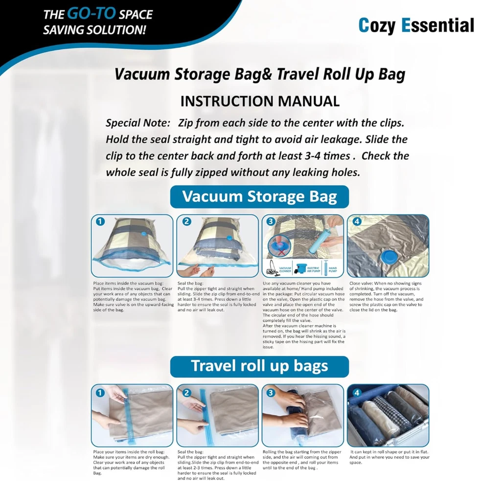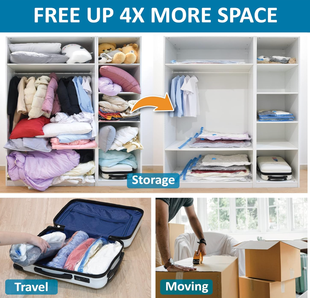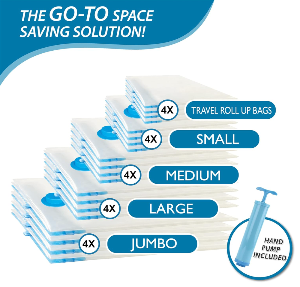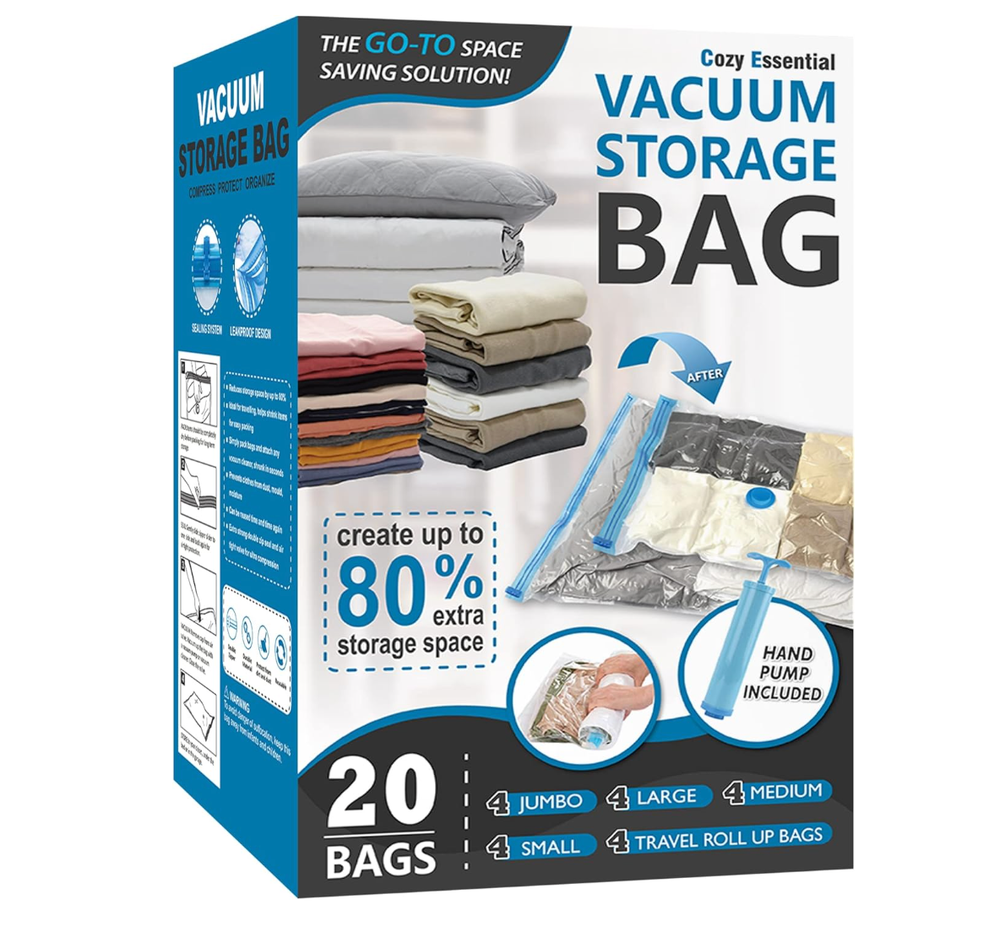 About this item Expand your storage by up to 80%: Our vacuum seal storage bags effortlessly compress clothes, blankets, pillows, and travel essentials in seconds, transforming overcrowded closets and overpacked suitcases into clean, organized space- no clutter at home, no unnecessary luggage fees. Just more room whenever you need it. Reliable protection: Engineered with a triple-seal turbo valve and double-zip seal to maintain a lasting compression. Locks air out to protect against dirt, dust, and damage while preventing unwanted rebound.Can be used repeatedly. 20 combo includes: 4 Jumbo: 39.35” X 27.5”(100cm X 70cm); 4 Large: 33.5” X 21.65”(85cm X 55cm); 4 Medium: 27.5”X 19.5”(70cm X 50cm); 4 Small: 23.5”X 15.7” (60cm X 40cm); 4 Travel Roll Up (No pump needed): 23.5”X 15.7” (60cm X 40cm) Easy compression: Compatible with standard vacuum cleaners for rapid air removal. Includes a portable hand pump for convenient, cordless compression at home or while traveling. Multi-Use for Travel & Home: These vacuum seal storage bags are designed to expand luggage capacity and simplify home organization. Designed for home storage, travel, flights, cruises, moving, and seasonal storage. Made for families, students, and frequent travelers who need more room without extra bulk. FREE FAST SHIPPING
