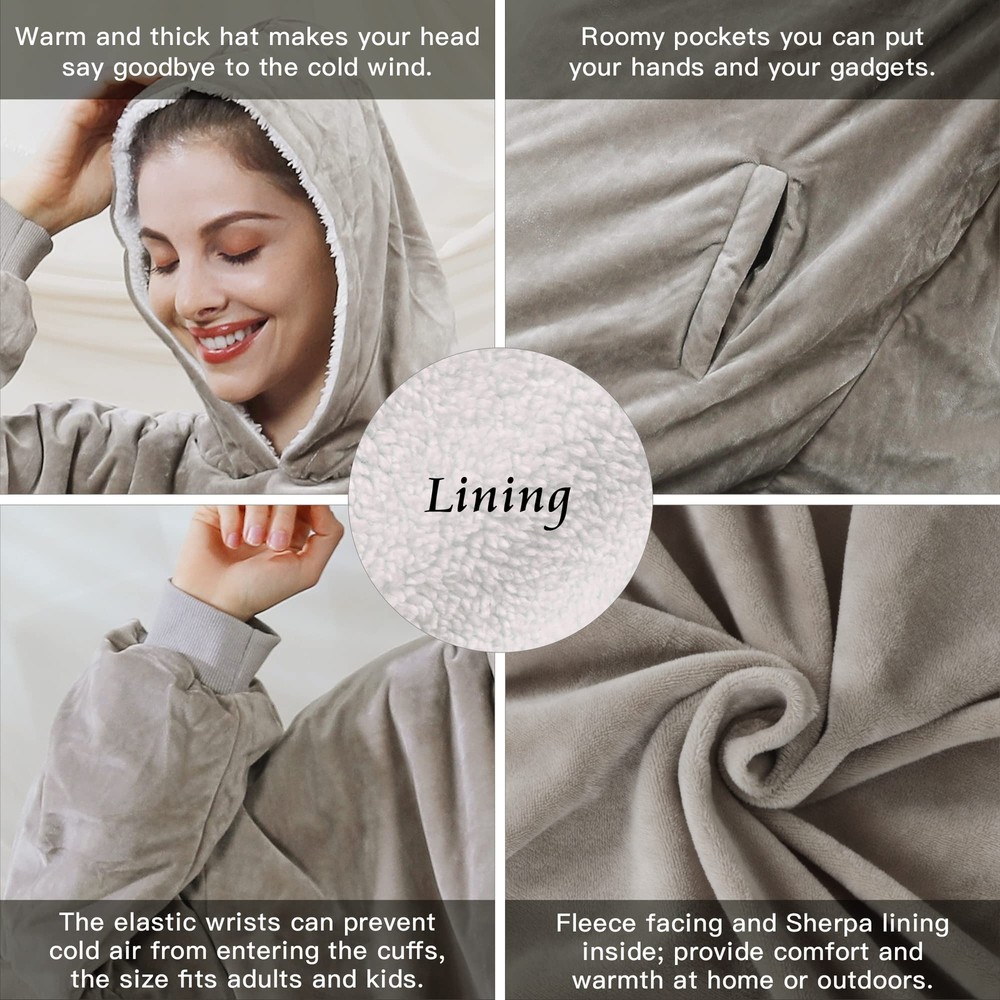 [Autumn Winter Essentials]- Are you still afraid to go out because of the cold? With this blanket sweatshirt, you can say goodbye to the cold. Because our sweatshirt blanket is made with super soft microfiber fleece on the front and Sherpa lining on the other. While providing you with warmth, let you free yourself without hindrance. [Multifunctional Purpose]- The blanket sweater is not limited to indoor reading, watching TV, blanket sweater can be used for outdoor sports, sports events, camping, beaches and almost any place and used as school uniforms, girlfriends clothes, couples clothes, parent-child clothes, warm pajamas. In this way, you can share warmth and joy with your friends, lovers, and family together. [Moving Wearable Blanket]- The wearable blanket adult is equipped with giant front pockets that can store your mobile devices, such as phone, remote controls, also snacks. The blanket with sleeves, oversized hood, elastic cuffs and wide neck design which allow you to move your limbs and body easily. It can be used as girlfriend gifts, boyfriend gifts, wife gifts, husband gifts, best friend gifts, business partner gifts, kids wearable blankets gifts and so on. [One Size Multi Color Fit All]- Our hooded blanket is one size for adults and teenagers, but hooded blanket has different colors optional. Both men and women are suitable. Welcome to buy, please refer to the product details for specific colors, there is always a color for you. It is the best gifts choice, can be birthday gift, funny gifts, cute gifts, unique gifts, gag gifts, anniversary gifts, sloth gifts. [Washing Instructions]- Hand wash or machine wash with cold water. Wash separately before using blanket sweatshirt for the first time. At important festivals or moments, sweatshirt blanket fleecehug hoodie is the best choice for College gifts, Christmas day gifts, Thanksgiving day gifts, Valentines day gifts, Halloween day gifts, Mothers day gifts, Father day gifts. Let the warmth always be with everyone.