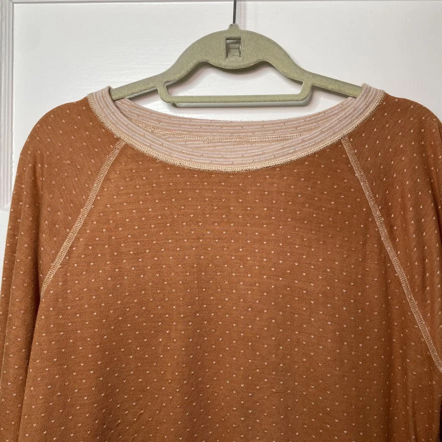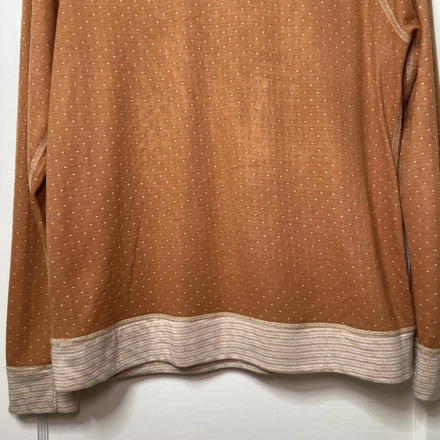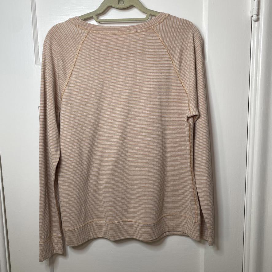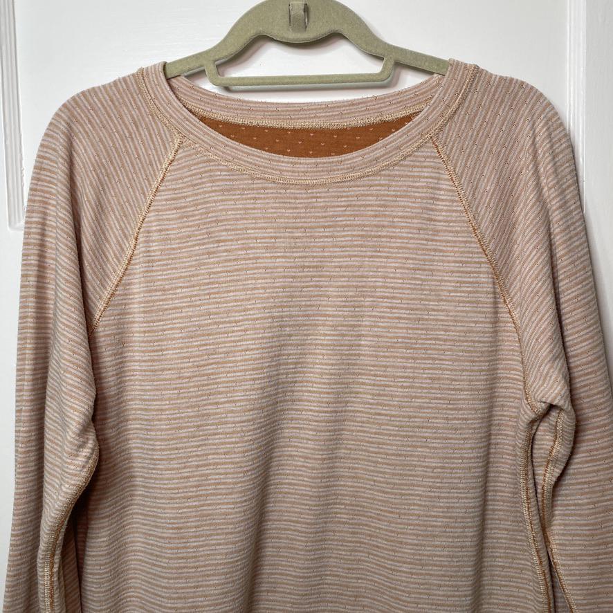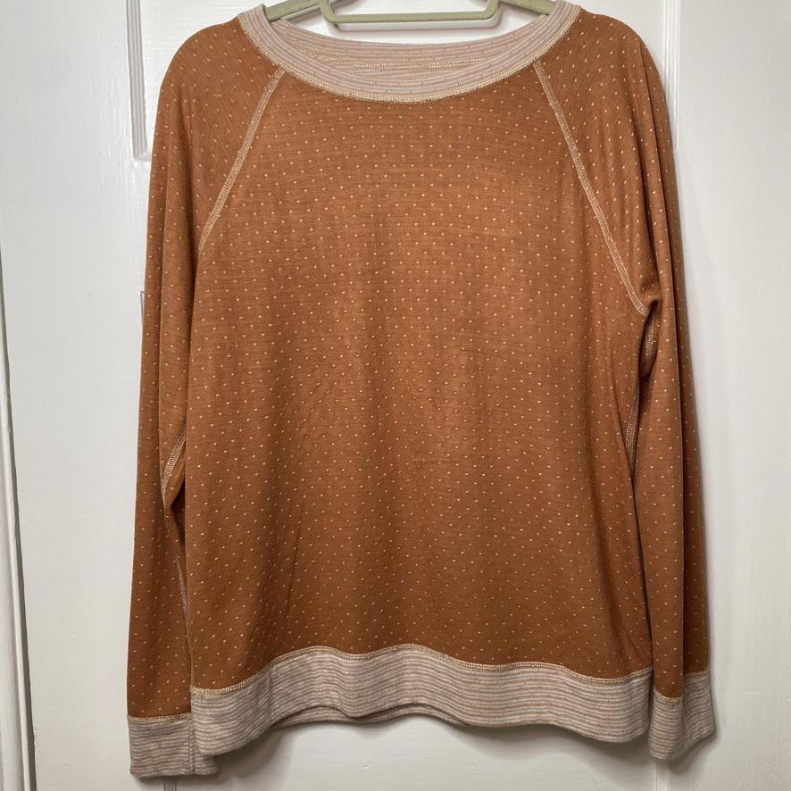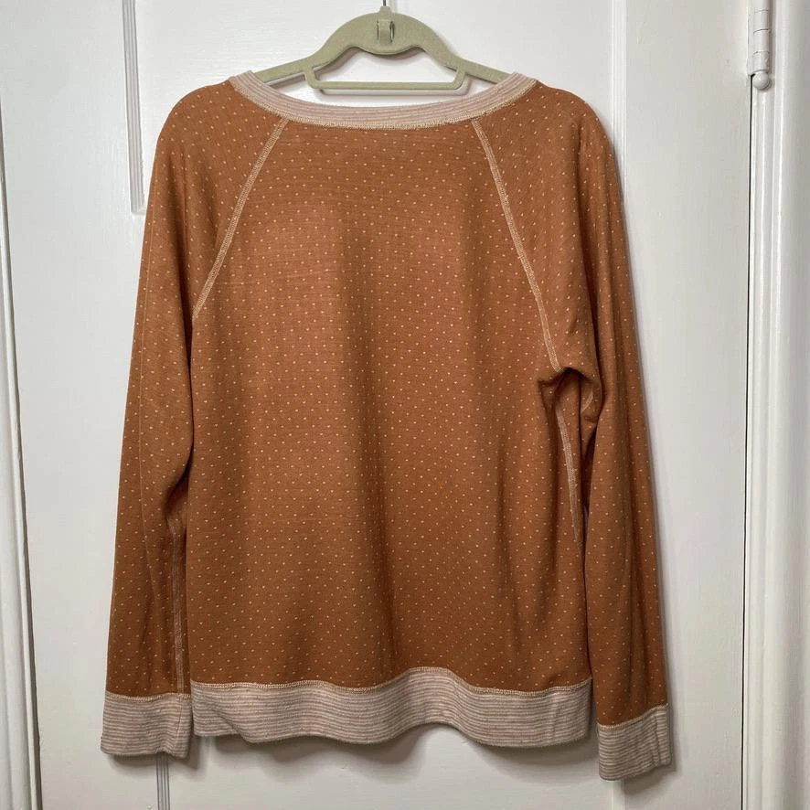 This Cozy Reversible Long Sleeve Top by Sonoma is perfect for layering or wearing on its own. BRAND: Sonoma CONDITION: Gently Used (some light puckering of the fabric on the orange w/ dots side) US SIZE: Large | Chest 20" Sleeve 23" Length 24" COLOR: Orange with dots on one side, Peach stripes on the other MATERIAL: Cotton blend (no tags) FEATURES/ACCENTS: - Soft and breathable fabric - Raglan sleeves for a relaxed, comfortable fit - Classic striped design on one side with tiny polka dots on the other - Ideal for layering or casual wear - Easy care, wrinkle-resistant fabric ABOUT ME: I accept reasonable offers. Same or next day shipping. Questions? I’m always here to help with sizing, styling, or other inquiries. Thanks for stopping by! Have a great day. 😻ClosetKitty23