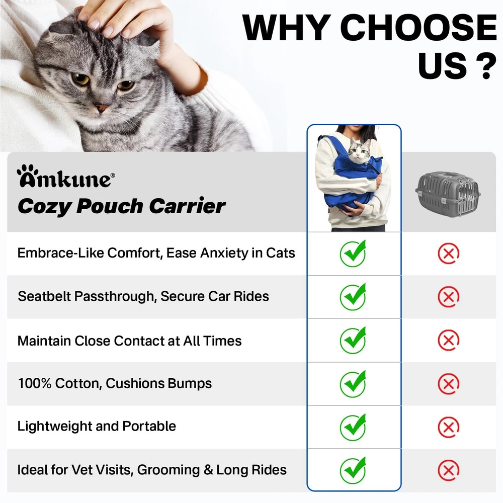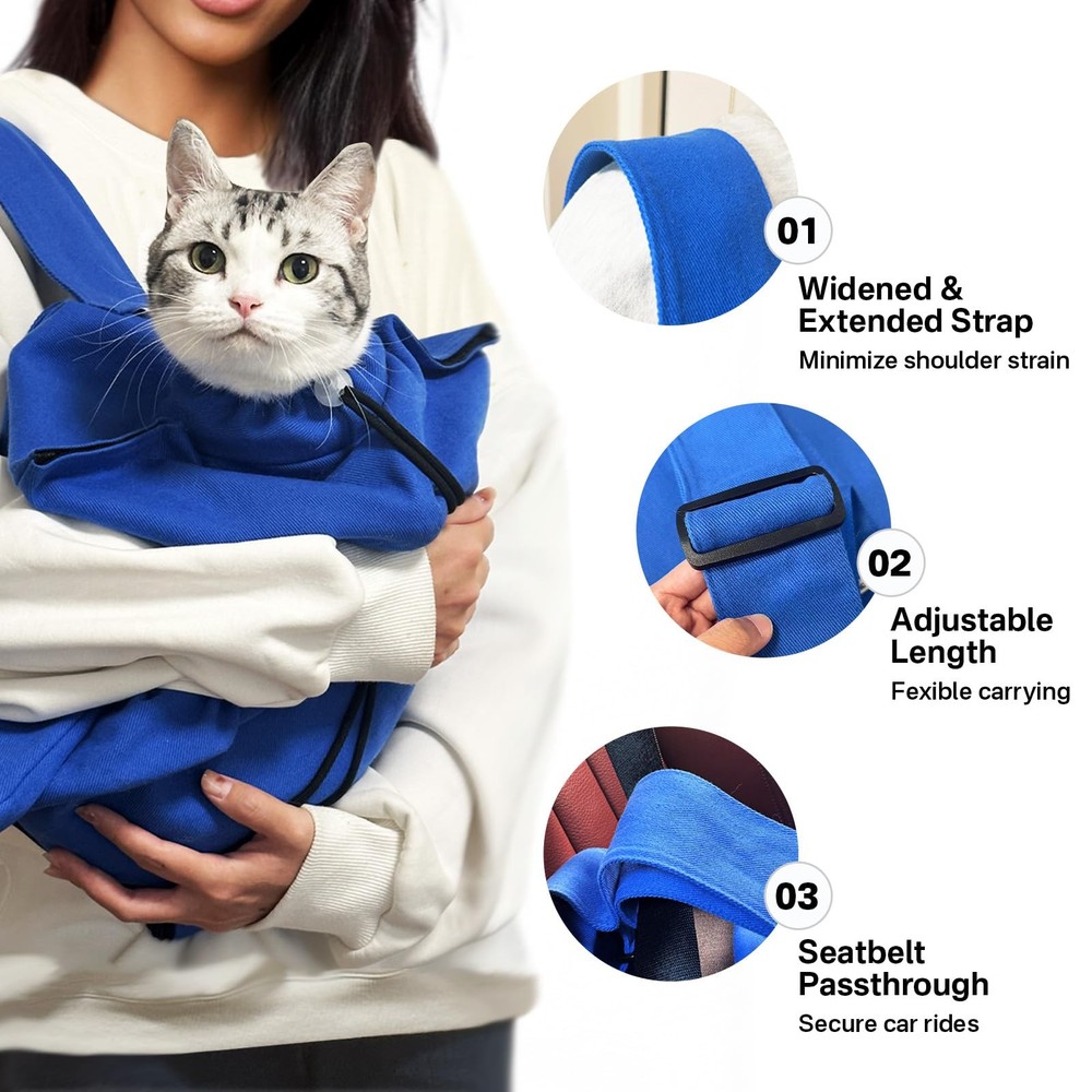 Looking for a stress-free way to take your cat to the vet or on the road? This cat carrier pouch is specially designed for small cats who get anxious during travel, grooming, or medical care. Whether you're headed to the vet, giving medication, or trimming nails, this soft cat carrier makes every step easier for both you and your cat. Unlike bulky hard carriers, this cat sling carrier features a soft, hug-like design that gently wraps around your pet, offering the calming sensation of being held. Made from breathable, claw-resistant 100% cotton, this cloth cat carrier sling bag is both durable and machine washable — perfect for everyday use. The cat bag carrier has a smart escape-proof neck opening with a retractable drawstring, allowing easy in-and-out while keeping your cat safely secured. Whether you're using it as a cat pouch carrier, cat carrying pouch, or collapsible cat carrier, the silent design keeps stress levels down for both you and your pet. Traveling? The cat carrier bag includes a dedicated seatbelt passthrough to keep the bag stable in your car — ideal for longer trips. And thanks to the widened, adjustable shoulder strap, this cat carrying bag is easy to carry by hand or over the shoulder without strain. Roomy enough for cats between 5 to 11 lbs, this soft sided cat carrier combines coziness and function. It folds flat for storage, making it a cute cat carrier that’s both convenient and space-saving. Whether you call it a pet carrier for cats, medium cat carrier, cat carrier soft, or simply your go-to cat bag—this is the cat carrier pouch your feline friend will thank you for 【Everyday Cat Care & Stress-Free Travel 】Is your cat stressed during vet visits or travel? Ideal for pet parents with small cats, this cozy, escape-proof Cat Carrier Pouch simplifies vet visits, nail trimming, and medication. Its soft, calming fabric ensures comfort, while the multifunctional design makes both travel and care a breeze 【Easy Access with Escape-Proof Design】The exclusive neck design of this cat sling carrier allows easy entry and exit. The retractable drawstring ensures a secure, adjustable fit without discomfort, while silent, escape-proof design guarantees safety and calmness during travel or vet visits 【Embrace-Like Comfort, Cozy Calm Trip】Is your cat anxious and keeps crying during travel? Gently wrap your cat in this soft cat carrier, designed to mimic the sensation of being lovingly held, soothing your cat’s travel anxiety. You can stay connected by petting your cat anytime. Plus, the cat bag carrier features a dedicated seatbelt passthrough, allowing you to secure it in your car for 100% peace of mind and safe travel 【Ergonomic, Comfortable Carry】The widened, adjustable strap reduces shoulder strain and provides flexibility, allowing you to carry the cat carrying pouch comfortably by hand or over the shoulder. Its lightweight design ensures effortless outings 【Breathable Material, Ultimate Comfort】Made from 100% cotton with a tight weave, this breathable, claw-resistant small cat carrier is machine washable and durable. Spacious enough for cats 5 to 11 lbs, it offers a cozy environment for your pet 【Friendly Reminder】Every cat has a unique personality, and not all cats enjoy traveling. If your furry friend shows strong resistance, please allow some time for adjustment. You can begin by placing this pet carrier for cat in its usual resting spot to help it get accustomed and feel secure