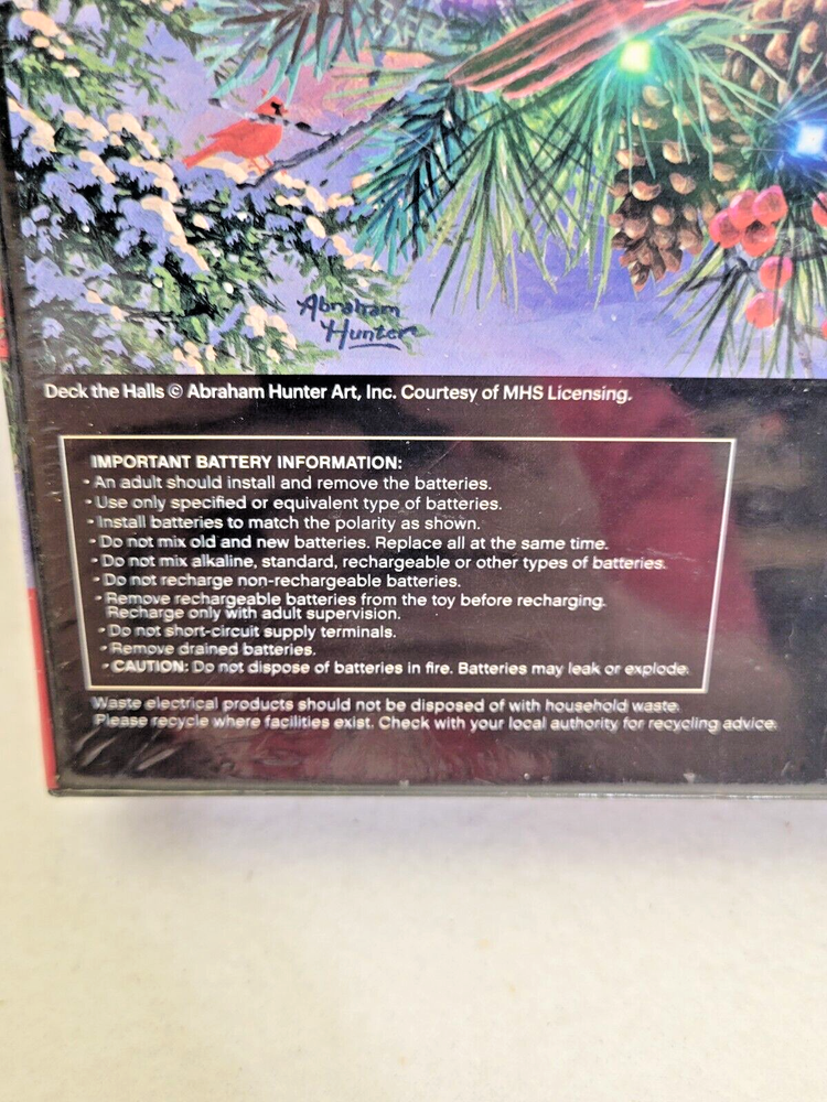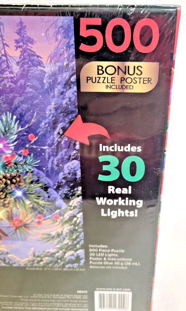 Enjoy the holiday season with this Cra-z-art jigsaw puzzle featuring "Deck The Halls" artwork of Abraham Hunter. With 500 interlocking pieces, this puzzle offers a fun and challenging activity for the whole family. Add to it the 30 working lights (requiring 2 AA batteries, not provided), and you have a wonderful addition to your holiday season spirit. Made of durable cardboard material, it ensures long-lasting use and complete satisfaction. This puzzle is perfect for anyone who loves art and Christmas. With multi-color and lighted features, it adds a festive touch to any room. It comes from a smoke-free household. Add this to your collection of contemporary puzzles and have a merry time! Doing puzzles has some hidden benefits . Excellent qualities : Cultivate concentration, patience, and temper your will Movement development : Train hand-eye coordination and precise small movements Spatial intelligence : Improve visual discrimination of colors and shapes Critical thinking ability : Understand the relationship between parts and the whole, and draw inferences from one example to explore the future Relaxes your mind : Relieve work pressure and release yourself Brain development : Enhance memory and may help prevent or slow brain degeneration Each item we ship is carefully packaged to prevent any damage and is shipped immediately with tracking. The box has minor wear. Please see the pictures for details. Puzzle pieces are crisp and clean.