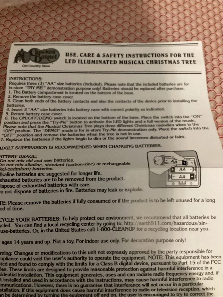 Cracker Barrel LED IIIuminated Musical Christmas Tree 18” Tree Plays three different Christmas melodies. Requires three (3) “AA” size batteries (not included). Tested and working- excellent condition.