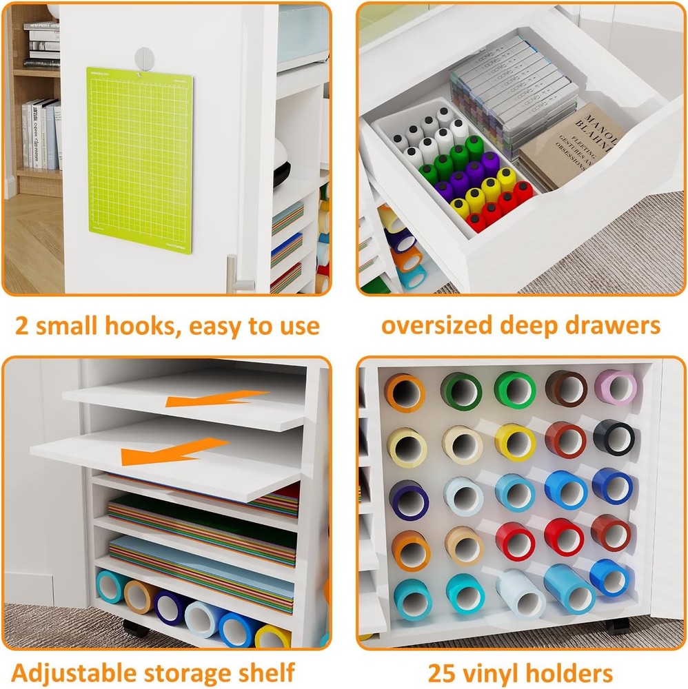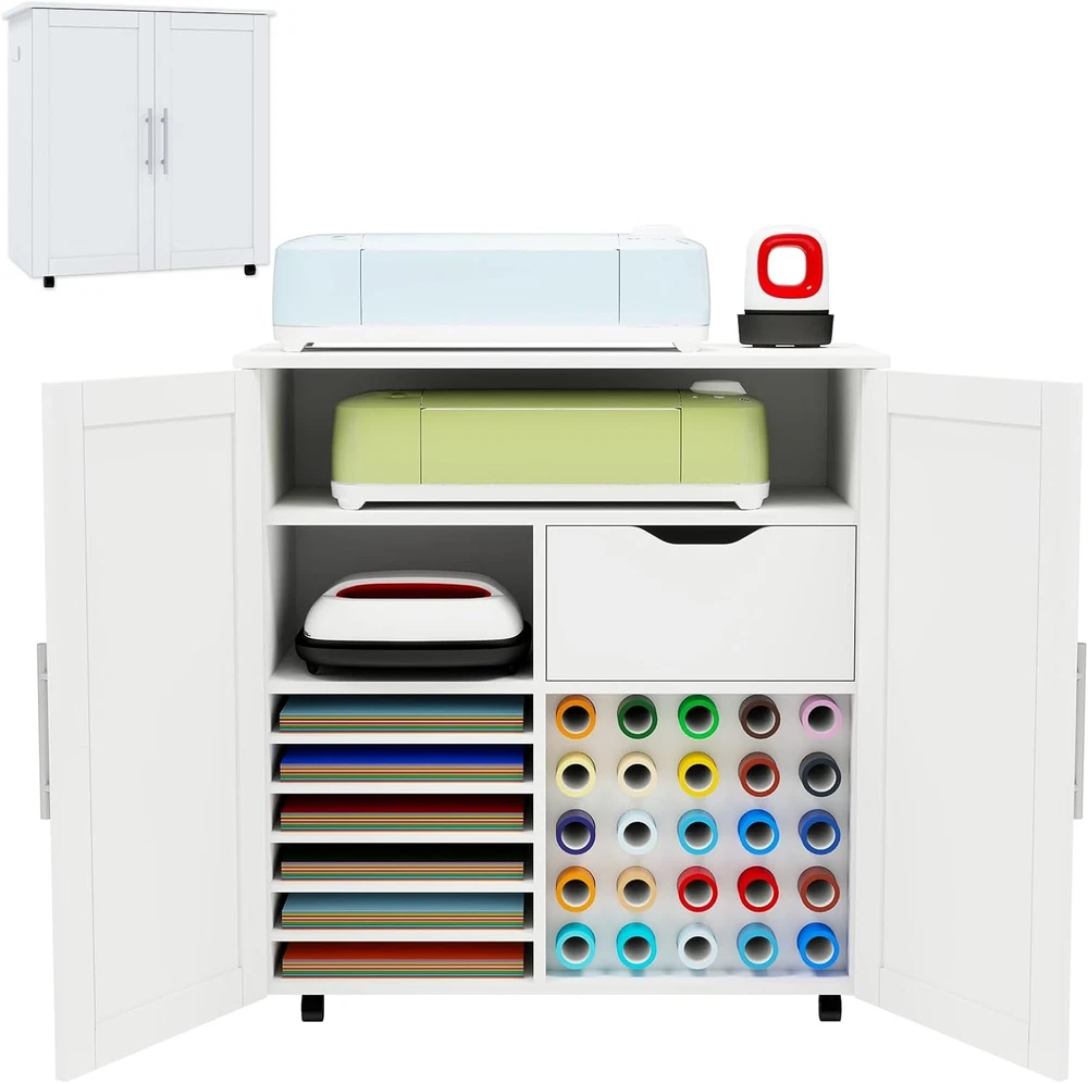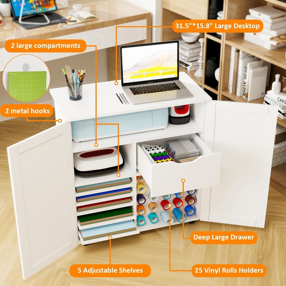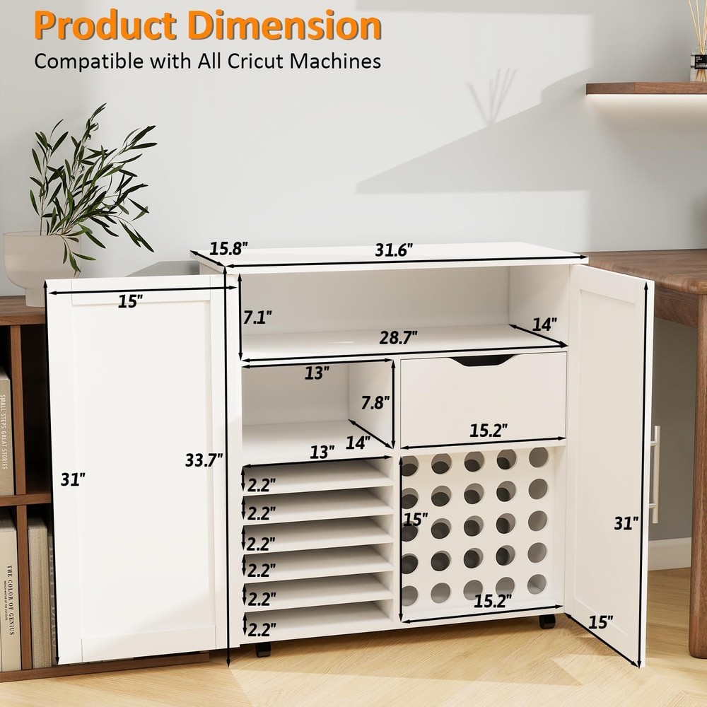 Product Description About this item 【UPDATED BIG SIZE CABINET】- 31.6”L * 15.8”W * 33.7”H; No Squeeze. 【HIDDEN STORAGE, FASHIONABLE CABINET FOR CRICUT】 - Conceals all of the Crafting tools and Materials (for Cricut maker, Vinyl Paper, Heat press etc) when closed, make everything Clean and Tidy and Dust-Free. Double Magnetic Door Design to reach anything you need inside. Nice decor decoration, no one knows it is a cabinet cart for Cricut. 【ULTIMATE STORAGE PLACE, 4 LAYERS 】 - Lots of Storage: ①Top Layer: Super big folding up desktop(31.6” L*15.8” W) for Cricut Machine, Hot Press Machines, Printers + ②Layer 2: Middle Shelf compartment(28.7”L*7.1” H*14”D): to hold spear machines or printers or crochet + ③Layer 3: 1 cabinet(13” L*7.8”H*14”D)for heat press and 1 deep wooden drawer(15.2”L*7.8”H*14”D) for crafting tools and accessories + ④Layer 4: Adjustable Shelves(5shevles adjustable) for Card stock and 12*12 Vinyl Paper, 25 Vinyl Roller Holders. Everything can find its own space. 【2PCS METAL HOOKS, SUPER STRONG】- 2pcs Metal Hooks Secured with Screws(No Plastic Hook, No Glue) for your Ironing Pads and other hanging ITEMS, super strong. 【ROLLING & MOVABLE CARFT CART 】- This Rolling Cart Cabinet for Cricut is a cute rolling craft station and it rolls with 4 wheels 360° rotation and 2 of the wheels are lockable. You can push your for cricut around the room when you work and make it stop anytime. 【UNIVERSAL COMPATIBILITY 】- This Foldable craft Table cart is compatible with all for Cricut machines and Silhouette Cameo series. Such as Cameo 4, for Cricut Maker 3, for Cricut Maker, for Cricut Explore Air 2, for Cricut Explore 3, for Cricut Joy, for Cricut Easy Press Mini, and for Cricut EasyPress 2, etc. [CLEAR DETAILED INSTRUCTION, EASY ASSEMBLE] - This Craft Cart Cabinet Tables are with clear and detailed Step by Step instruction. All parts and accessories can be easily identified with Stickers for easy recognition. 【MOST THOUGHTFUL GIFT】 - Warm Her with a luxury Craft Cart Table - This gift will help her expose her innovation when doing Crafts. So Get this Craft Cart Table as gift for her for Christmas, New Year, Anniversary, Birthday, for Congratulatory Gift or Good Report Card Gift. Organize & Decorate your Craft Room with a Craft Cart Cabinet! Craft Storage Cabinet for Cricut, Concealed Storage. Big Size - 31.6"W x 15.8"D x 33.7"H, No Squeeze. Plenty of Storage - 4 Layers Storage, Big Desk Top, Deep Drawer, Adjustable Shelves, Vinyl Holders. Rolling and Movable - Lockable Wheels , Push and Stop the table freely. Closed as Fashion Cabinet, Open as big Craft Work Station. Close to conceal all of the storage, Open to easily find out all of your craft Stroage. A Nice Home Decor to Decorate your Craft room, studio apartment, Sewing Room, Cloffice. 4 Layers Big Storage- All the machines(Joy,heat press,Cricut Maker) & accessories accomadated. Ultimate Storage for all Craft Tools. Big Compartments and Deep Drawers. 2nd layer Compartment for: spear circut machines or Heat press or Easy press machines. 3nd layer left compartment: For Heat Press. 3nd Layer deep drawer size:15.2”L*7.8”H*14”D for crafting tools and accessories. Adjustable Shelves and 25 Vinyl Holders. 25 Vinyl Holders to hold scrap paper, vinyl paper, Vinyl Rollers, for 12*12 Vinyl Paper, No need squeeze.. Layer Distance adjustable by putting in or taking off the layer table according to your need. 25 Vinyl Holders. Metal Strong Hook and Movable Wheels. Metal Hook, Screwed in to hang. 2pcs Strong Metal Clips to Screw in the side board of the Cabinet. Strong hanging power for Ironing Pad. Fast moving and locking wheels. 4 Rolling Wheels(2 of the wheels lockable) , 360 degree Rotation. You can push your cart around the room freely. Keep your Craft Room Organized and Tidy! Say Goodbye to "Clutter" & " Messy", to more organized and tidy! Decorate your Craft Room, Dinning Room, Study Room. Extra large size for storing a variety of devices. Desk Top - Big Work Station: 31.6” L*15.8” W. 2nd Layer: Middle Shelf compartment(28.7”L*7.1” H*14”D). Layer 3: 1 cabinet(13” L*7.7”H*14”D) for heat press and 1 deep wooden drawer(15.2”L*7.8”H*14”D). Versatile usage: For Cricut Table, works as a heat press table, printer stand, sewing cart, gift wrap cart, or daily storage cabinet. Best Gift Idea -for crafters, hobbyists, DIY Lovers. Great gift for birthdays, holidays, Christmas, and Thanksgiving for her/him, family, and friends. On Aug 6, 2025 at 20:47:20 PDT, seller added the following information:
