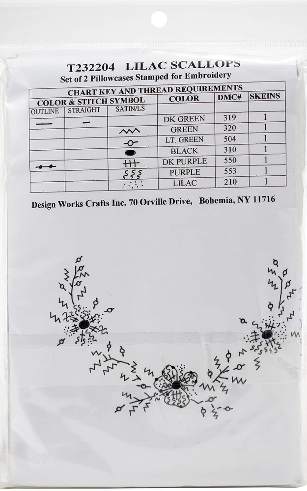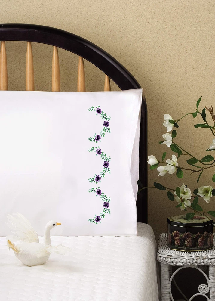 Stamped Pillowcases for Embroidery Kit Includes standard 20” x 30” pillowcases (65% Poly/35% Cotton) and feature designs that are stamped on the fabric. Design is printed with easy to blue ink that will easily wash out. FLOSS NOT INCLUDED. Package includes a suggested floss shopping list or you can use colors to match your personal home decor. Stamped Pillowcases for Embroidery Kit Includes standard 20” x 30” pillowcases (65% Poly/35% Cotton) and feature designs that are stamped on the fabric. Design is printed with easy to blue ink that will easily wash out FLOSS NOT INCLUDED. Package includes a suggested floss shopping list or you can use colors to match your personal home decor. Made in the USA