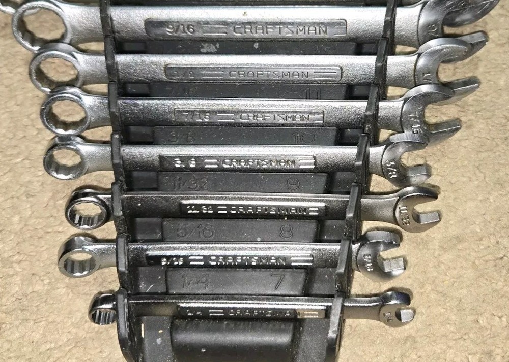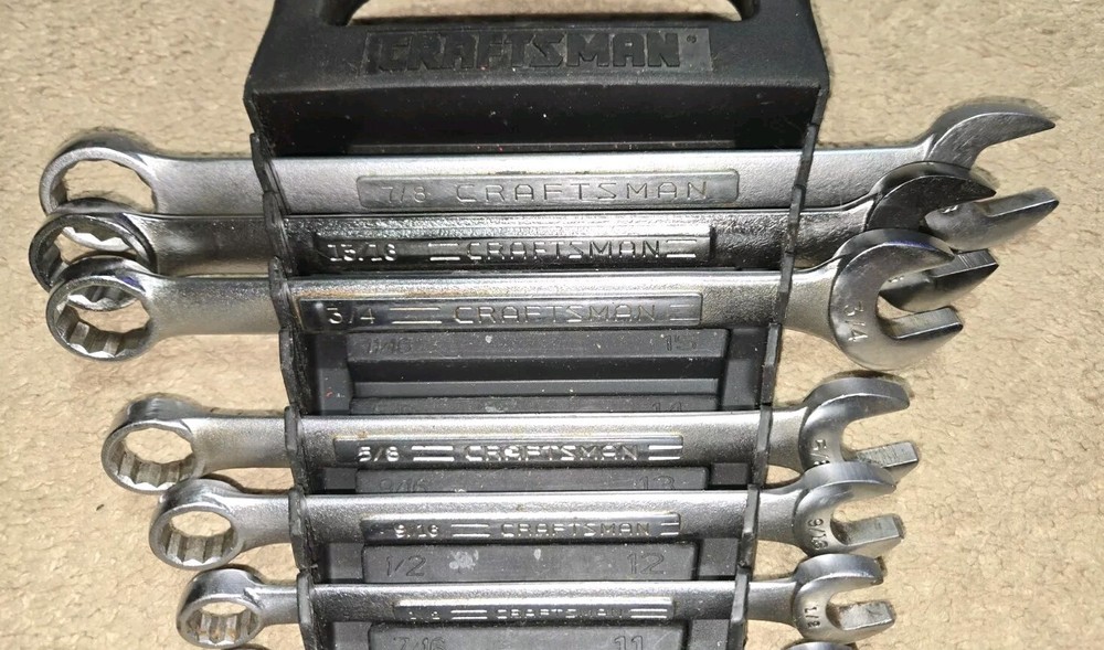 Craftsman Tools Combination Wrench Set of Eleven different sizes, Double-Ended wrenches, 1/4" up to 7/8" (set is missing the 11/16 wrench) and also includes the holder. In used but good condition. Very nice older wrenches in fantastic condition. Let me know if you would like more pictures, each of the wrenches do have individual model numbers stamped on them. Fast free tracked shipping. Any questions, please ask. I try to respond as quickly as possible. As seen in pictures. Feel free to take a look at my other unique items for sale. Combine items and save on shipping. Items ship same or next day as payment, 6 days a week and items in transit also typically travel on Sundays.