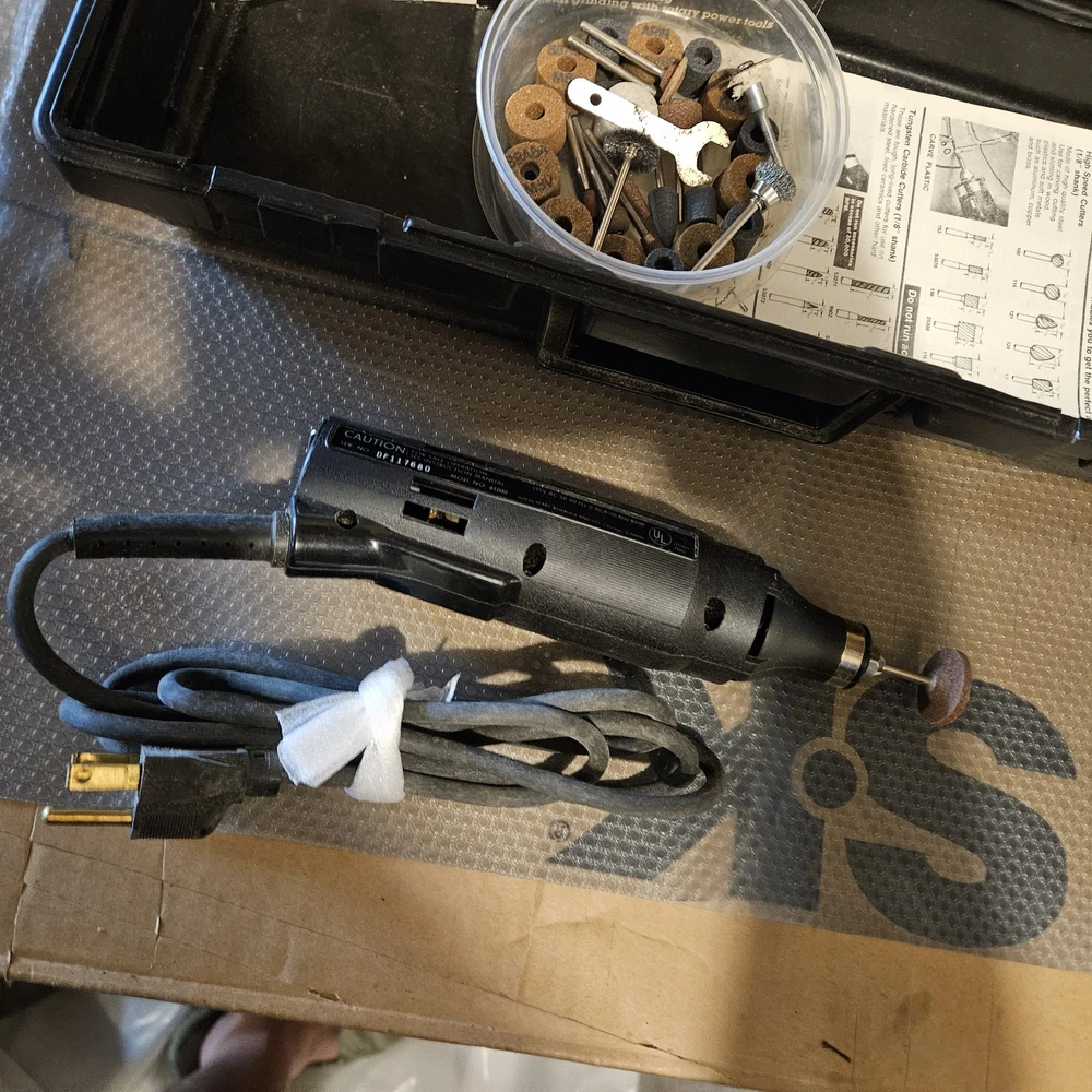 Craftsman Single Speed Rotary Tool (Model 61000) is a corded electric tool kit. It comes with a Craftsman box, accessories, and manual. The tool features variable speed control and a keyed chuck. Made in the United States, this black rotary tool operates at 120V. Tool has been tested and works.