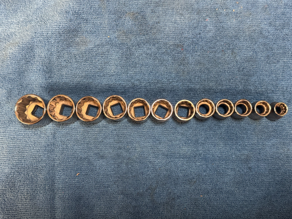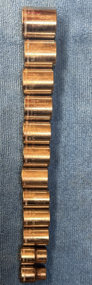 This Is a set of 12 Metric Shallow Sockets with an 3/8-inch Drive. they are 12 point each with a chrome finish. Each socket has owners marks on them, Pictures above. All G series. Made in USA Sizes include: 21mm, 19mm - 9mm. #217