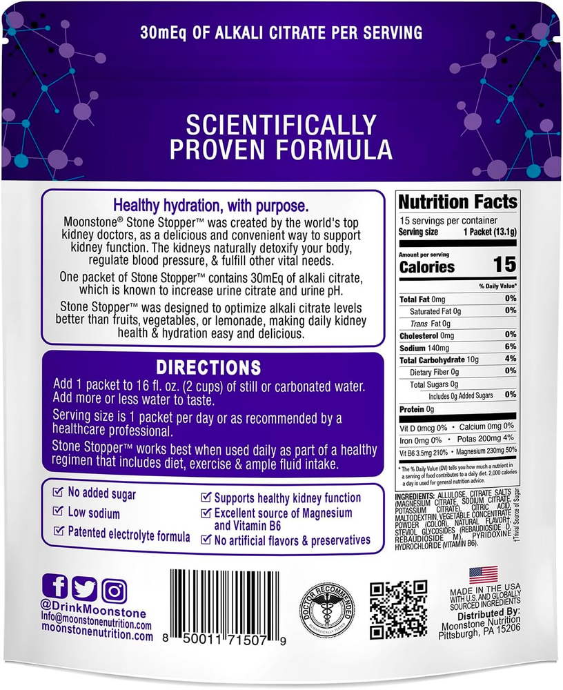 Store New Arrivals Add to Favorite View Feedback Contact Stone Stopper Drink Mix, Cranberry Raspberry, Kidney Stone Prevention, Calcium Oxalate Protector, Developed by Urologists to Improve Hydration and Support Kidney Health, 15 Day Supply Description Unit Count 6.9 Ounce Primary Supplement Type Alkali Citrate Age Range (Description) Adult Product Dimensions 2.87 x 7.44 x 8.9 inches; 7.83 ounces Country of Origin USA Item dimensions L x W x H 2.87 x 7.44 x 8.9 inches Product Benefits Kidney Support Item Weight 0.22 Kilograms Flavor Name Cranberry Raspberry Package Information Packet Flavor Cranberry Raspberry Manufacturer Moonstone Nutrition Item Form Powder Brand Moonstone Size 15 Servings (Pack of 1) KIDNEY STONES PREVENTION IN ONE EASY STEP CREATED BY UROLOGISTS & scientifically formulated to prevent calcium stones & dissolves uric acid & cystine stones PATENTED FORMULA, NO SUGAR ADDED, Rich in alkali citrate, stops the formation of stones and improves kidney health by helping manage urine pH, electrolytes, & citrate levels CLINICALLY TESTED to outperform chanca piedra, kidney cleanse detox & repair and kidney stones dissolver ELECTROLYTE POWDER, 3X more citrates (30mEq) than LithoLyte Water Enhancer. Alkali Citrate Supplement Product Description ABOUT US We offer the best prices around on high quality products. Our E-store includes media such as books, movies, music and games while offering electronics, toys, sporting apparel, clothing, tools, general home, garden items and more. SHIPPING We are always working hard to ensure your package arrives as soon as possible. Please understand that some factors like weather, high postal traffic, and the performance of shipping companies are outside of our control. We offer free shipping to the lower 48 states and ship within 2 business days of payment, usually sooner. We do not accept P.O. Boxes. Please provide a physical address. RETURNS We offer a 30-Day Return Policy on items which you are not completely satisfied with. You have the option for a full-refund or an exchange of the item. No returns are available on items shipped outside of the USA. PAYMENT We accept PayPal. CONTACT US This page content is yet to come Please ad us to your favorite seller and visit again later Thank You CUSTOMER SATISFACTION We try our very best to make sure every customer is completely satisfied. If there's a problem, message us! We're happy to help.