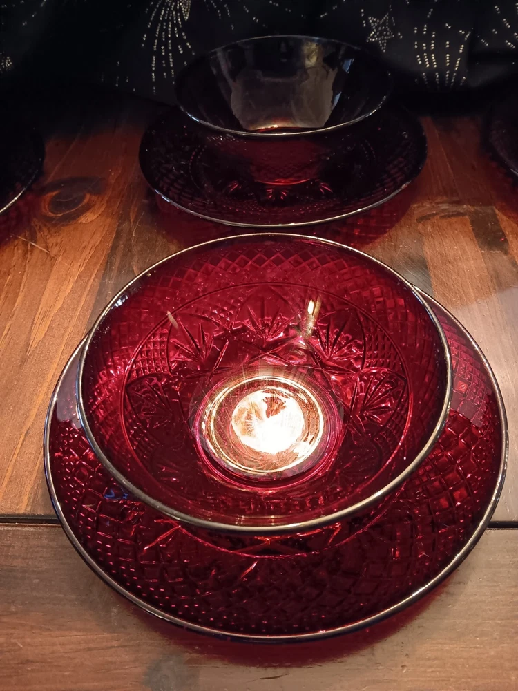 Add a pop of color to your lunch table with these stunning Cranberry Red Lunch Dishes and Salad Bowls. Depression Glass pieces are both functional and stylish. The vibrant red hue will surely make your meals stand out and impress your guests. Perfect for any occasion, these dishes are great for serving salads, soups, and even appetizers. Use them for guests or put them in your collection.