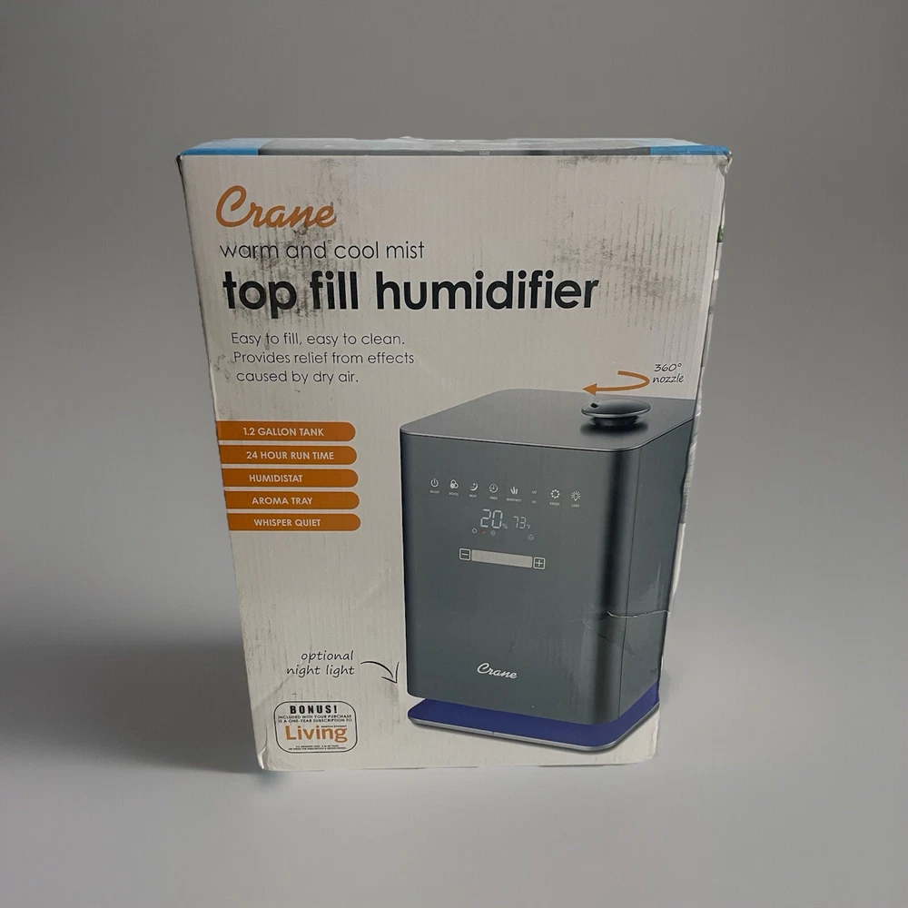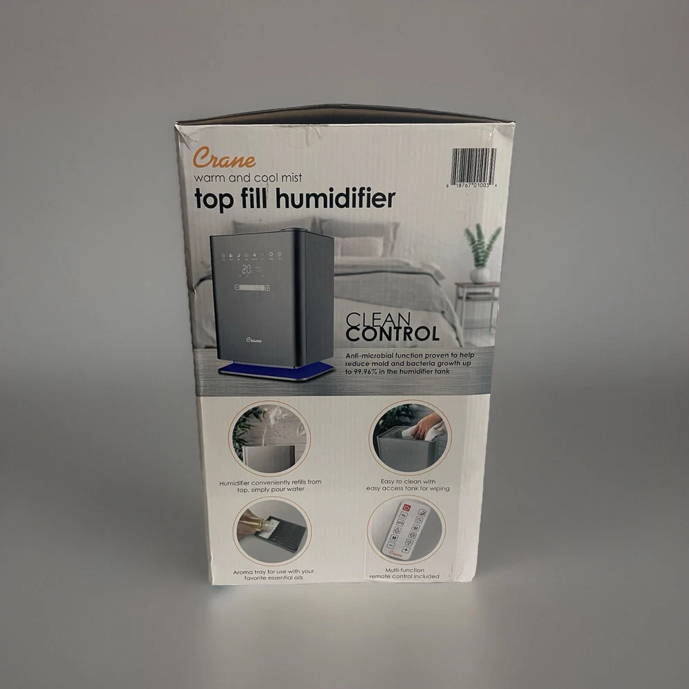 Crane 1.2 Gal. Warm & Cool Mist Top Fill Humidifier with Remote for Medium to Large Rooms up to 500 sq. ft Condition: New The perfect warm and cool mist humidifier to keep your family healthy and happy. With its large 1.2 Gal. accessible tank cleaning is so simple. Not to mention, its mist output runs for over 24-hours in a large size room and it includes an easy to use remote and humidistat. It's built in aroma try make it usable with any essential oils. Crane's premium top fill ultrasonic cool mist humidifier provides up to 500 sq. ft. of coverage and 24 hours of soothing moisture to help relieve the effects of dryness and congestion, helping you and your family to breathe easy and sleep through the night peacefully. VARIABLE SPEED SETTINGS: No matter the humidity level you would like to achieve we've got you covered, the Crane top fill cool mist humidifiers offer variable output settings, an adjustable 360° mist lid, and an included remote control, the mist output is perfect for humidifying rooms up to 500 sq. ft., which is a standard medium to large sized room. ULTRA-VIOLET IONIZING LIGHT: This humidifier is made with clean control anti-microbial material which reduces mold and bacteria growth by up to 99.96%, this unit also has a built in ultra-voilet ionizer light to sanitize the air in the humidifier and add a freshness to the mist. 1.2 GALLON TANK: The 1.2 Gal. tank fits under a standard kitchen or bathroom sink and has an easy to carry handle attached to the tank, the humidifier is equipped an aroma tray so you can add a great aroma to any room without damaging the humidifier. 24-HOUR RUN TIME: The metallic top fill humidifier runs up to 24-hours, so you don't have to worry about running it through the night, Crane's humidifier runs whisper quiet which makes it the perfect option for light sleepers, kids and especially babies, use the built-in night mode to dim all the lights and enjoy uninterrupted sleep, it also is equipped with an automatic shut-off safety feature that turns the unit off when the water runs out. EASY TO CLEAN: Crane's easy to clean humidifier design features a detachable top fill tank with a handle, which is recommended by health professionals for promoting clean humidifier habits, the top and inner tank are removable, giving you access to clean the entire base, we recommend cleaning the humidifier based on frequency of use and provide many educational resources on how to clean your humidifier.
