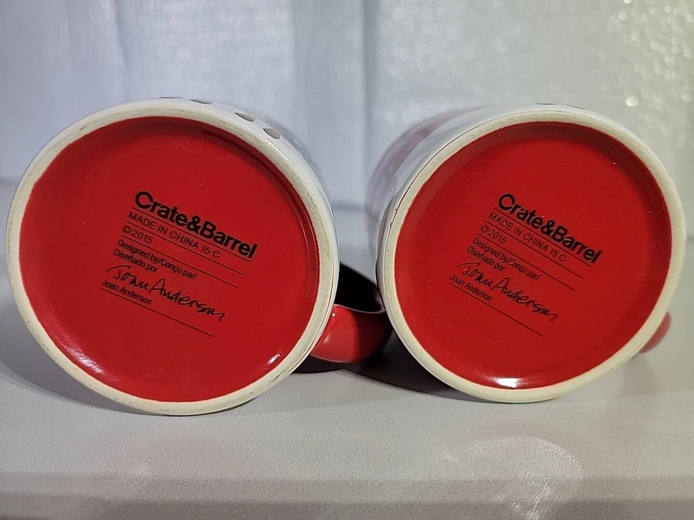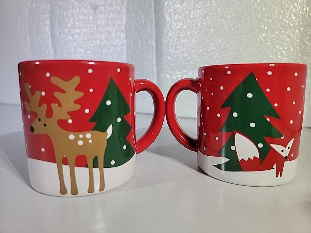 Add some festive cheer to your morning coffee or tea with this charming set of two Crate & Barrel Joan Anderson Christmas kid's mugs. The mugs feature a playful painted design of a fox, deer, and Christmas tree, perfect for the holiday season. Crafted from high-quality ceramic & porcelain, these mugs are both sturdy and stylish. Enjoy your favorite hot or cold beverage with these round mugs, measuring 3 inches in height. The set includes two coffee mugs, making it perfect for sharing with a friend or loved one. These mugs are an original Crate & Barrel product, manufactured in China in 2015. Add some whimsy to your holiday routine with this delightful mug set.