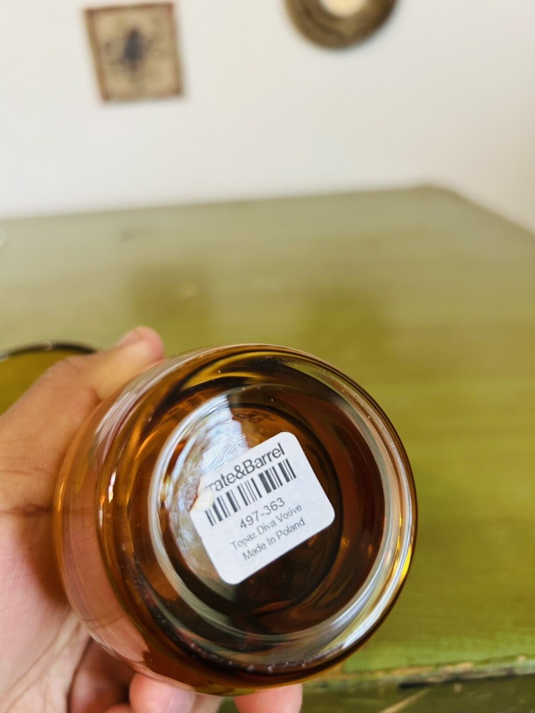 These elegant topaz glass votive holders from Crate & Barrel instantly elevate any space with their rich color and polished finish. The heavy, high-quality glass feels luxurious, and the timeless design works with any decor style—perfect for cozy dinners or relaxing baths. Love the warm glow they create! Made in Poland with impressive craftsmanship.