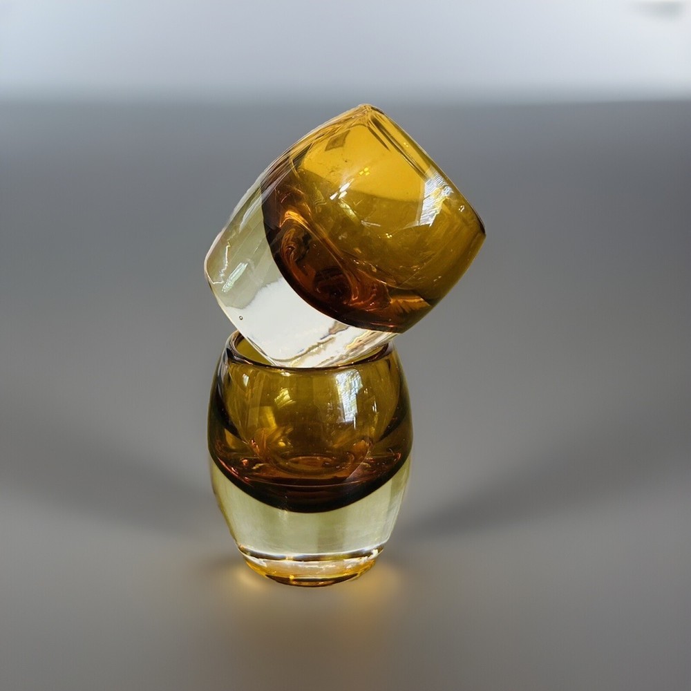 The product is a set of two Diva votive candle holders made of heavy topaz glass, manufactured in Poland by Crate and Barrel. These elegant candle holders are designed to hold votive candles and add a touch of sophistication to any room in your home. The rich glass material and polished finish make them a stylish addition to your home decor, perfect for creating a warm and inviting atmosphere. Amazing pieces of glass Y8