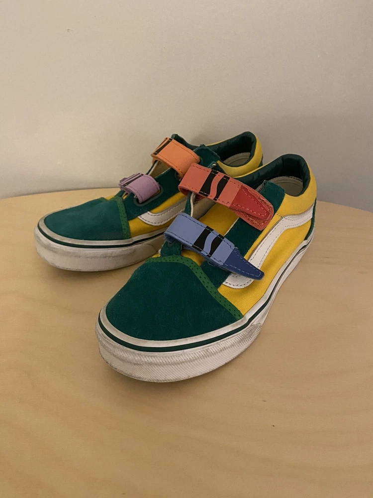 See pictures for wear and discoloration, scuffs on soles Introducing the limited edition Crayola Kids Vans in size 2.5. These colorful sneakers are perfect for school and casual wear, featuring a fun art-inspired design that will make any outfit stand out. With the iconic VANS Old Skool product line, these shoes are sure to be a hit with both boys and girls alike. The multicolored theme and unisex design make these shoes a versatile addition to any wardrobe, while the durable construction ensures they will last through all of their adventures. Whether they're using them for art class or just hanging out with friends, these VANS are the perfect choice for any young fashionista. Don't miss out on this opportunity to add a unique and stylish touch to their shoe collection.