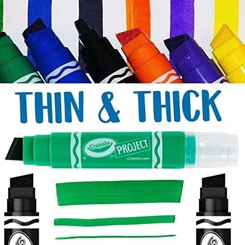 CRAYOLA POSTER MARKERS: Includes 4 XL poster markers for posters, signs, decorations, and more. COLORED MARKERS: Features Black, Green, Blue, and Red markers. EXTRA LARGE: These supersized markers are perfect for a variety of full-coverage art projects and crafts CHISEL TIP: Create thick or thin lines with these bold, chisel tip markers from Crayola. ART SUPPLIES: School projects stand out with these heavy duty Crayola markers in classic colors. WASHABLE MARKERS: Wash clean from skin and most washable clothing. SAFE AND NONTOXIC: Ideal for adults and kids, ages 6 & up.