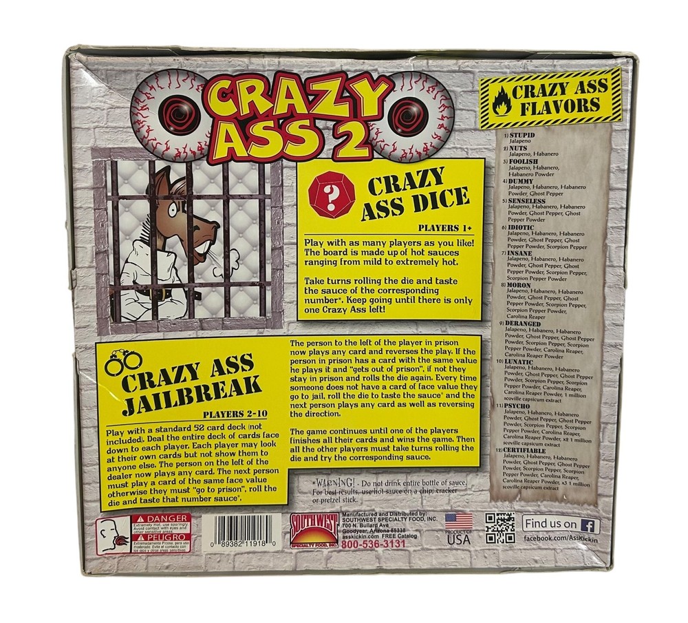 Country/Region of Manufacture:United StatesCalories per Serving:Less Than 50gtin13:089382119180Brand:Southwest Specialty FoodExpiration Date:Future DateColor:MultiCustom Bundle:NoFeatures:This game kit features 12 – .75 ounce bottles of the hottest hotDesign:12-Bottle Hot Sauce Game SetProduct Name:Crazy Ass 2 Hot Sauce Dice Game ChallengeAllergens:UnknownType:12-Bottle Hot Sauce Game SetUPC:089382119180Model:GS648MPN:GS648Product:BBQ & Hot SauceFood Aisle:PantryNumber in Pack:12Style:12-Bottle Hot Sauce Game SetServing Size:Varies Per BottleSize Type:.75 ounce EachNumber of Servings:Varies Per Bottle