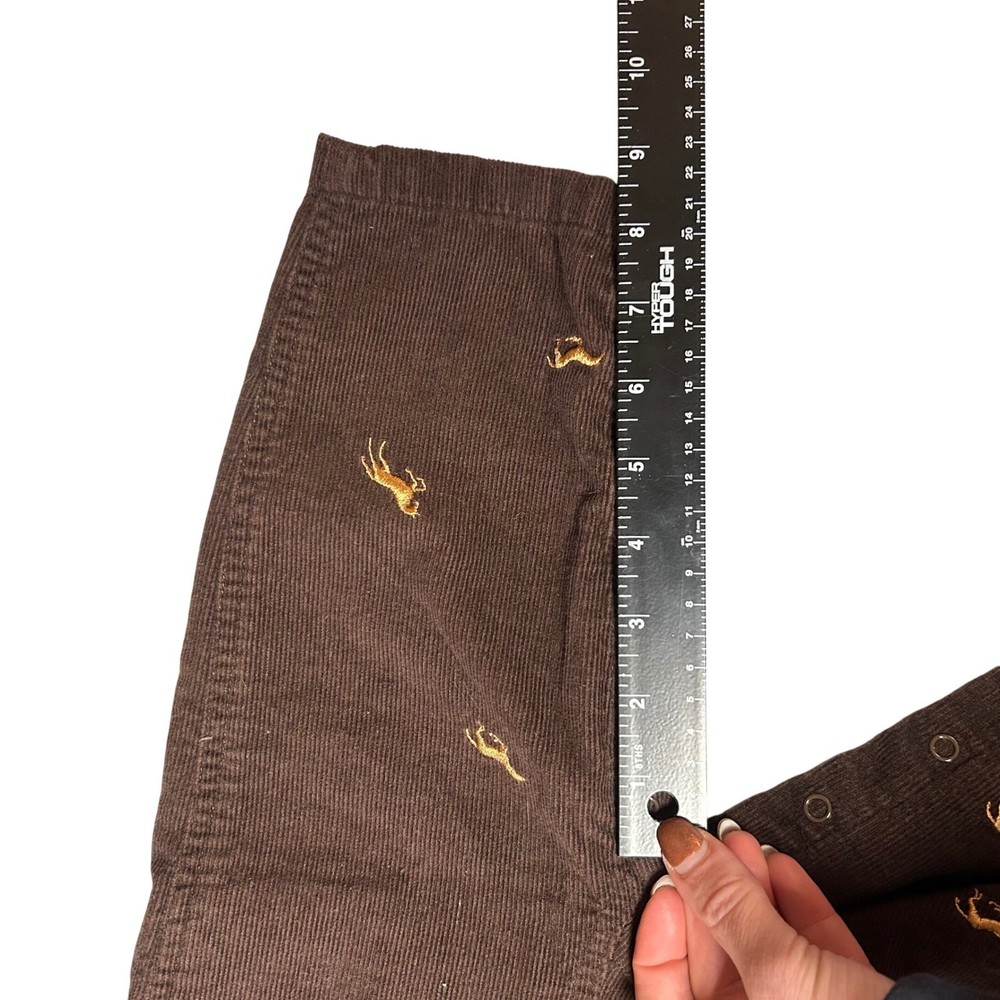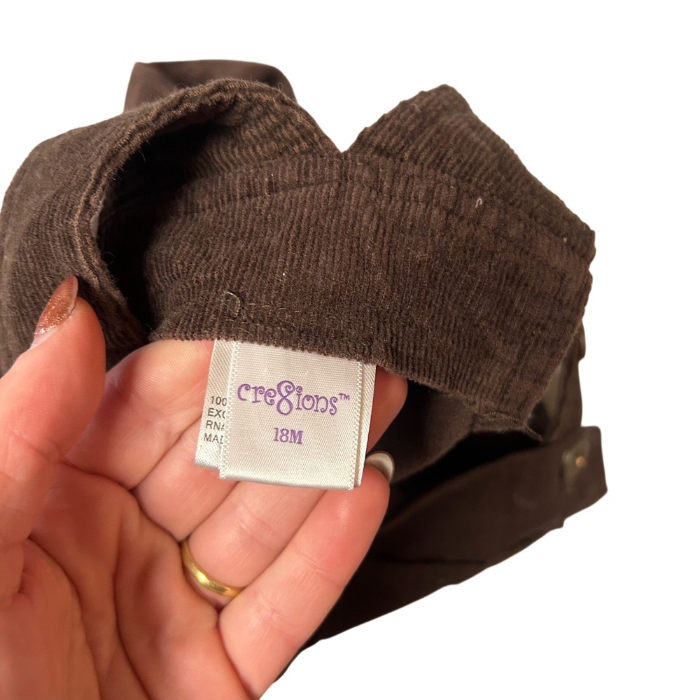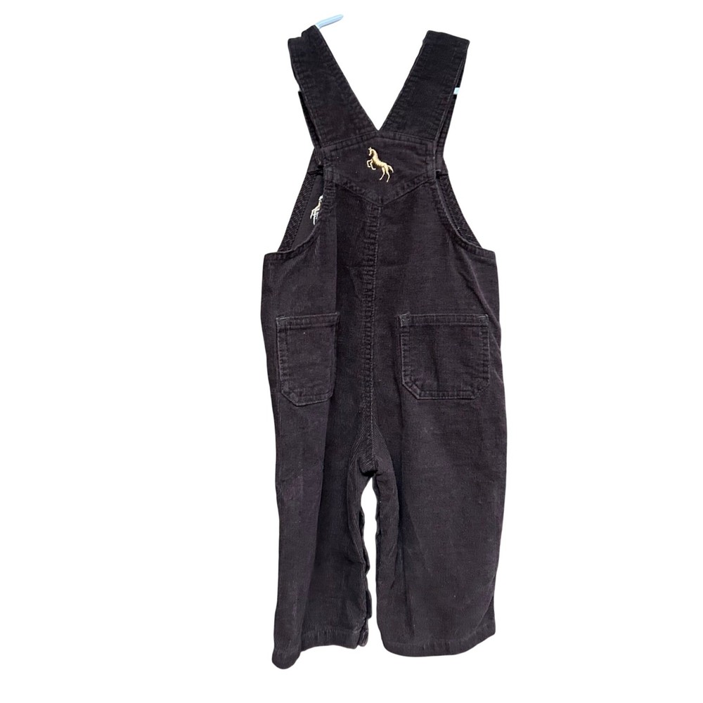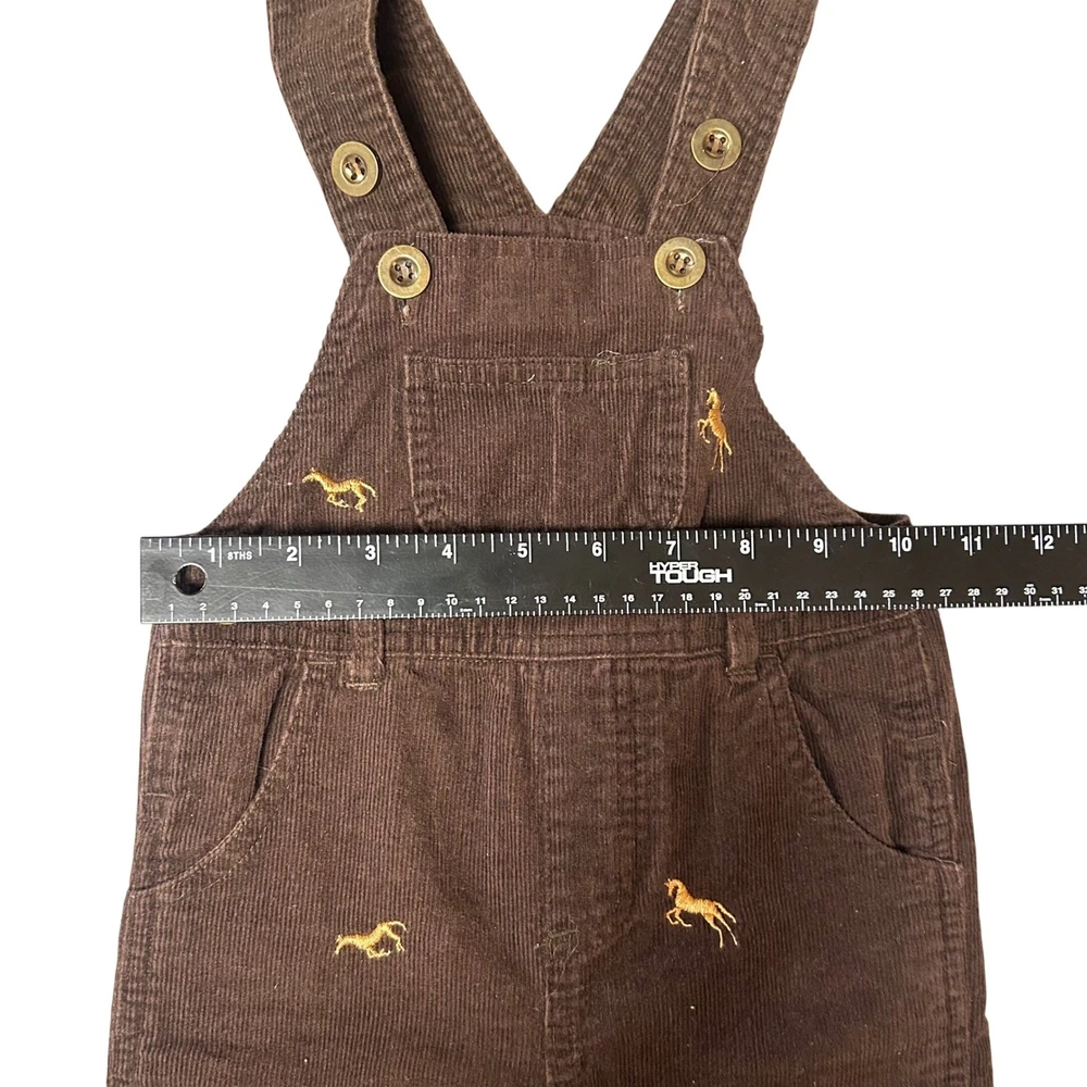 Soft corduroy overalls in a deep chocolate brown feature charming embroidered gold horses throughout. Crafted from 100% cotton, these durable bibs include adjustable button straps, a functional front chest pocket, and convenient snap closures along the inner legs for easy changes. The classic straight-leg silhouette is finished with two back patch pockets and side button entries. Measurements: • Waist: 10" (20" doubled) • Inseam: 9.5" Keywords: Equestrian, Horse Girl, Western, Corduroy, Vintage Style, Fall Fashion, Toddler Overalls, Country, Farmhouse, Rustic, Dark Academia, Preppy, Classic Kids Brand: Cre8ions Type: Overalls Material: 100% Cotton Color: Brown Pattern: Embroidered Horse Sleeve Length: Sleeveless Closure: Button / Snap Pockets: 5-Pocket Design Fabric Type: Corduroy Season: Fall, Winter, Spring Accents: Embroidery, Buttons All items come from a smoke free, golden retriever dog friendly home. All of items unless NWT or Dry Clean Only are washed with Tide. We try our best to disclose any flaws with items, if we miss something please reach out and let us know.