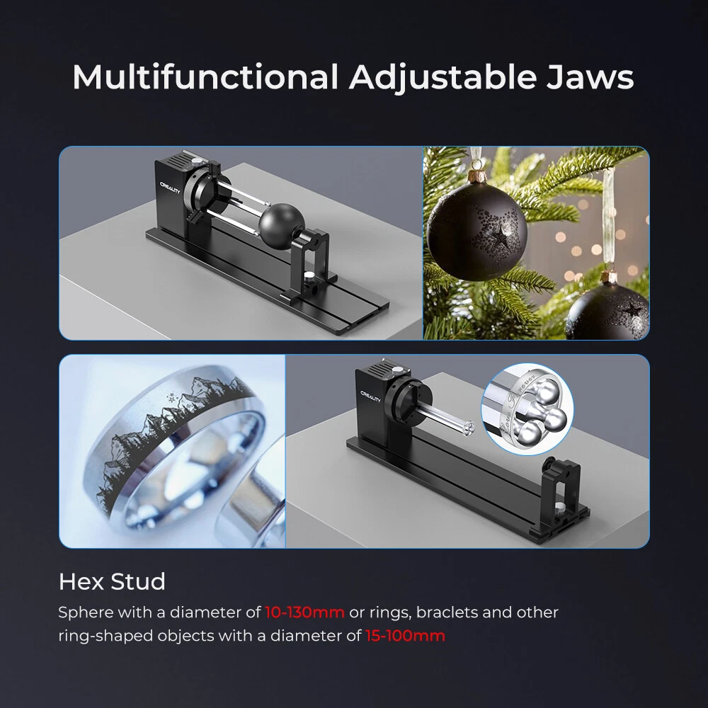 Creality Multi-Functional Laser Rotary Roller Y-axis Jaw Chuck for Engraving About this item: ๐-๐ข๐ง-๐ ๐ ๐ฎ๐ง๐๐ญ๐ข๐จ๐ง๐๐ฅ๐ข๐ญ๐ฒ: The Creality Rotary Kit Pro offers a range of functions, accommodating objects of various shapes with its adjustable jaws. Whether clamping cylindrical objects from the outside (1-110mm diameter), propping up from the inside (25-75mm diameter), or utilizing the hex stud for spheres (10-130mm diameter) or ring-shaped items (15-100mm diameter), this kit caters to diverse needs. ๐๐ซ๐๐๐ข๐ฌ๐ ๐๐ง๐ ๐ซ๐๐ฏ๐ข๐ง๐ ๐๐จ๐ง๐ญ๐ซ๐จ๐ฅ: With precise angular control of 0.225ยฐ, this kit ensures accurate engraving positions. Enjoy stable and accurate performance, carving out perfect images without any displacement. ๐๐๐ฌ๐ฒ ๐๐ฅ๐ฎ๐ ๐๐ง๐ ๐๐ฅ๐๐ฒ ๐๐๐ญ๐ฎ๐ฉ: Get started effortlessly with the Creality Rotary Kit Pro, which is ready to use straight out of the box. Simply connect it to your machine for quick and hassle-free setup. Compatible with popular engraving software such as Lightburn & LaserGRBL, you can start your projects without delay. ๐๐ข๐๐ ๐๐จ๐ฆ๐ฉ๐๐ญ๐ข๐๐ข๐ฅ๐ข๐ญ๐ฒ: The Creality Rotary Kit Pro isn't limited to Falcon/Falcon2 series models; it's compatible with 95% of laser engravers on the market. Whether you own XTOOL, ORTUR, Sculpfun, Genmitsu, LONGER, ATOMSTACKT, wotrees, ATEZR, or other brands, rest assured this kit will seamlessly integrate with your setup. ๐๐ง๐ก๐๐ง๐๐๐ ๐ ๐ฅ๐๐ฑ๐ข๐๐ข๐ฅ๐ข๐ญ๐ฒ ๐๐ง๐ ๐๐๐๐ฉ๐ญ๐๐๐ข๐ฅ๐ข๐ญ๐ฒ: Experience enhanced flexibility with the Creality Rotary Kit Pro, allowing you to tackle a wide range of engraving projects with ease. Its compatibility and versatility make it an indispensable accessory for both beginners and seasoned professionals alike. Specification: For: Creality laser engravers and cutters, and other machine Dimensions: 360*122*100mm Diameter Range: Clamp from the outside Cylindrical objects with a diameter of 1-110mm Prop up from the inner side Cylindrical objects with a diameter of 25-75mm Hex stud Sphere with a diameter of 10-130mm or rings, braclets and other ring-shaped objects with a diameter of 15-100mm Applicable Works: 1.cylinders: such as thermos cups, mugs 2.cone: such as goblets, conical bottles 3.hemispheres: bowls 4.spheres: such as crystal balls, oranges 5.Ring body: such as rings, bracelets Packing List: 1 x Creality Rotary Kit Pro Kit More Details: Payment Delivery Terms of sales About us Contact us Payment We accept payment via Payoneer. Please accomplish payment within 5 business days after you won the item. Delivery All your orders will be shipped within 1-2 business days and updated tracking info. Please make sure your address is full and correct, so that your order will be soon shipped and delivered smoothly. Most orders will adopt standard shipping, which usually needs 3-5 biz days. Any PO BOX addresses need to be confirmed if delivery or not. Terms of sales 1-month-returning for all orders after they are proved defective/damaged/faulty (videos or photos about it are preferred). Address on the package is not the return address, please email us firstly to get the correct return address. About us * Founded in 2014 by four 3D printing enthusiasts, Creality is a top global manufacturer of 3D printers. Our range of products includes DIY and resin 3D printers, 3D scanners, laser engravers, and filaments. Currently we host four brands of 3D printers: Creality as the master brand, and the three sub-brands of Ender, HALOT and Sermoon. Capitalizing on our innovatively leading technologies and products, we also offer consumer and professional printing solutions for makers, designers, schools and enterprises. Contact us Customer Service Hours: 9:00AM - 18:00PM BST (Beijing Standard Time) . You can also contact our official website customer support.