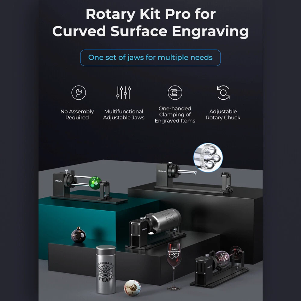 Title Resin Other K1 Series DIY Printer Laser Engraver 3D Printer Accessories 3D Printer Filament Lcd Printer 3D Scanner Creality Rotary Kit Pro 3 in 1 Laser Rotary Roller for Most Laser Engraver R3Z8 Features: Multifunctional Adjustable Jaws: One set of adjustable jaws can handle objects of all shapes with external clamping and internal support. One-handed Clamping of Engraved Items: The set screws help stabilize the rotary chuck, making it easy to clamp engravings with one hand without requiring multiple operators. Adjustable Rotary Chuck & Anti-slip Soft-pad: The rotary chuck enables 360° of rotating engravin. It can be adjusted to fit large, tiny objects with the hex stud and jaws. The soft pad enhances friction and protects fragile iteams from damage, ensuring quality engraving results. Wide Compatibility :Creality Rotary Kit Pro is suitable for 95% of the laser engravers on the market, including Creality, XTOOL, ORTUR, Sculpfun, Genmitsu, LONGER, ATOMSTACK, Twotrees, ATEZR, etc. Specification: For: Creality laser engravers and cutters, and other machine Dimensions: 360*122*100mm Diameter Range: Clamp from the outside Cylindrical objects with a diameter of 1-110mm Prop up from the inner side Cylindrical objects with a diameter of 25-75mm Hex stud Sphere with a diameter of 10-130mm or rings, braclets and other ring-shaped objects with a diameter of 15-100mm Applicable Works: 1.cylinders: such as thermos cups, mugs 2.cone: such as goblets, conical bottles 3.hemispheres: bowls 4.spheres: such as crystal balls, oranges 5.Ring body: such as rings, bracelets Packing List: 1 x Creality Rotary Kit Pro Kit Product Description: Payment Delivery Terms of sales About us Contact us Payment We accept payment via Payoneer. Please accomplish payment within 5 business days after you won the item. Delivery All your orders will be shipped within 1-2 business days and updated tracking info. Please make sure your address is full and correct, so that your order will be soon shipped and delivered smoothly. Most orders will adopt standard shipping, which usually needs 3-5 biz days. Any PO BOX addresses need to be confirmed if delivery or not. Terms of sales 1-month-returning for all orders after they are proved defective/damaged/faulty (videos or photos about it are preferred). Address on the package is not the return address, please email us firstly to get the correct return address. About us * Founded in 2014 by four 3D printing enthusiasts, Creality is a top global manufacturer of 3D printers. Our range of products includes DIY and resin 3D printers, 3D scanners, laser engravers, and filaments. Currently we host four brands of 3D printers: Creality as the master brand, and the three sub-brands of Ender, HALOT and Sermoon. Capitalizing on our innovatively leading technologies and products, we also offer consumer and professional printing solutions for makers, designers, schools and enterprises. Contact us Customer Service Hours: 9:00AM - 18:00PM BST (Beijing Standard Time) . You can also contact our official website customer support.