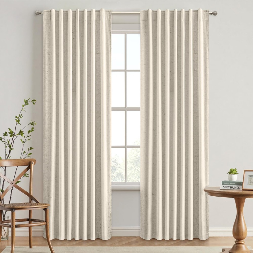 Our premium blackout curtains combine luxury with durability, perfect for peaceful sleep or stylish decor. Crafted from high-quality fabric, they block 100% sunlight, reduce noise, protect privacy, and regulate temperature. With 3-in-1 top design (pleat tape, back tab, rod pocket) and 32 hooks, they offer versatile hanging options. The curtain panels fit most windows, enhancing any room. Easy to care for - machine wash cold, tumble dry low, and low-temp iron. Upgrade your home with these stylish, functional curtains today. 100% Blackout Curtains: Our blackout curtains can block 100% of sunlight, reduce noise, and protect privacy. This blackout curtain can balance the temperature, so you won't feel hot in summer and cold in winter. At the same time, protect your furniture, flooring, and other items from sunlight damage. Premium Quality Material: These blackout curtains are made of high-quality linen fabric, which not only feels good, but also durable. Whether you want to ensure a peaceful sleep in the dark or create a fashionable focal point in your living space, these blackout curtains are the ideal choice. Multiple Hanging Options: Each package includes 32 HOOKS. Each curtain panel has 3-in-1 top style design: pleat tape, back tab and rod pocket. Curtains also can be hung with clip rings. 5 ways meet your various needs. Complete Package: Our package includes 2 curtain panels, each measuring 52" wide and 84" long. Perfect size to make your windows stand out and upgrade any room in your home Easy Care: If there are wrinkles when opening the packaging. Cool iron on front side as needed. Don't iron on the back side of 100% Blackout White Coating Layer. Machine washable in cold water and do not bleach, tumble dry low. Any questions please feel to .