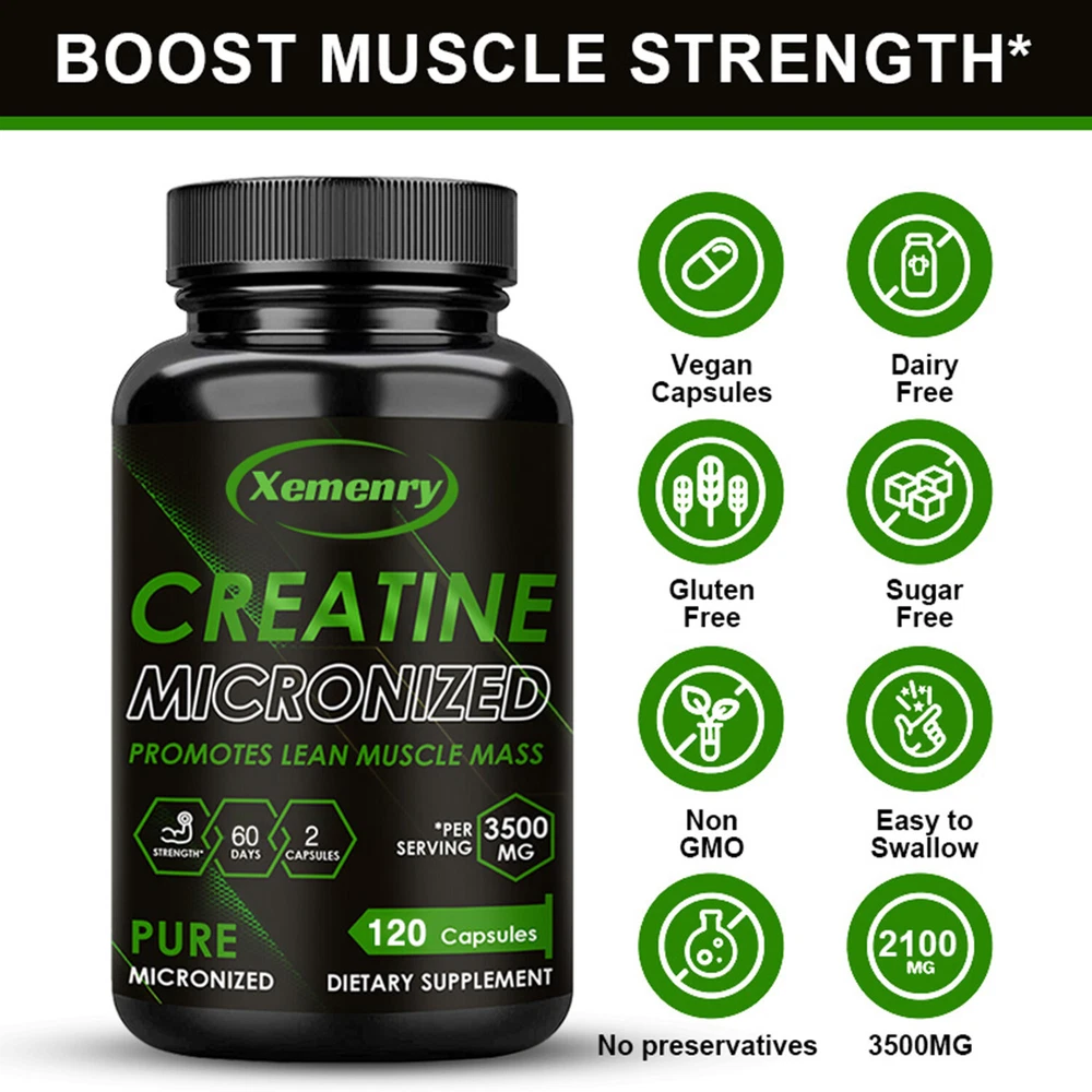 Effects: Testosterone Booster, Energy & Endurance Ingredients: Creatine Monohydrate Directions: Take 2 capsules once daily after a meal. Shipping: Ships within 48 hours on working days. Shelf life: 2 years Description: Super Absorption: Micronized Creatine is micronized by reducing larger creatine molecules into smaller particles to optimize bioavailability and absorption. Thereby increasing muscle strength and energy. Increases Strength and Endurance: When your body naturally produces creatine, a high-quality creatine supplement increases the cellular energy of your muscles. By adding power creatine to your workout routine, you can lift heavier weights to accelerate muscle growth and build strength. Enhances brain function: Creatine has been shown to improve not only athletic performance, but also mental alertness and working memory. With greater mental acuity, you can enjoy more reliable reaction times and be more productive outside of the gym. Document