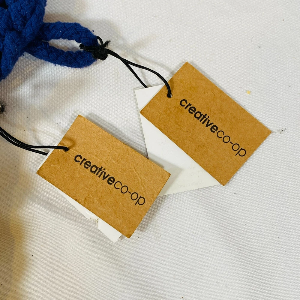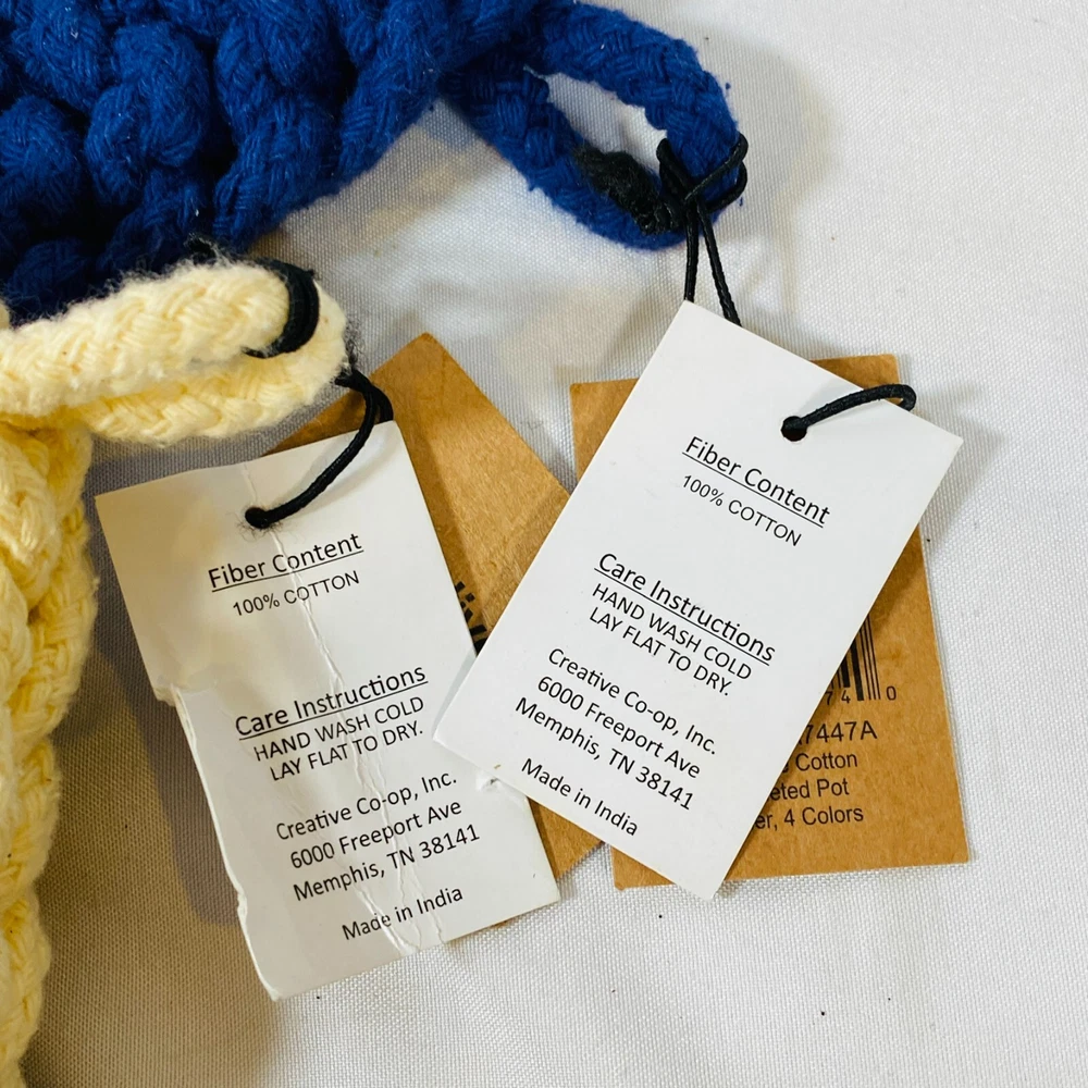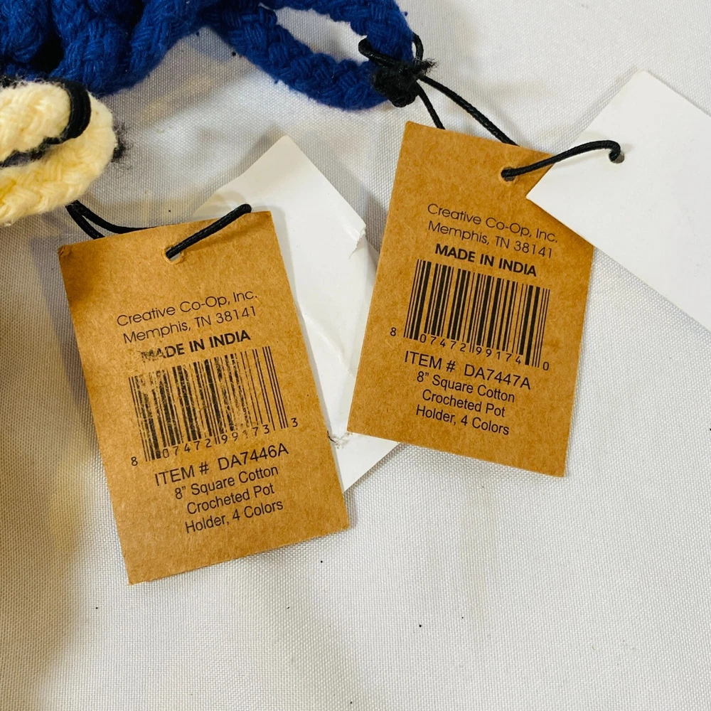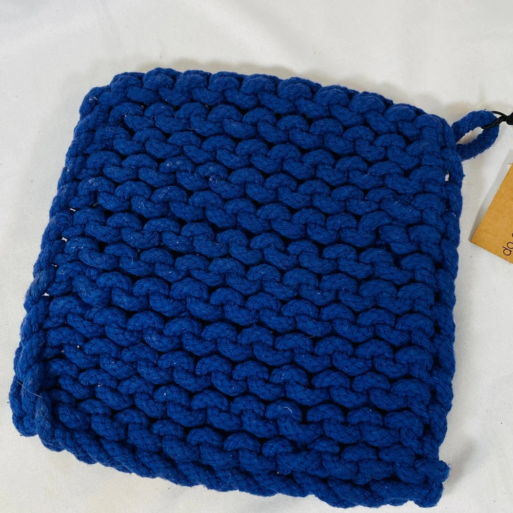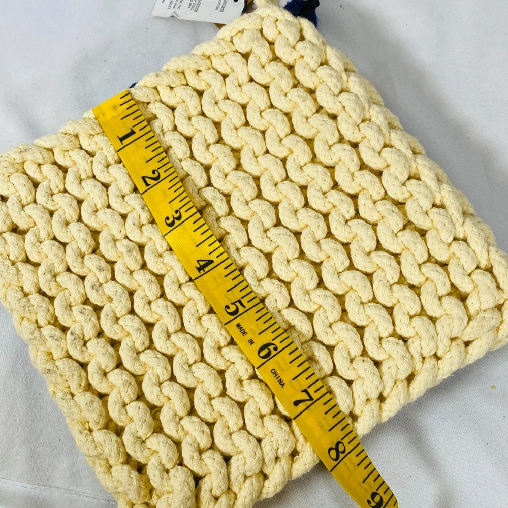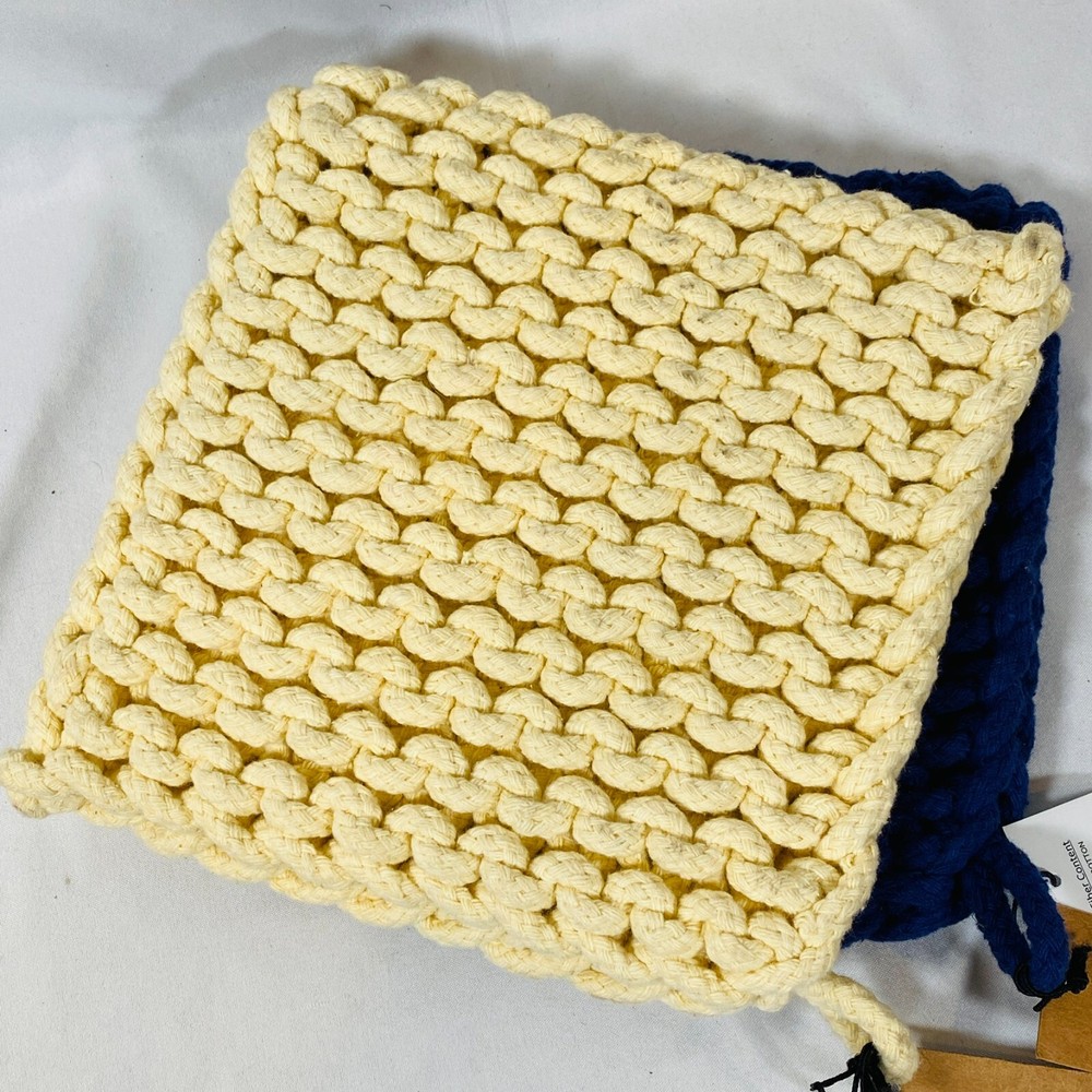 Set of 2 Creative Co-Op 8" Square Cotton Thick Crocheted Pot Holders. Includes 1 Cream/Beige + 1 Navy Blue Trivet-Style Potholders, made out of 100% Cotton. New with tags, but they were stored together so the cream one has what appears to be blue dye transfer from the other one. As they still have the tags attached, I haven't attempted to clean them, so it may wash out easily, not sure, sold as is. Either way, they are lovely thick potholders that will serve you well! Please see all pictures for exact cosmetic condition and other details, as they are part of the description as well, and ask any questions before purchasing. We are a husband and wife team with a growing family, and greatly appreciate your support of our small business. Please browse our eBay store for a variety of other kitchen equipment. We hope you enjoy this set!