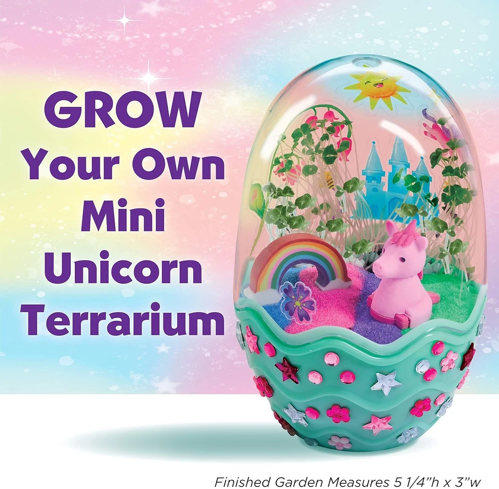 Creativity for Kids Mini Garden: Magical Unicorn Terrarium Kit - Product Details Brand: Creativity for Kids Age Range (Description): Kid Color: Unicorn Theme: Fantasy Cartoon Character: Unicorn Item dimensions L x W x H: 4 x 4.75 x 7 inches Material: Plastic Seasons: All Seasons Included Components: plastic egg terrarium, potting mix, water dropper, sticker sheet, colored sand (red, blue, orange), white gravel, unicorn figure, rainbow figure, adhesive back rhinestones Item Weight: 0.27 Kilograms Number of Pieces: 1 Paint Type: Decorative Style: Unicorn Model Name: Unicorn Special Feature: Non Toxic Art Craft Kit Type: Mini Garden Craft Kit Manufacturer: Creativity for Kids Product Dimensions: 4 x 4.75 x 7 inches Item Weight: 9.6 ounces Item model number: 6242000 Manufacturer recommended age: 6 years and up Release date: January 3, 2020 UNICORN GIFTS FOR GIRLS: Decorate, plant, and grow your own magical terrarium in a unicorn egg-shaped mini garden. The craft kit for kids contains quick-growing chia seeds and fun decorations that will bring your unicorn craft to life (Unicorn Garden measures 5.25” h x 3” w.) UNICORN TERRARIUM KIT: Give the gift of creativity with the perfect unicorn toy for girls ages 6-8. Everything you need to grow a unicorn terrarium kit for girls is included, just add water! Complete craft kit includes potting mix, quick-growing chia seeds, unicorn stickers, dimensional accents, fun mini unicorn figures, and colored sand KIDS CRAFT KIT: Explore the wonder of nature and science with a mini terrarium that makes a great present for 7 year old girls. This STEAM science activity makes a unique gift for kids with an easy and fun-to-do science experience. Spark curiosity, inspire creativity, and wonder about the magic of unicorns while creating a unique kids craft GIRL TOYS: Growing your own unicorn garden is a fun kids toy that encourages independent play while developing nurturing skills, responsibility, and patience. Since 1976, Creativity for Kids has proudly made fun and creative experiences today to nurture kids' confidence for life. This unicorn craft for kids is recommended for ages 6-8+ Experience the wonder of nature all year as you take the fun of gardening indoors with the Creativity for Kids Magical Mini Garden Kit – Unicorn Egg Terrarium. Mini Gardening is a unique, fun experience that combines both arts and crafts with science (STEAM) as your child creates their own mini unicorn garden. A great unicorn gift for girls ages 6-8+! Perfect for beginners, this unicorn terrarium kit for girls kit features quick-growing chia seeds that sprout within 3-5 days! Just add water for a magical science experience. Our guaranteed-to-grow terrarium kit for kids means a green thumb for everyone! The kids craft contains everything you need to decorate, plant, and grow your own unicorn garden. Complete gardening kit and kids toy include potting mix, quick-growing chia seeds, unicorn-themed stickers, dimensional accents, fun minis - rainbows, and decorative sand. The potting mix is vermiculite, and all seeds are from and packaged in the USA. Mini gardens make the perfect unique gift for kids or presents for 7 year old girls. This unicorn craft activity makes the perfect addition to Easter Baskets, stocking stuffers, small gifts for kids, birthday gifts and so much more! Unicorn toys allow for indoor gardening - anytime. Let creativity and self-expression take the lead as you decorate your magical unicorn garden. Colorful unicorn stickers and accents bring your garden to life and spark creativity and wonder of magical unicorns. Growing a mini garden is a unique activity, and an opportunity to develop nurturing skills, responsibility, and creative confidence! Since 1971, Creativity for Kids has proudly created unique craft experiences for children to create, explore and build creative confidence for life. This unicorn girls toy features non-toxic materials that are kid-friendly and recommended for ages 6-8+. For best results, do not put your terrarium in direct sunlight. Completed unicorn garden measures 5.25” h x 3” w.