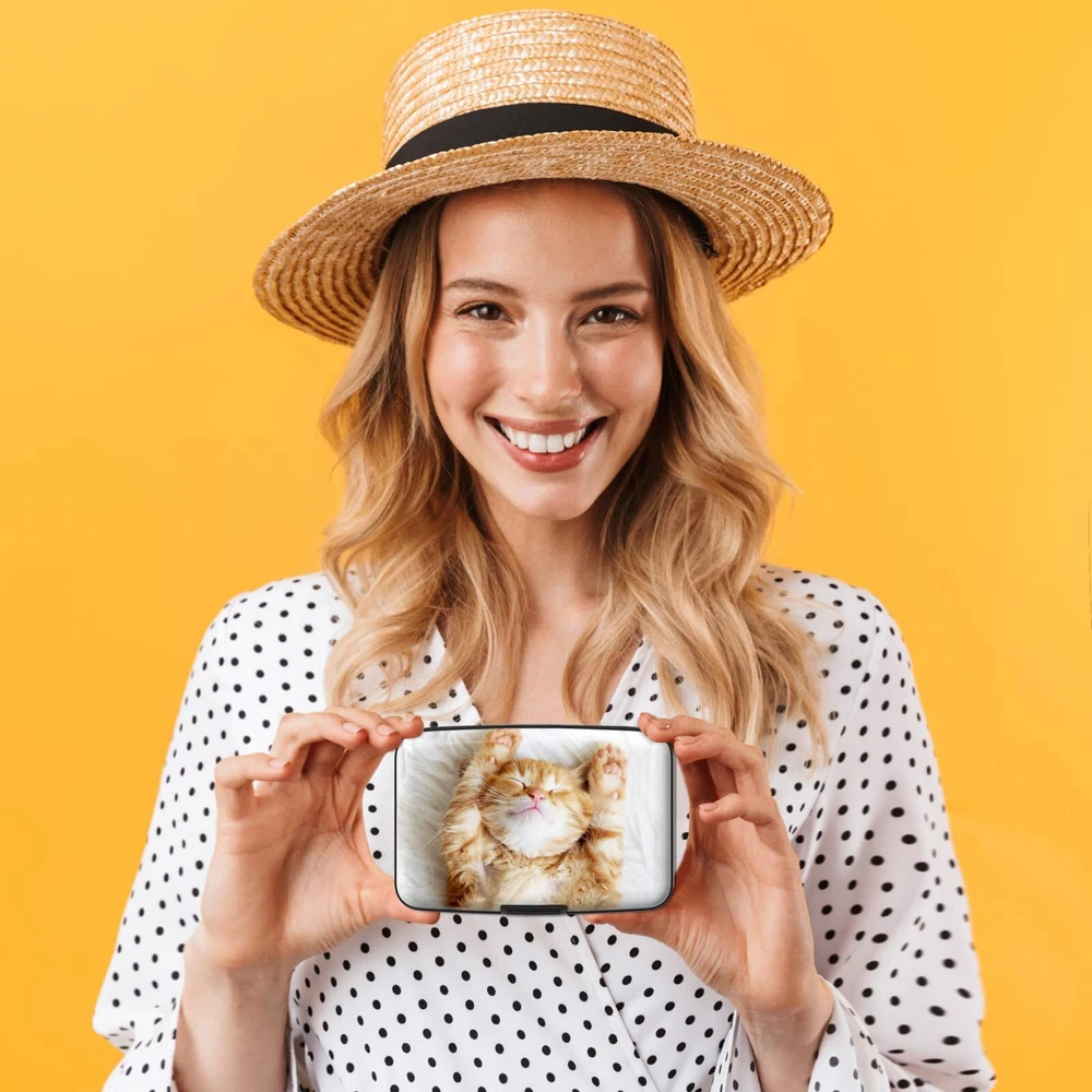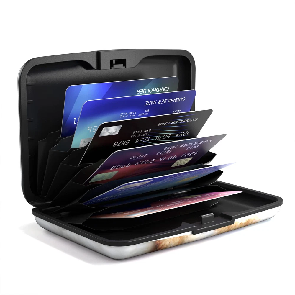 【Compact Size】This cute card holder wallet measures 4.3" x 3", only 0.8" thick, extremely convenient to be carried around in your pocket or slip into your purse. Slim and lightweight, perfect for everyday use and travel. A must have when on vacations or traveling overseas. 【Large Capacity】Slim card holder wallet is designed with 6 accordion slots to organize your credit cards, ID cards, metro cards, business cards, driver's licenses and more. Small size but large capacity, capacity for up to more than 10 credit cards or more than 20 business cards. 【Privacy Protection】Specialized rfid blocking aluminum shell designed to protect your personal information on the cards from unauthorized scanning. Rfid card holder keeps your vital information in rfid cards from being stolen, your bank debit, ID, ATM cards be protected at always. 【High Quality Materials】Made of high quality aluminum materials and Environmentally friendly ABS plastic, wear-proof, sturdy and durable. Premium clasp closure is easy to open and close, latches safely and securely when not in use. Rounded corner wouldn't damage on your clothes. 【Great Gift Idea】Each metal card holder wallet features brilliant illustration, designed to add a touch of art to lifestyle. Multiple style to choose such as relaxed boho, elegant floral, modern marble and cute animals. A great gift idea for women, men, girls, Mom, Dad, Birthday, Back to School, Valentine's Day, Easter Day, Mother's Day, Labor Day, Halloween, Thanksgiving Day and Christmas.