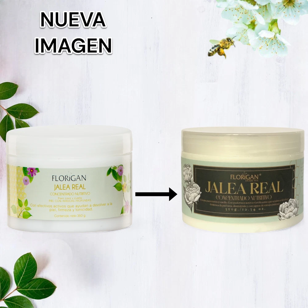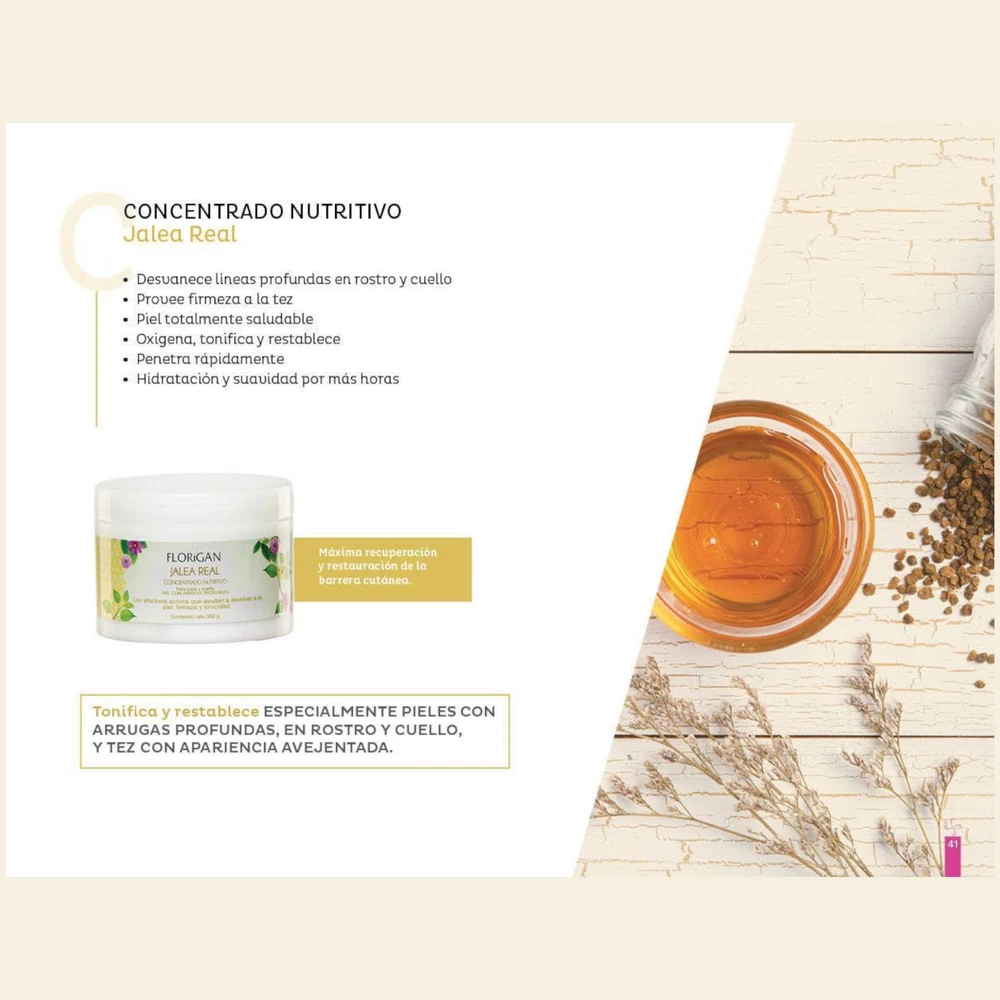 Este fluido natural elaborado por las abejas, es considerado desde la antigüedad como un elixir para la juventud. Otorga vitalidad y nutrición a la piel y es muy efectivo para contrarrestar los signos de la edad. CONCENTRADO NUTRITIVO Jalea Real Piel con arrugas profundas Tonifica y restablece Crema auxiliar para desvanecer líneas profundas en rostro y cuello. Provee firmeza a la tez. Penetra rápidamente en la piel. Otorgándole hidratación, suavidad, oxigenación y un estado saludable. 350ml. Ingredientes naturales que contienen beneficios incomparables. Las propiedades esenciales de la placenta fortalecen, brindan elasticidad a la piel y ayudan a eliminar arrugas. La concha nácar es un excelente regenerador para el cutis. Cutis marchito Protege y devuelve la humedad Intensiva y prolongada provisión de humedad. Ayuda a evitar la presencia de manchas y pecas. Previene el envejecimiento. Retira gradualmente arrugas y líneas de expresión. Unifica el tono de piel. Reanima, repara y protege de los rayos solares. 350g.