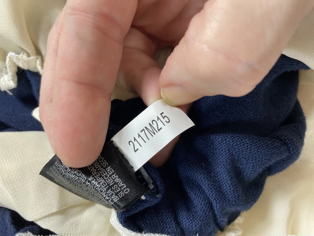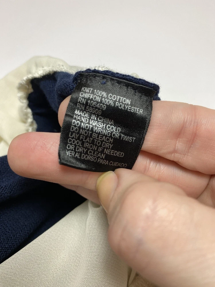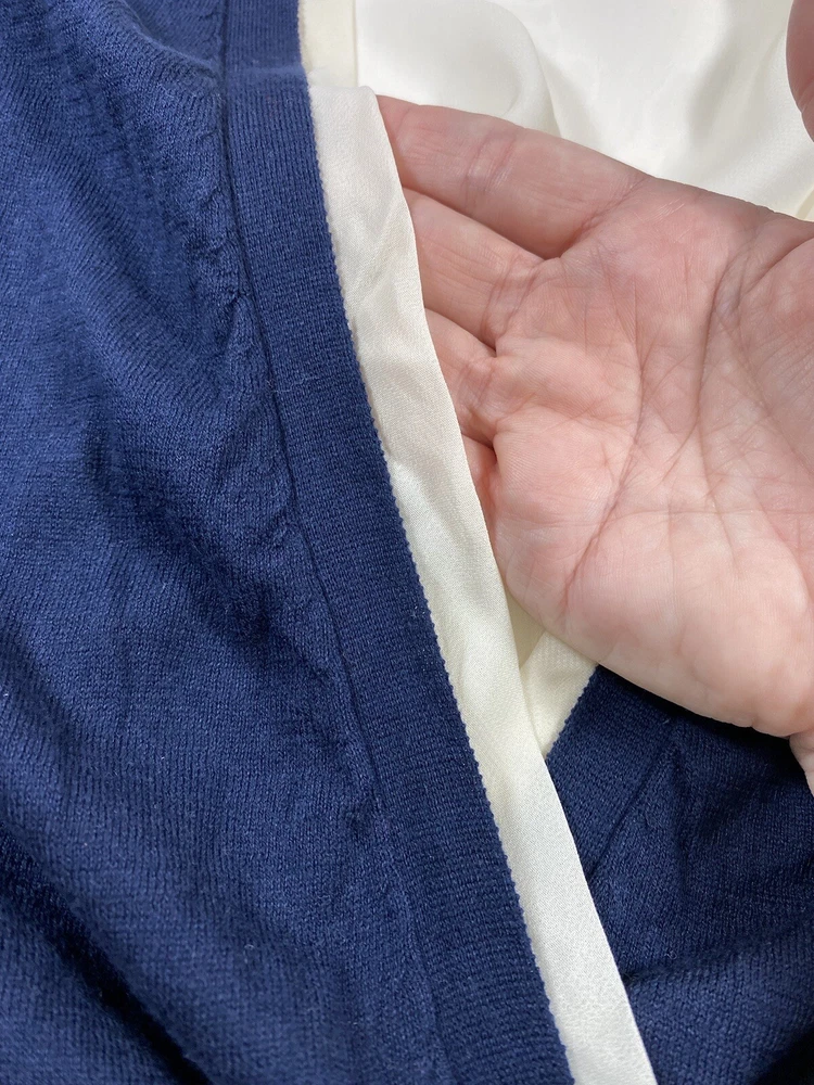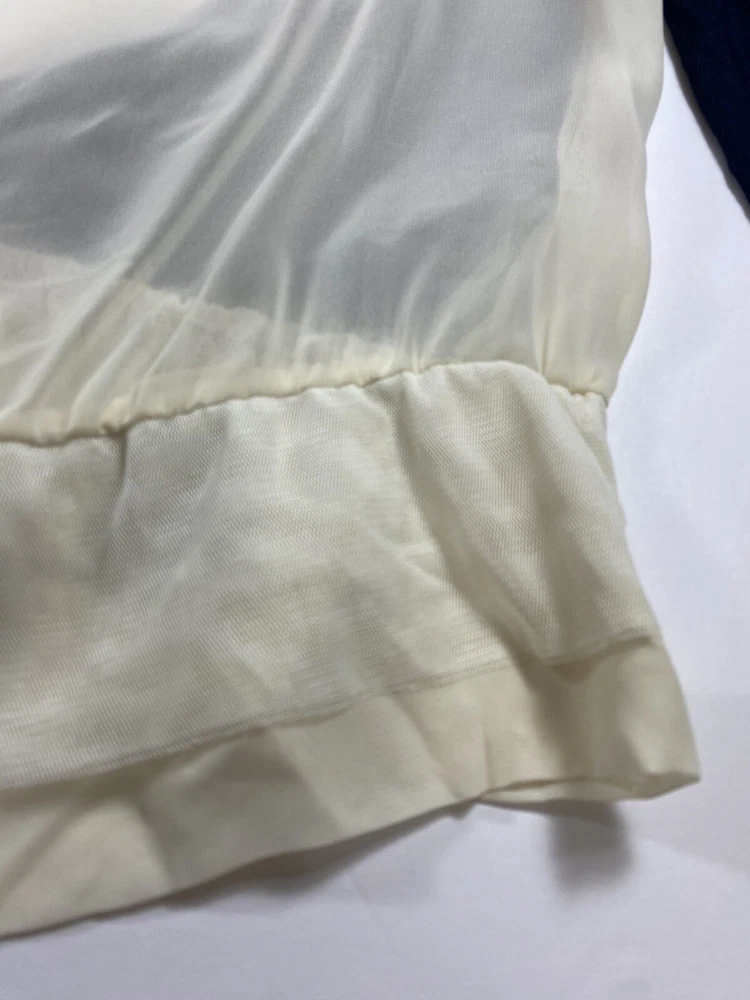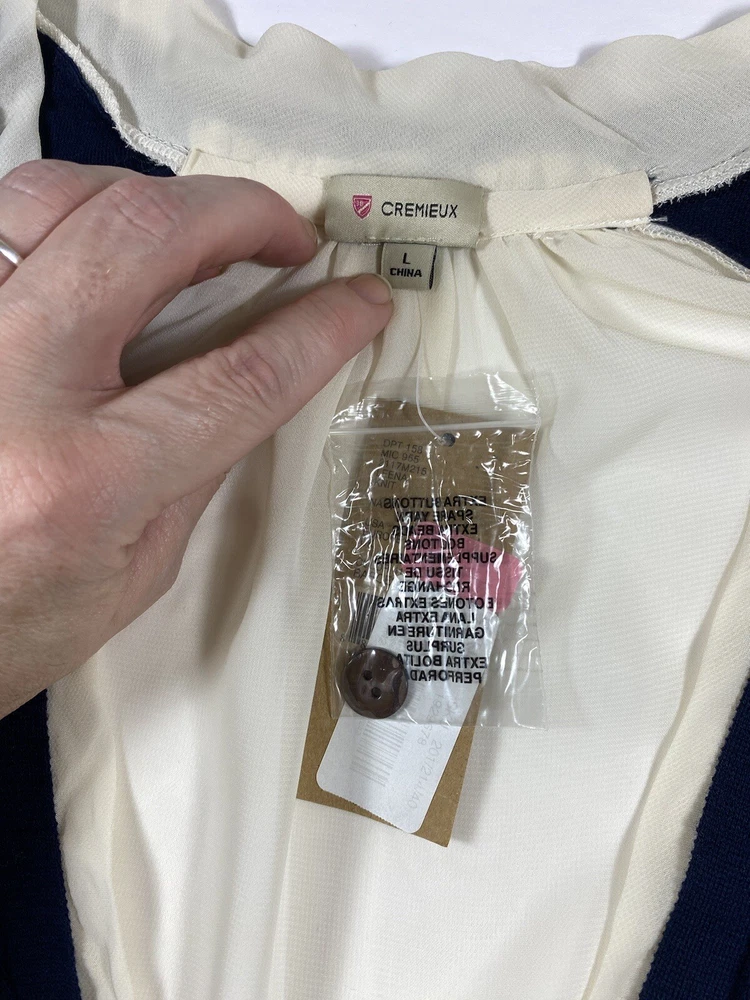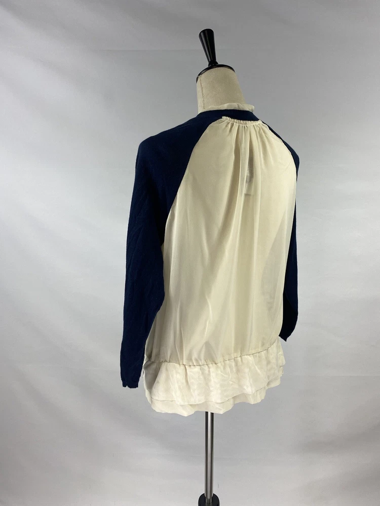 NWT Cremieux mixed media cardigan sweater in navy knit & cream chiffon V-neck, long sleeve, buttons at waist, sheer back with ruffle hem Fabric Content - Knit: 100% cotton, Chiffon: 100% polyester Care Instructions - Hand wash, flat dry See photos for condition - this is brand new with tags still attached, no flaws Size Large - See photos for measurements