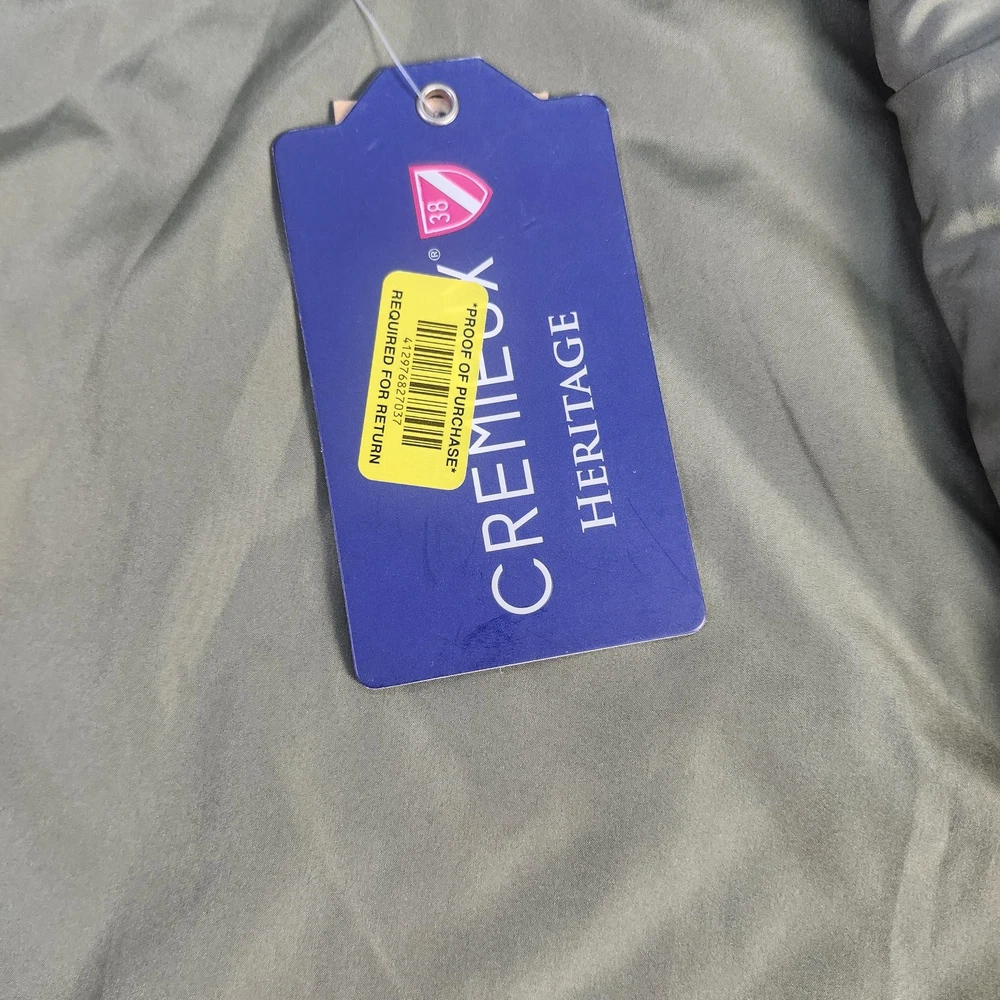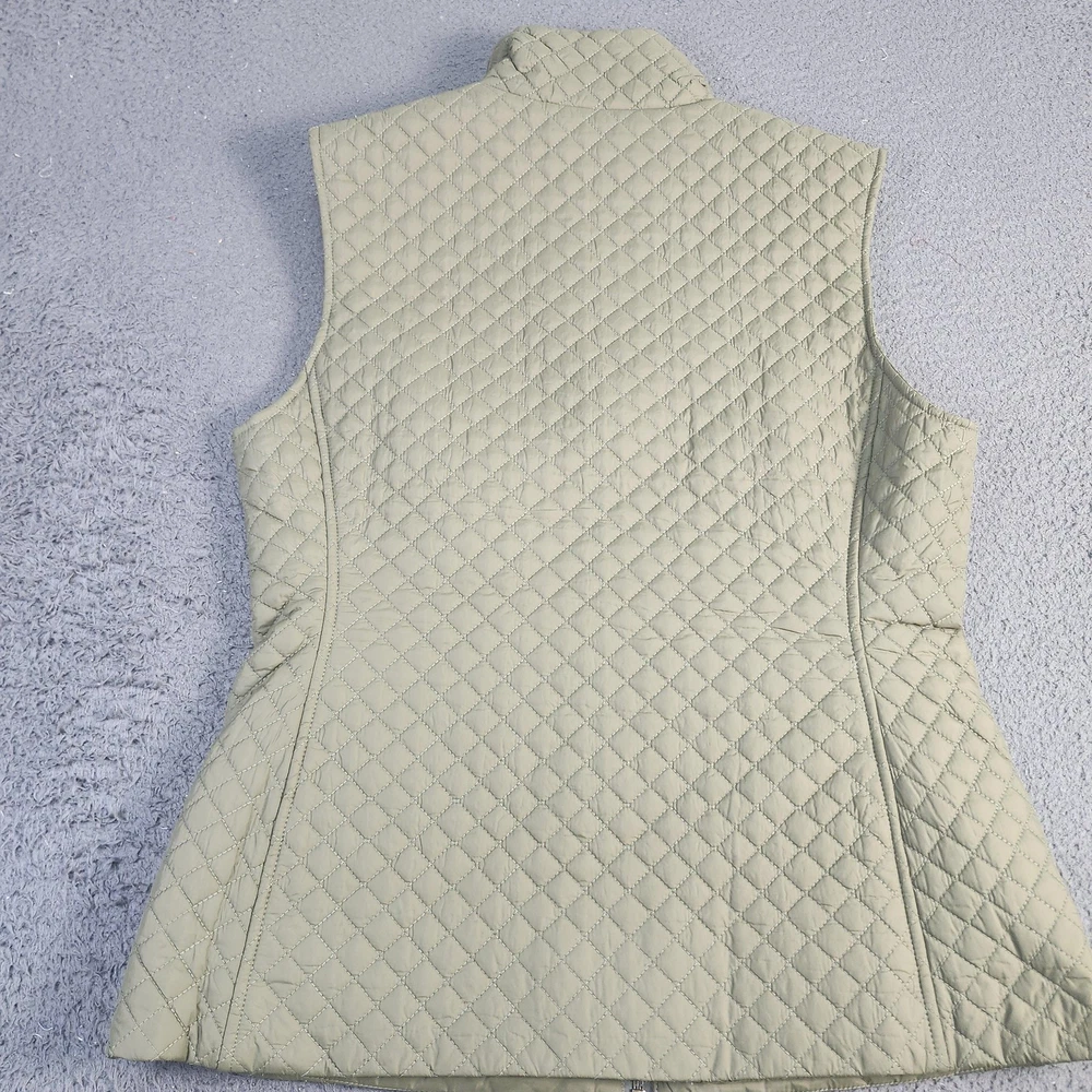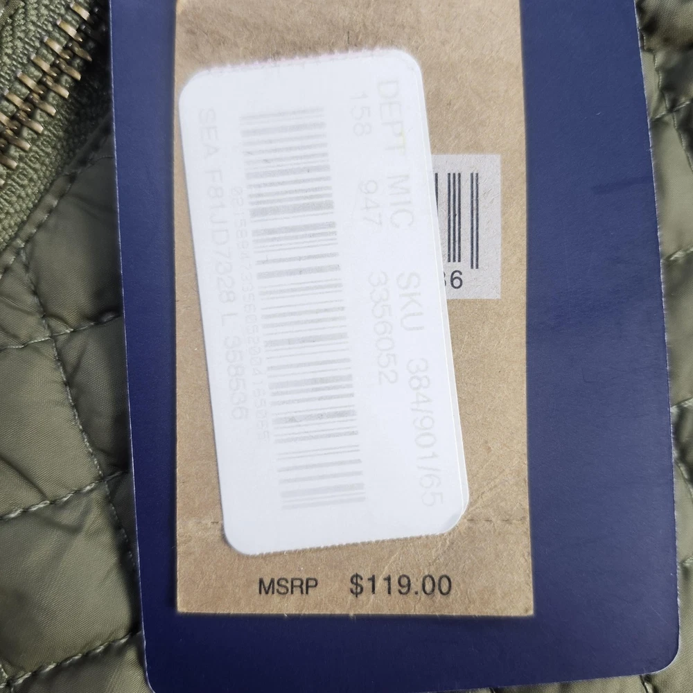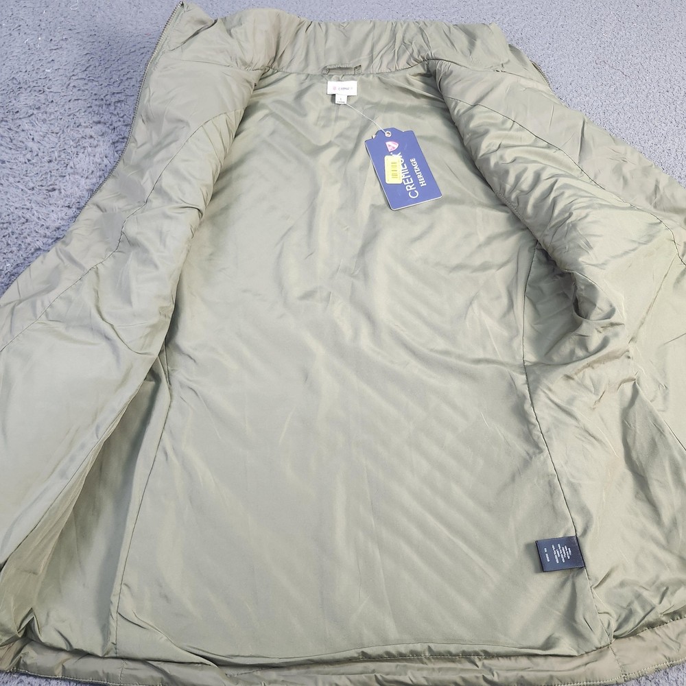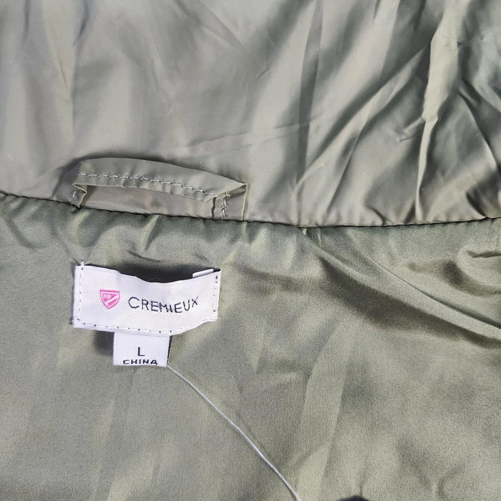 Brand: Cremieux. Style: Mens quilted insulated vest with stand-up collar and full front zip closure. Color: Green. Size: Mens Large (interior size tag reads L). Material: Shell 100% nylon; fiberfill 100% polyester; lining 100% polyester, as listed on the interior fabric content tag. Country of origin: China, as indicated on the interior label. Design details: Allover diamond quilted pattern, two large front patch hand pockets with angled openings, shaped side seams for a regular fit, and a straight hem. Branding and tags: Cremieux logo and wordmark at the interior neck label and Cremieux Heritage branded hang tag attached inside. Features and use: Lightweight padded layering vest with collared neckline, full zip front, and pockets, ideal for casual wear, travel, and layering in fall, winter, and early spring. Tag details: Interior tag lists RN 58903, and the hang tag shows Cremieux Heritage branding with an MSRP of $119.00.