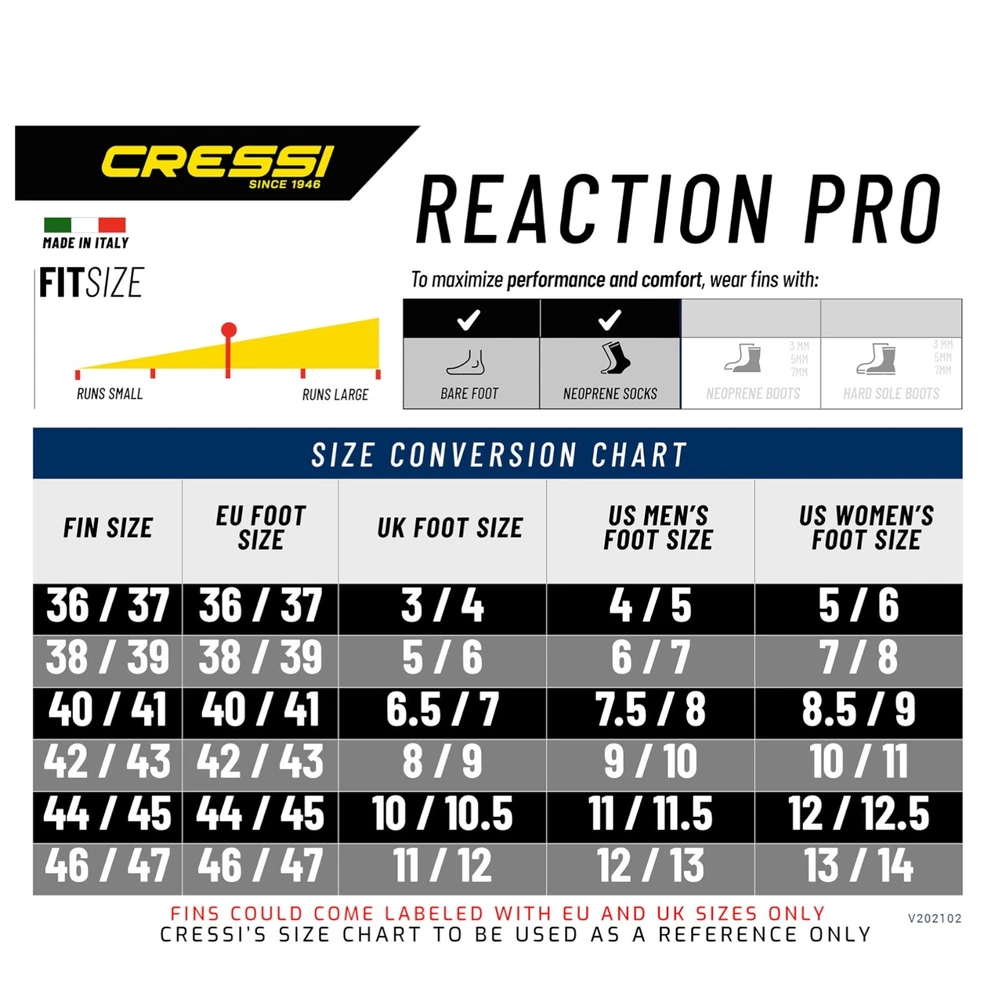 Cressi Sub Reaction Pro Full Foot Fins Scuba Diving Snorkeling BLUE or BLACK This great Cressi Sub Reaction Pro Full Foot Fins Scuba Diving Snorkeling BLUE or BLACK features: Suitable for scuba diving, free diving and snorkeling Variable thickness blade improves responsiveness Two-material blade design for precise blade control Blade extends from the top of the foot for 20% greater surface area Elastomer foot pocket material for secure, comfortable Non-slip foot pocket for traction on boat decks All the technical innovations of the open-heel Reaction fins, including three material molding technology and a variable thickness blade, are also available in this full foot fin powerful enough for scuba diving and comfortable for long days snorkeling. fin319 21.06.00 This is a fabulous price on a quality Cressi Sub Reaction Pro Full Foot Fins Scuba Diving Snorkeling BLUE or BLACK. Quality, versatility, and price - What more could you ask for? Contact us through eBay Messages with any questions. Listed Shipping Rates are valid as follows: F ed Ex Home and Express are available to ship to the 48 contiguous states; Fed Ex Smart Post to Hawaii, Alaska, or international may be available upon request (contact us for rates to your location). USPS is the only option if your address is an AA/AE/AP/DPO or to HI/AK/PR/GU/MH/VI/AS, etc. If this listing's default shipping is Fed Ex, we cannot ship by Fed Ex to a military address or to a US protectorate or territory. Please contact us or select the USPS option . I f your location is not listed please contact us for shipping options. International shipping rates vary according to your location. Please contact us for the best rates to your location. Orders of $50+ do not ship by first class international airmail. International Buyers – Please Note: Import duties, taxes, and charges are not included in the item price or shipping cost. These charges are the buyer's responsibility. Please check with your country's customs office to determine what these additional costs will be prior to bidding or buying. WE ARE NO LONGER SHIPPING BY USPS FIRST CLASS INTERNATIONAL AIRMAIL TO BRAZIL / RUSSIA / TURKEY / CHILE / PERU / ARGENTINA AND WE ONLY SHIP EXPRESS MAIL INTERNATIONAL TO MEXICO. While we try to offer the fullest and most economical shipping methods possible, First Class International Airmail does not offer tracking or insurance. Our extensive shipping experience has lead us to suspend airmail shipping to these countries due to the extraordinarily high rate of package loss and delayed delivery reported for airmail service to this country. We only ship by expedited FedEx or USPS for international packages that are $50.00 and over. Airmail shipping is not available for orders over $50. WE SHIP EVERY WEEK DAY! CONTACT US FOR FASTER SHIPPING RATES. We provide a customer satisfaction return policy. Shipping and Return Policy All exchanges or refunds must be return postmarked within 14 days of arrival date. Item(s) must be in original condition (new, no tear, no odors, etc). Customer must provide original invoice and RA#. CA shipments to pay current California state sales tax. FOR RETURNS ON NEW OR USED ITEMS: Returns are for item value and will NOT include shipping and handling costs. PLEASE Contact us with any questions. Multiple winning bids will be combined to save on shipping. Winning bidder will be extremely happy with our quality product(s) and our FAST QUALITY customer service!!! We accept Visa, Mastercard, American Express, Discover, and PAYPAL. Be sure to vist our eBay STORE: HOUSEOFSCUBA to view all our items. If shipping Fedex Ground, they do not ship to P.O. Boxes, we need your telephone number, and it is only to the 48 contiguous States. Rates for insurance are as follows: $1.70 = $50 of insurance, $2.70 = $100, $3.90 = $200, $5.10 = $300, $6.20 = $400, $7.20 = $500, if more, email for details. We will ship internationally, but rates will vary. Payment I accept the following forms of payment: PayPal Visa/Master Card, American Express, Discover Powered by SixBit's eCommerce Solution
