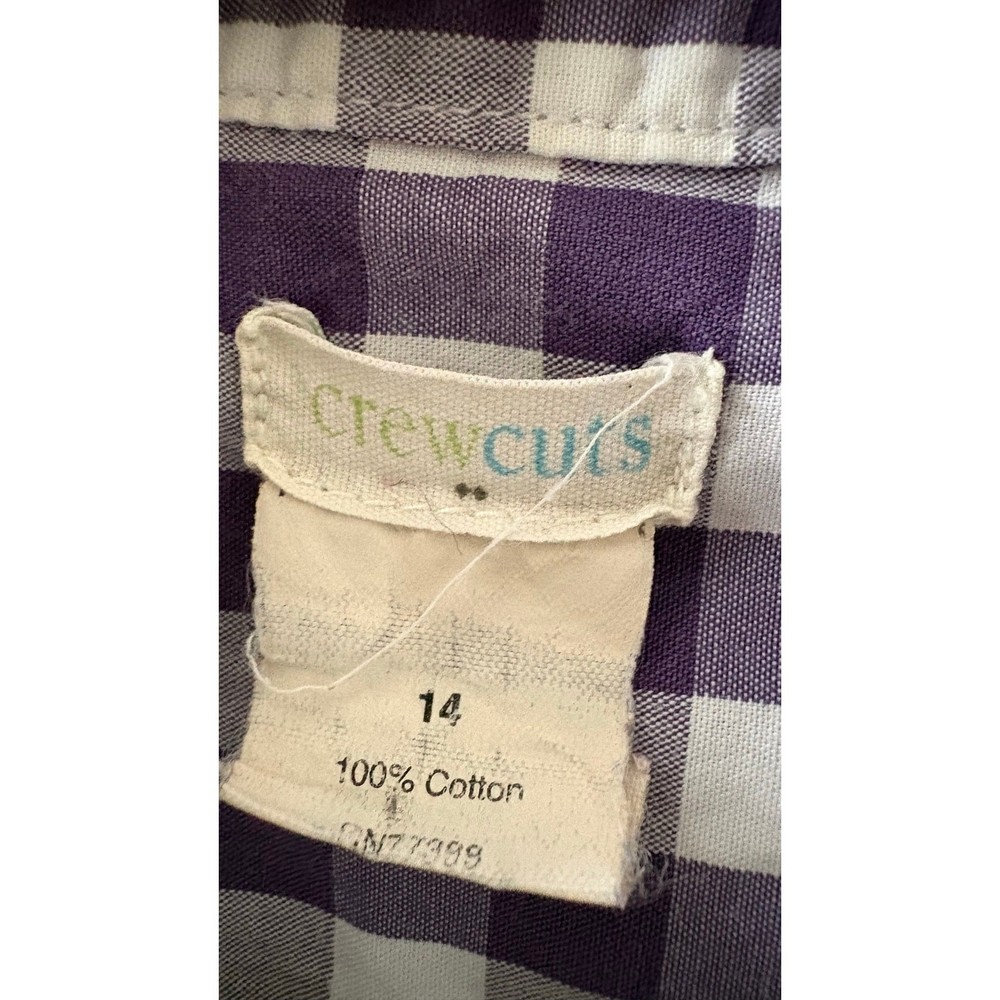 Discover this fantastic J.Crew Crewcuts button-down shirt, perfect for your young one! This stylish top features a charming purple and white gingham check pattern, making it an excellent choice for Easter, spring events, or any occasion where a touch of preppy style is desired. Crafted from 100% cotton, it offers both comfort and breathability for all-day wear. It's pre-owned and in good condition, showing no stains or holes, ready for its next adventure! This shirt is a boy's size 14. For an accurate fit, please note the approximate measurements: 19 inches from armpit to armpit and 26 inches in length. A wonderful addition to any wardrobe!