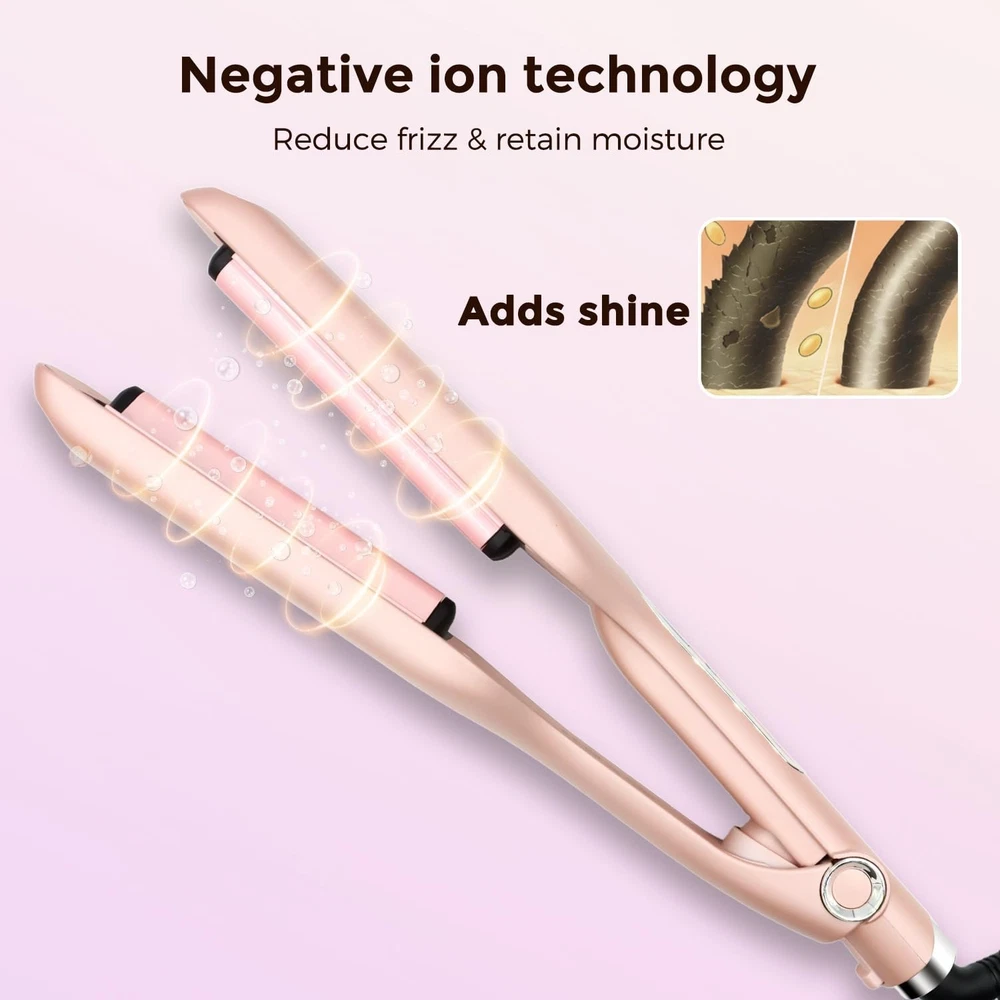 Crimper Curling Iron, 2 Barrel Hair Waver Anti-Scald, 5/8 Inch Rapid Heating Curler, 16 MM Wave Iron, Temp Adjustable Wand for Mid-Length and Long Hair Product Details Product Benefits: Protects hair and saves time with rapid heating Brand: Lam(MS)pen Hair Type: All Power Source: Corded Electric Heater Surface Material: Ceramic Product Dimensions : 13.78 x 2.36 x 2.36 inches; 1.12 Pounds Date First Available : March 17, 2025 Manufacturer : Lam(MS)pen Best Sellers Rank: #227,890 in Beauty & Personal Care (See Top 100 in Beauty & Personal Care) #54 in Hair Waving Irons #54 in Hair Waving Irons Customer Reviews: 4.2 4.2 out of 5 stars 14 ratings Ceramic Hair Iron:The surface of the hair crimper is ceramic coated, which will add shine and moisture to the hair. Minimizing your hair damage problems. Even heat distribution helps smooth frizz. Makes hair look healthier Anti-scald Design: The top of the wave curling iron has an anti-scald design that protects your fingers from being burned during curling. The 360-degree swivel cord allows you to operate the hair curler from any angle. You can lock the hair waver to save the space when storing Adjustable Temperatures:14 adjustable temperatur for all hair types. 212F/338F is suitable for fine and soft hair, 374 F/410F for normal hair and 446 F for thick hair. Tap the power button to add the temperature Easy to Use: This crimper hair iron will help you curl your hair effortlessly. Even inexperienced people can create beautiful waves with this curling iron. Just place the hair on the splint, press and hold, repeat it and you will get stunning daily waves with just one clamp Fast Heating: The french wave curling iron is used PTC heater with fast heat up, saving your waiting time.