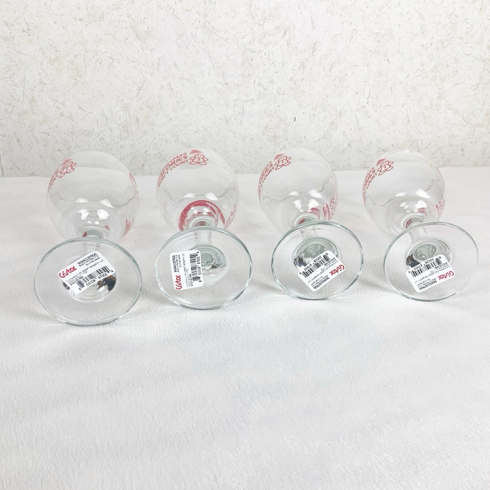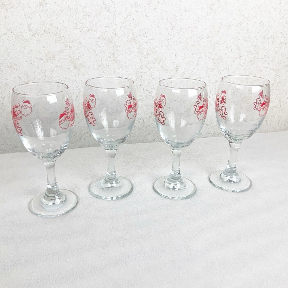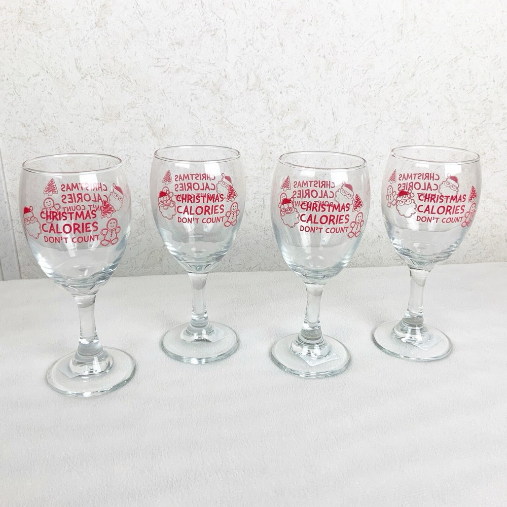 Brand new with tags on the bottom Cristar Set of 4 wine glasses Has Christmas calories don’t count written in red with Santa and gingerbread man 10 oz