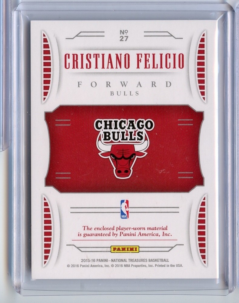 The product is a 2015-16 Panini National Treasures trading card featuring basketball player Cristiano Felicio from the Chicago Bulls. This particular card is a Rookie Jumbo Materials Prime version, with a limited edition of 10 out of 25 produced. The card showcases a piece of memorabilia from Felicio's rookie season, making it a sought-after collectible for fans and collectors alike. Being an original release by Panini America, Inc., this card represents a valuable addition to any sports trading card collection.