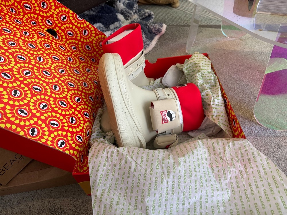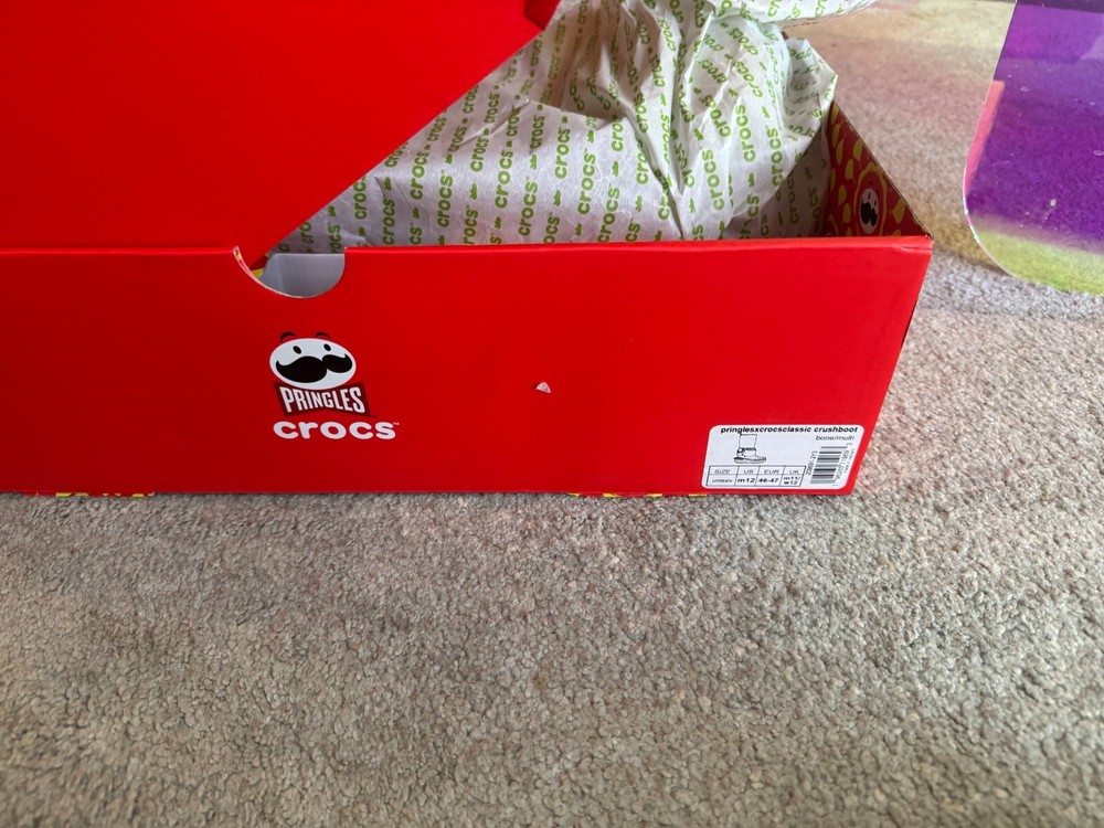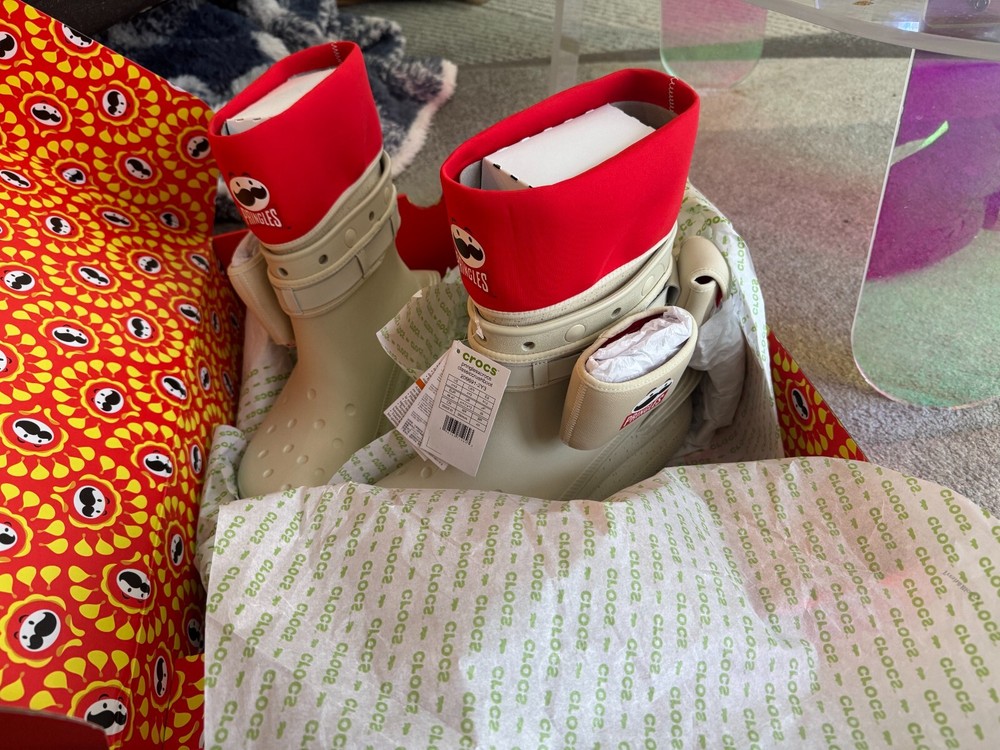 Crocs presents the Croc X Pringles classic crush boot in size US 12. These beige booties feature a unique collaboration with Pringles, known for their iconic packaging. The boots are made of polyurethane and are designed to withstand rainy conditions. Perfect for men looking to add a fun and stylish touch to their footwear collection.